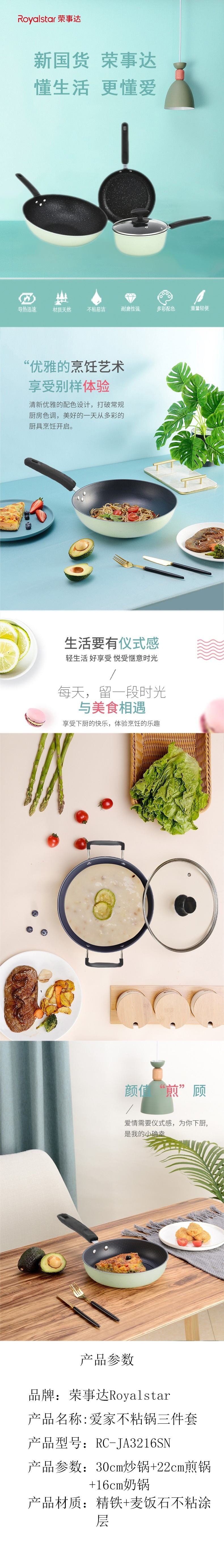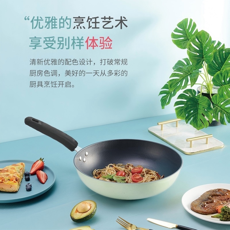 精选优质铁基材,锅体采用独特工艺一次模压成型;独特造型优雅大方,尽享时尚烹饪生活;高级不粘涂层,省油少烟,光洁易亮,耐腐蚀