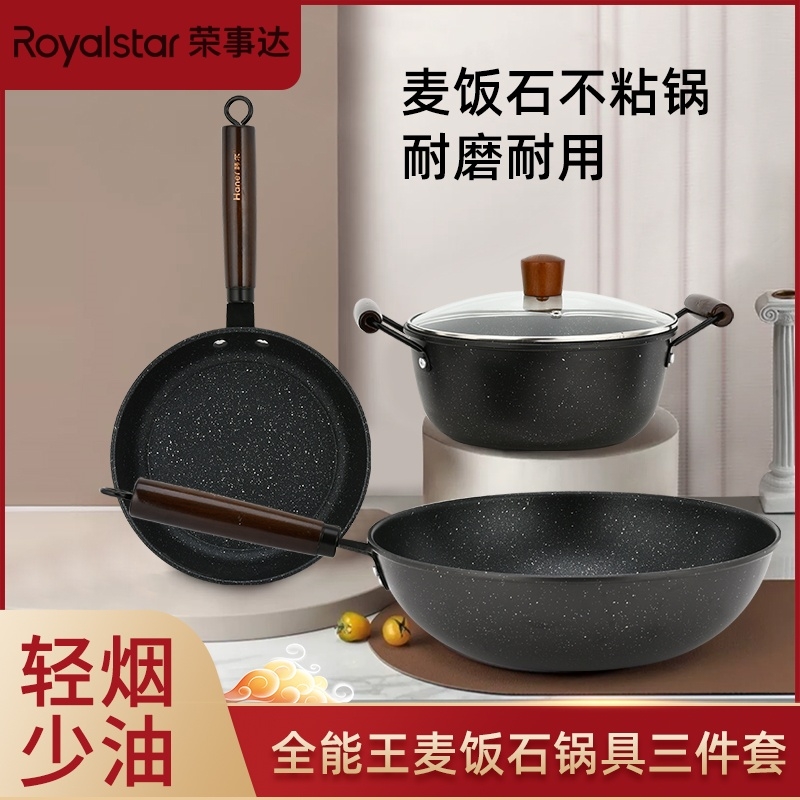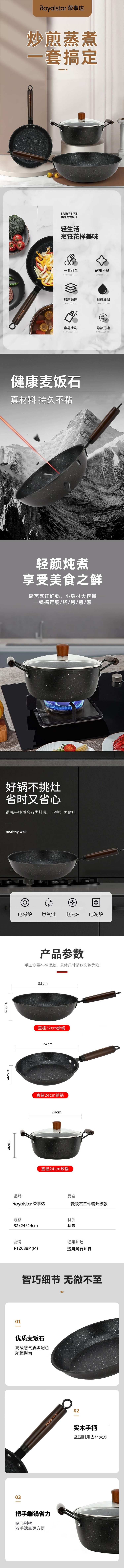 配可视防爆浮法加厚玻璃;产品为精铁麦饭石高温熔喷工艺;3锅1盖完成厨房组合,锅具适合所有炉具
