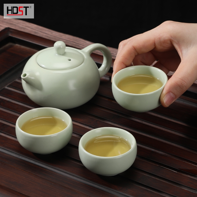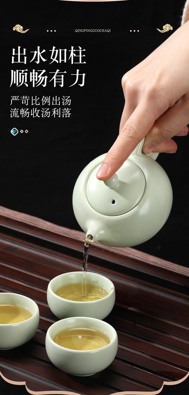 功夫茶具,办公室、家用都适宜;定窑出品,西施壶配罗汉杯,天青色;釉质细腻,温润如玉,出水顺畅,有效过滤
