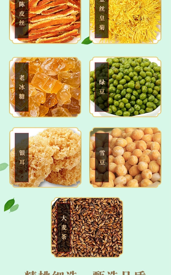配置清单:陈皮丝20克*1袋 金丝皇菊20克*1袋 老冰糖350克*1袋 绿豆200克*1袋 银耳25克*1袋 雪豆250克*1袋 大麦茶300克*1袋