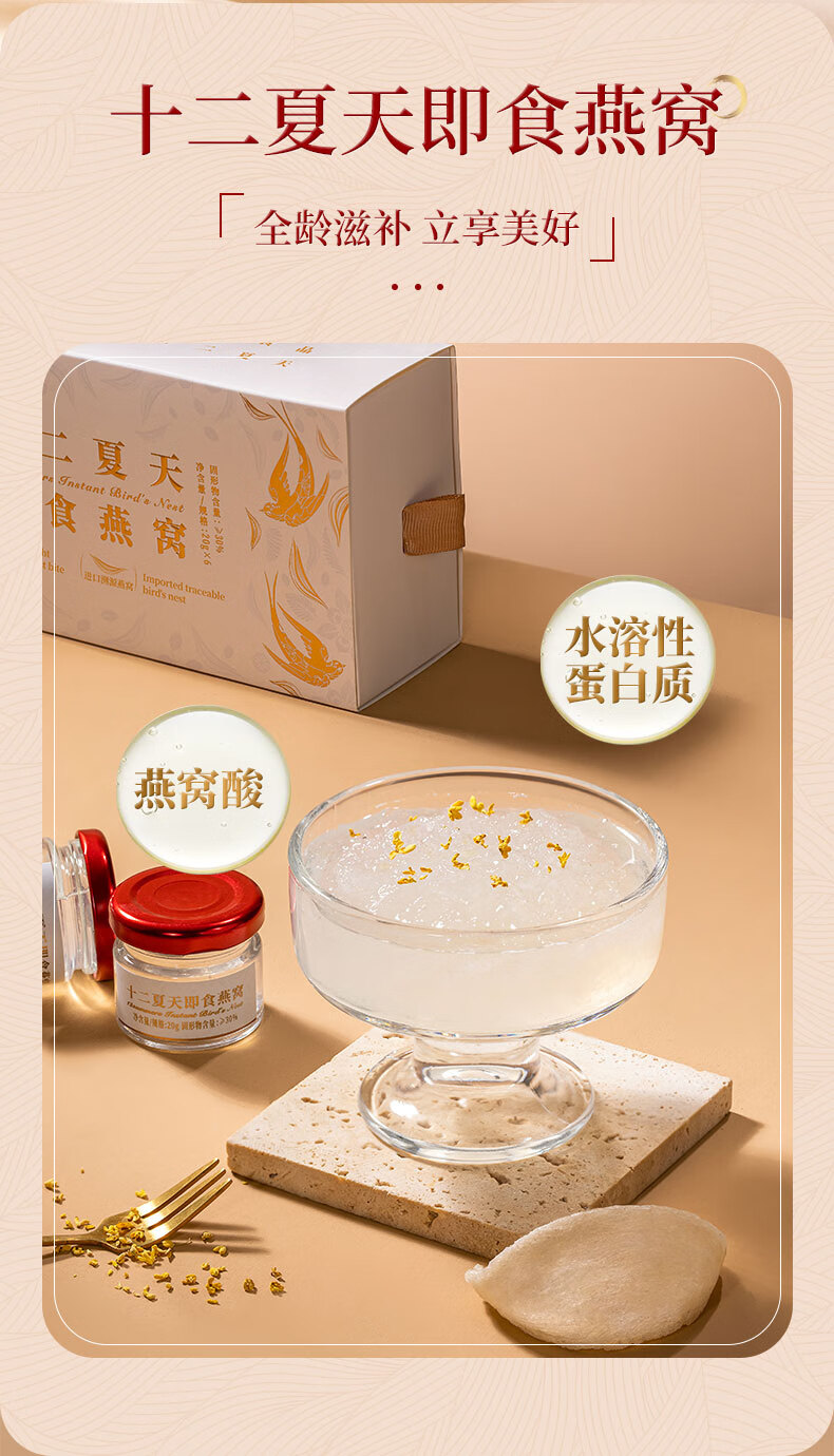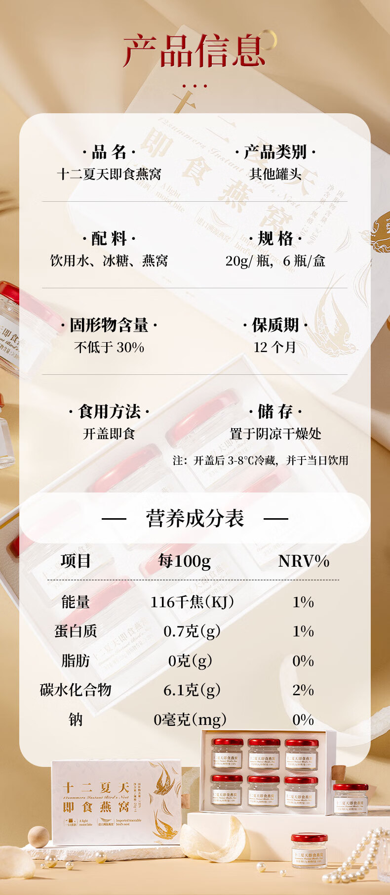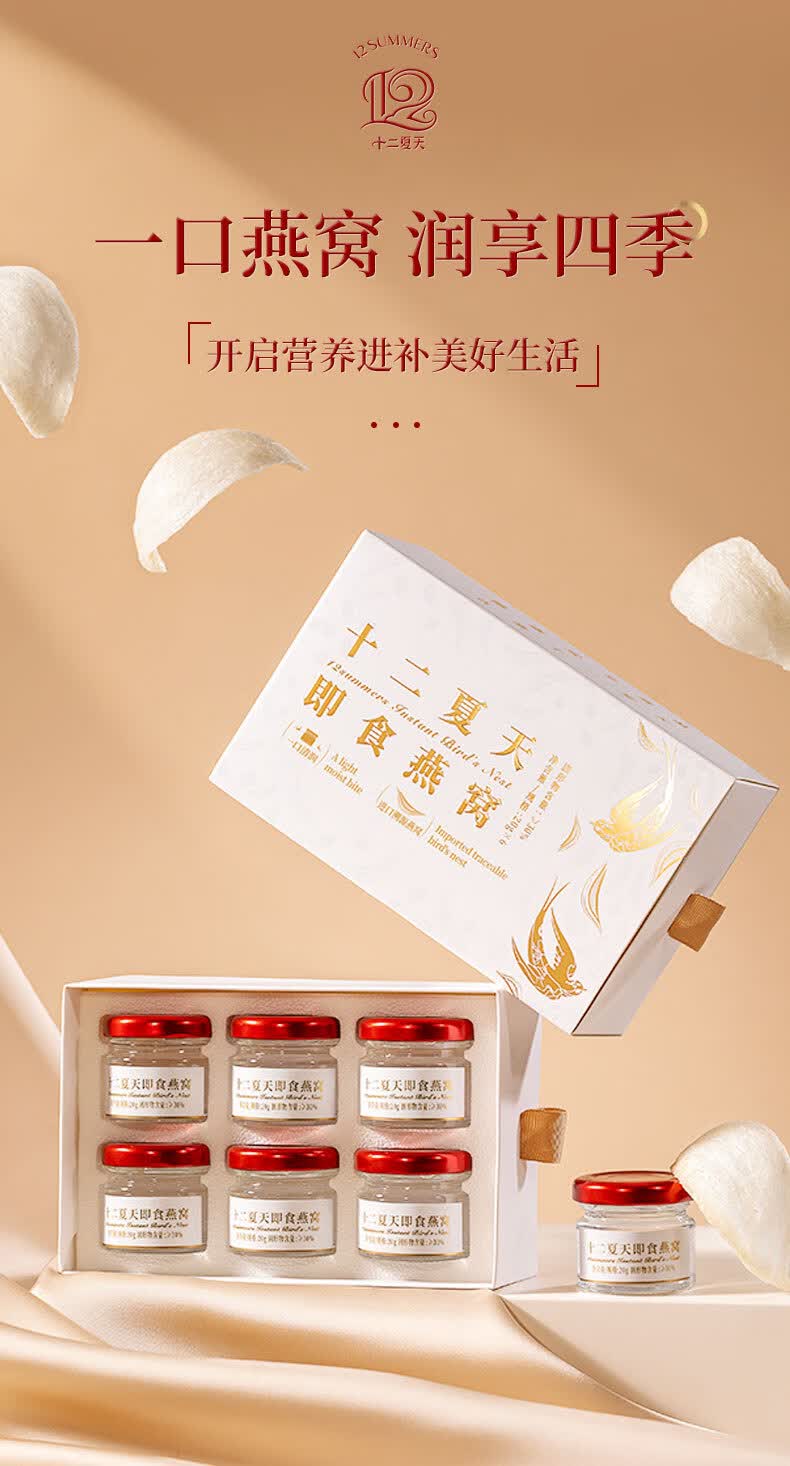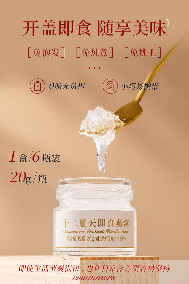 免泡发、免炖煮、免挑毛,开盖即食;一盒6瓶装,每瓶20g,精致小巧易携带;每天一小瓶,随时随地轻松润养
