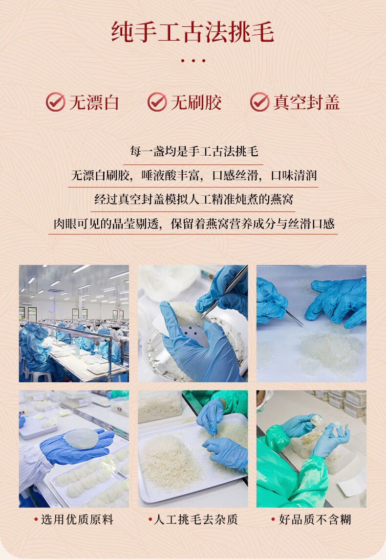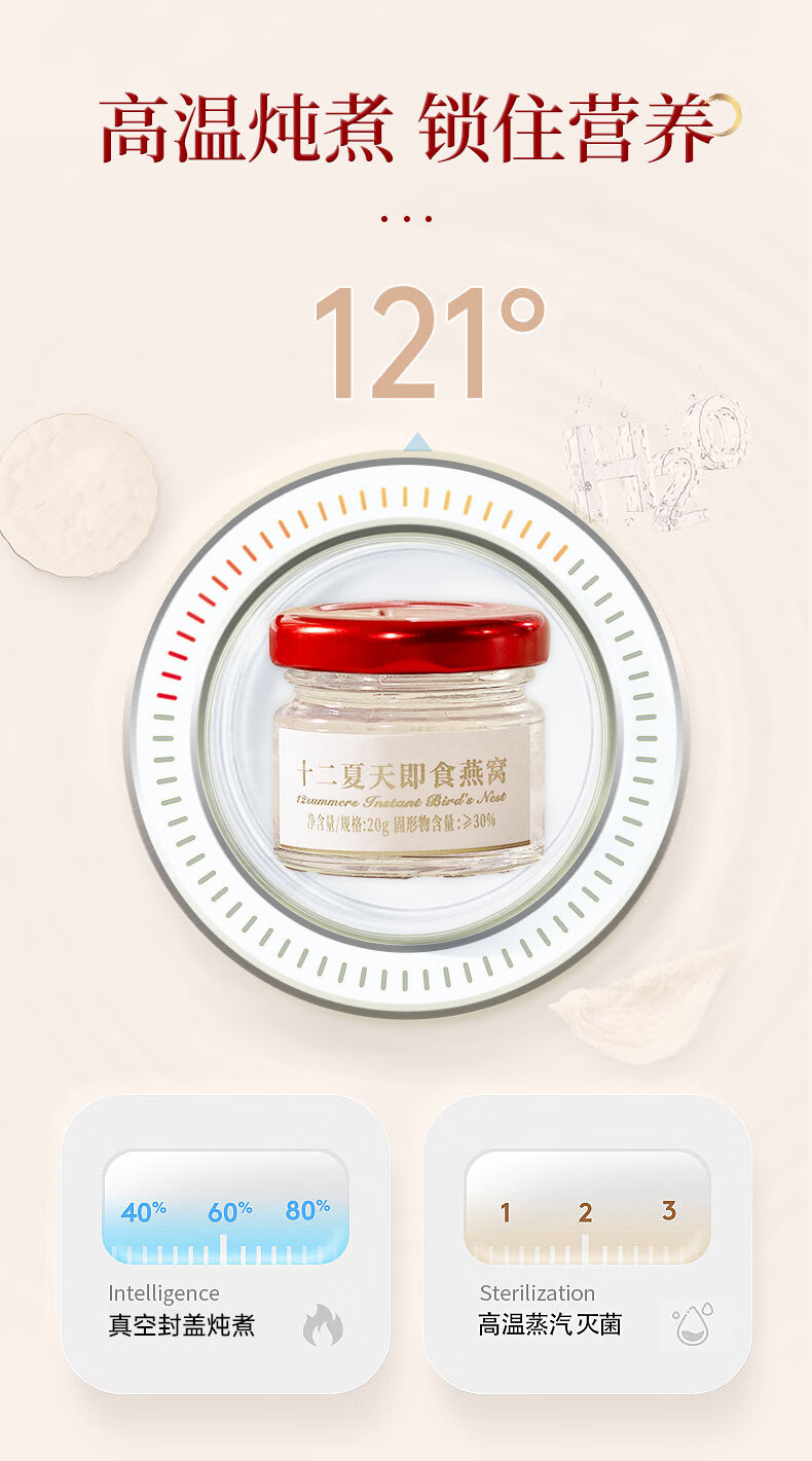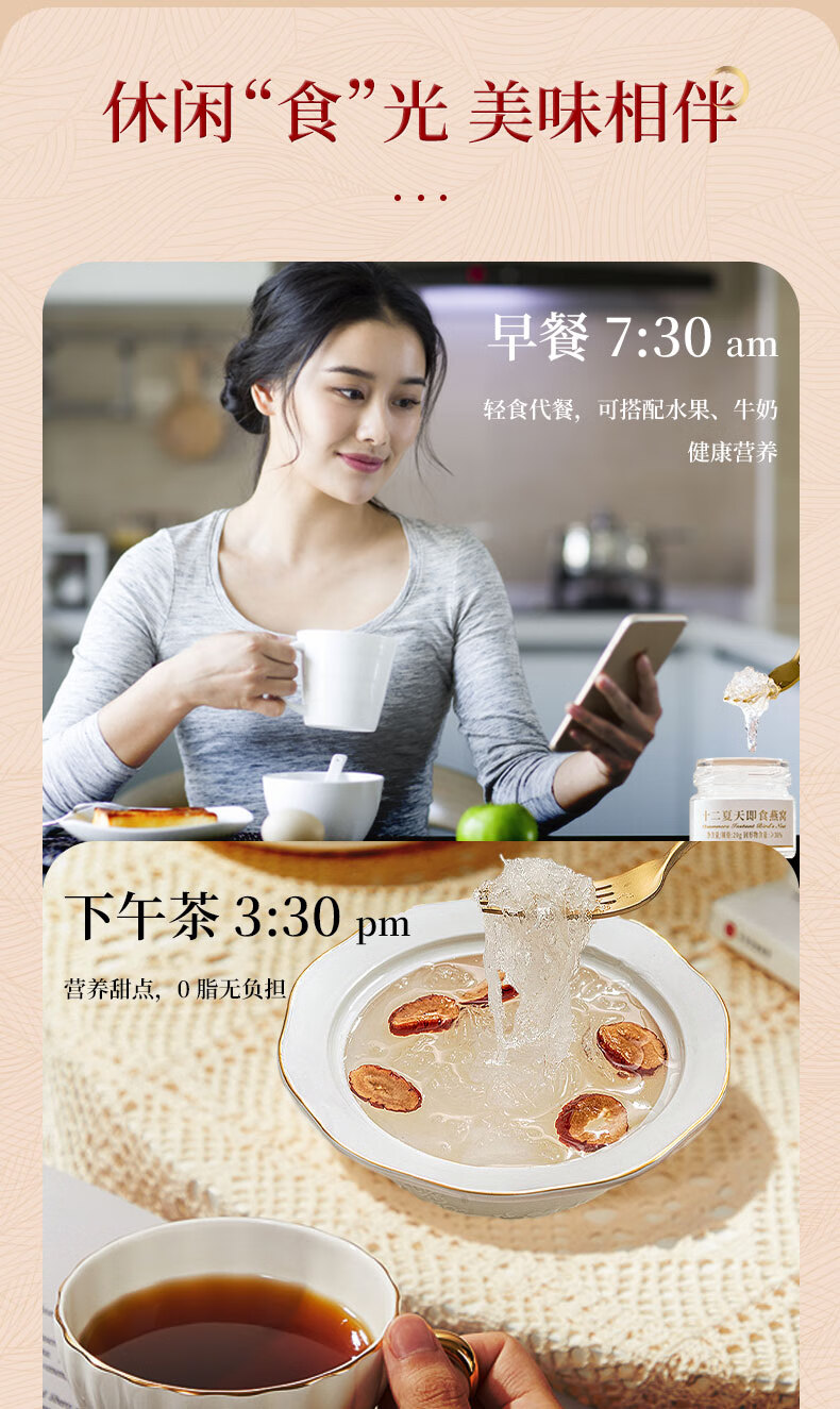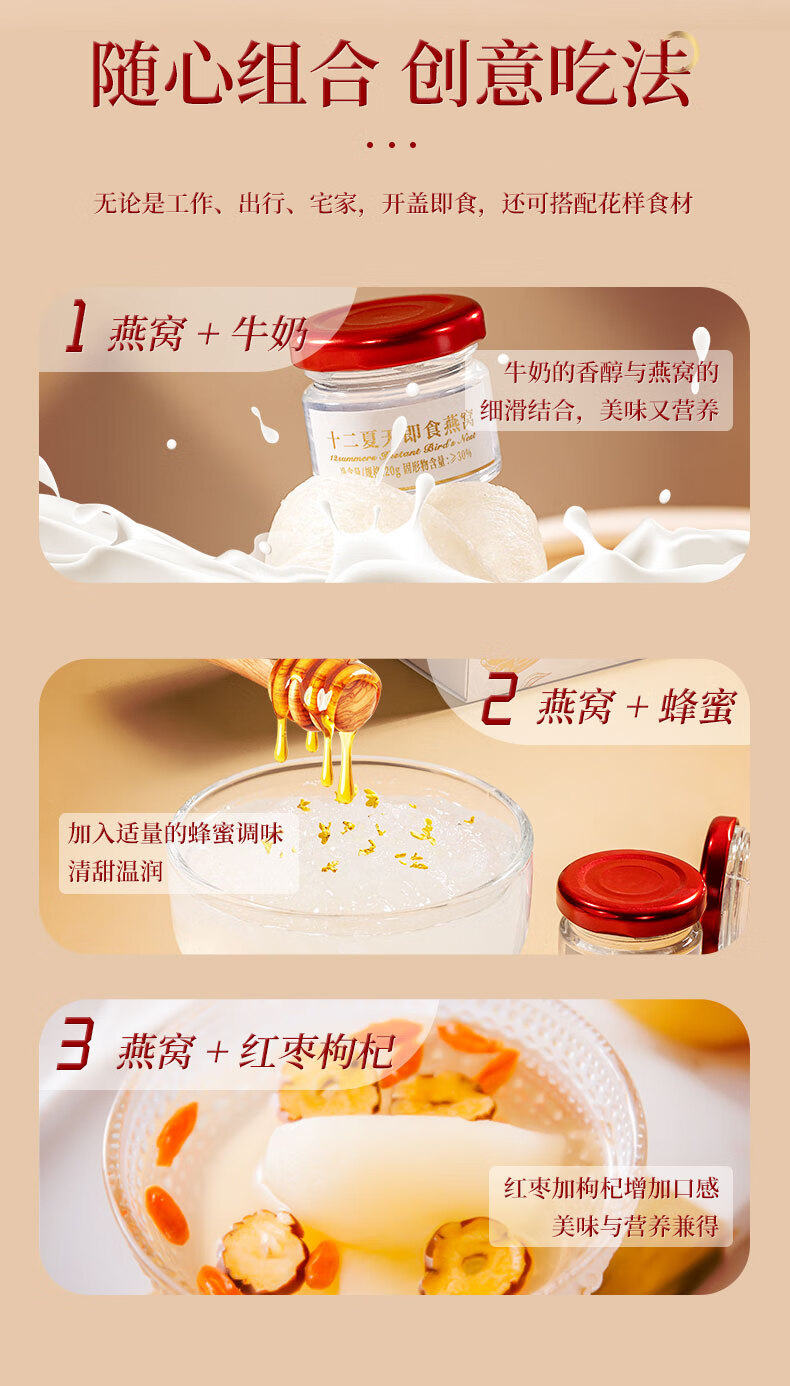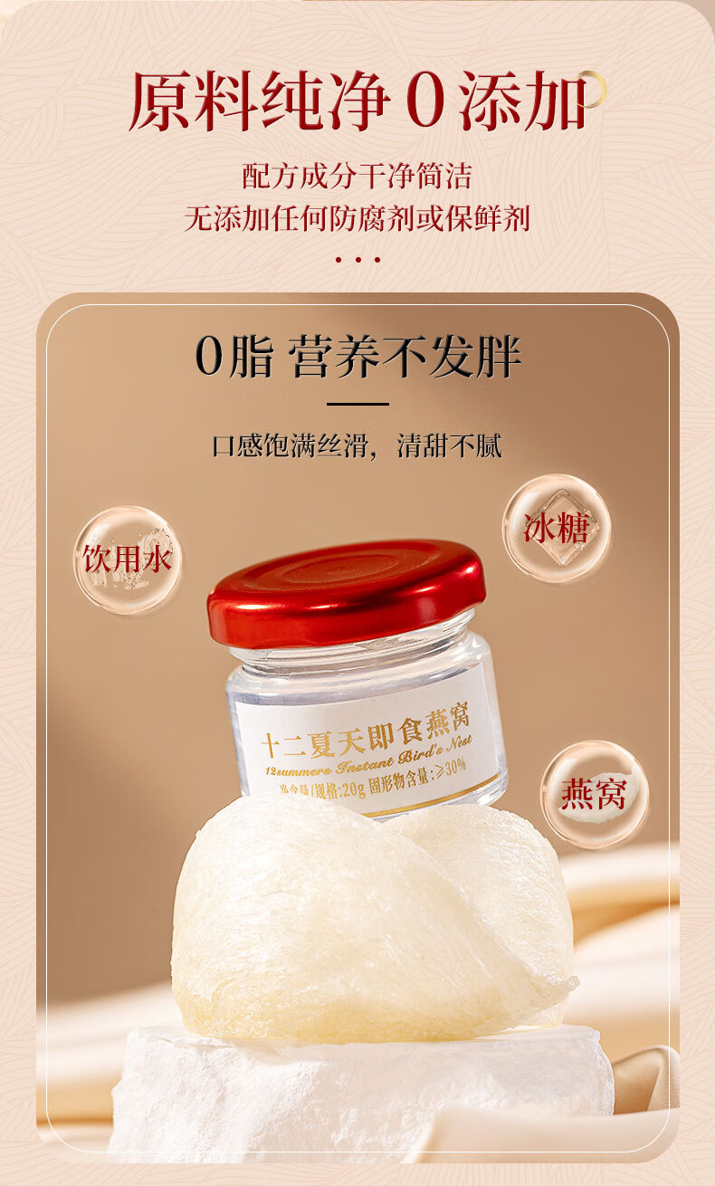 免泡发、免炖煮、免挑毛,开盖即食;一盒6瓶装,每瓶20g,精致小巧易携带;每天一小瓶,随时随地轻松润养