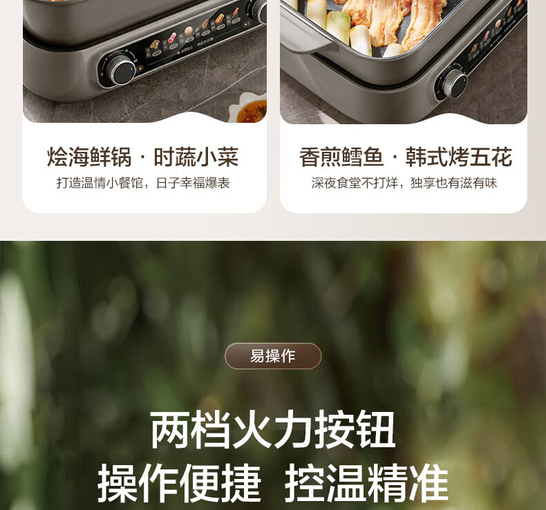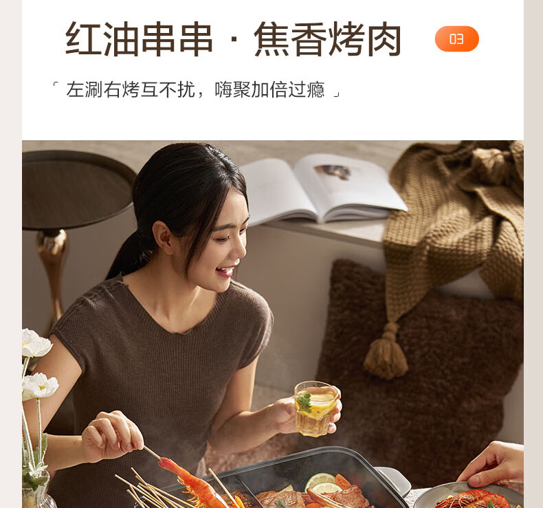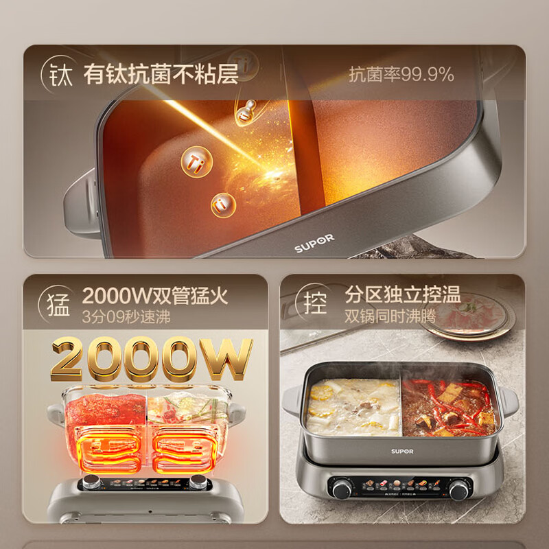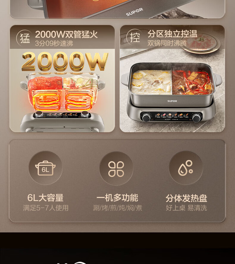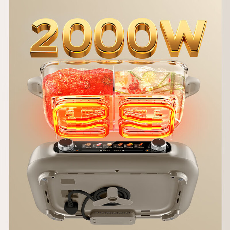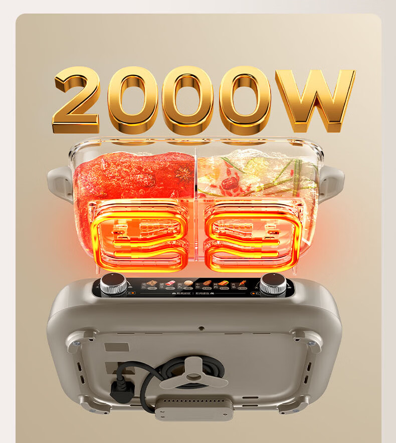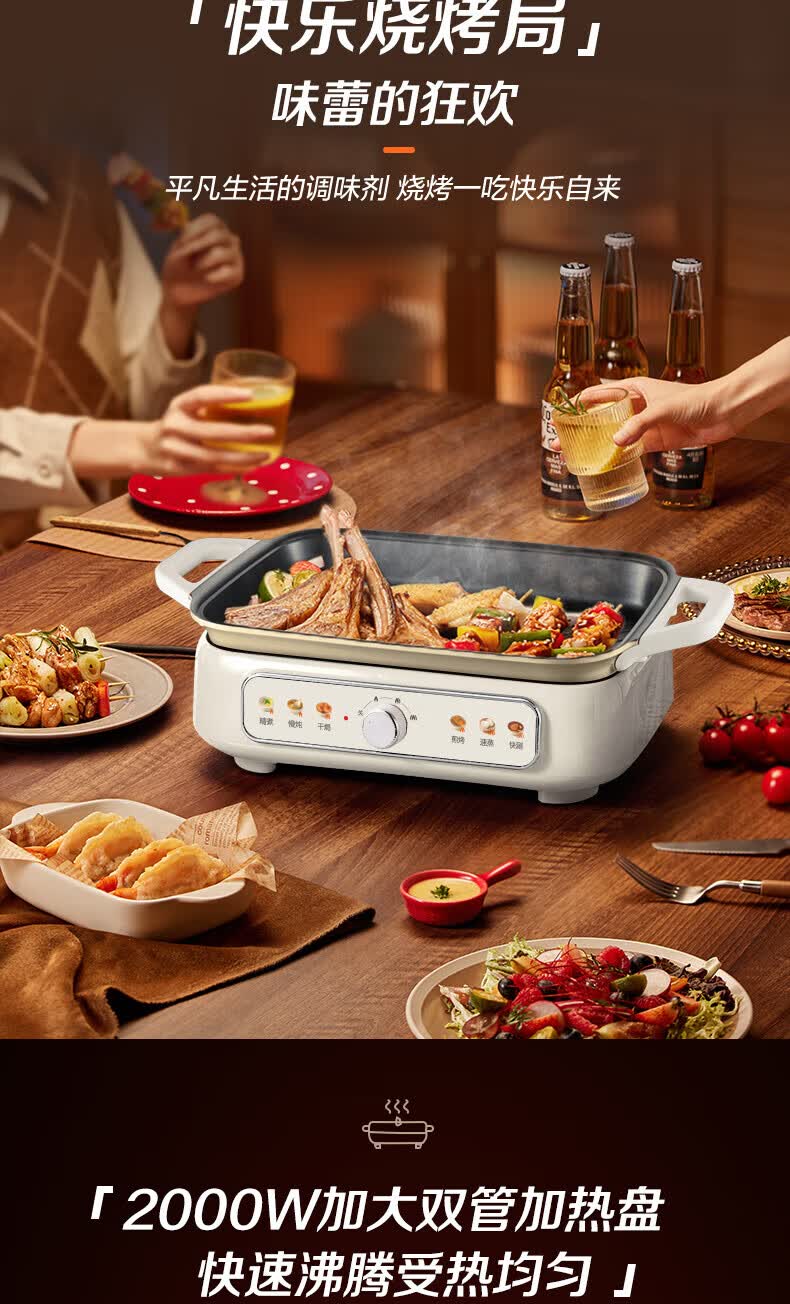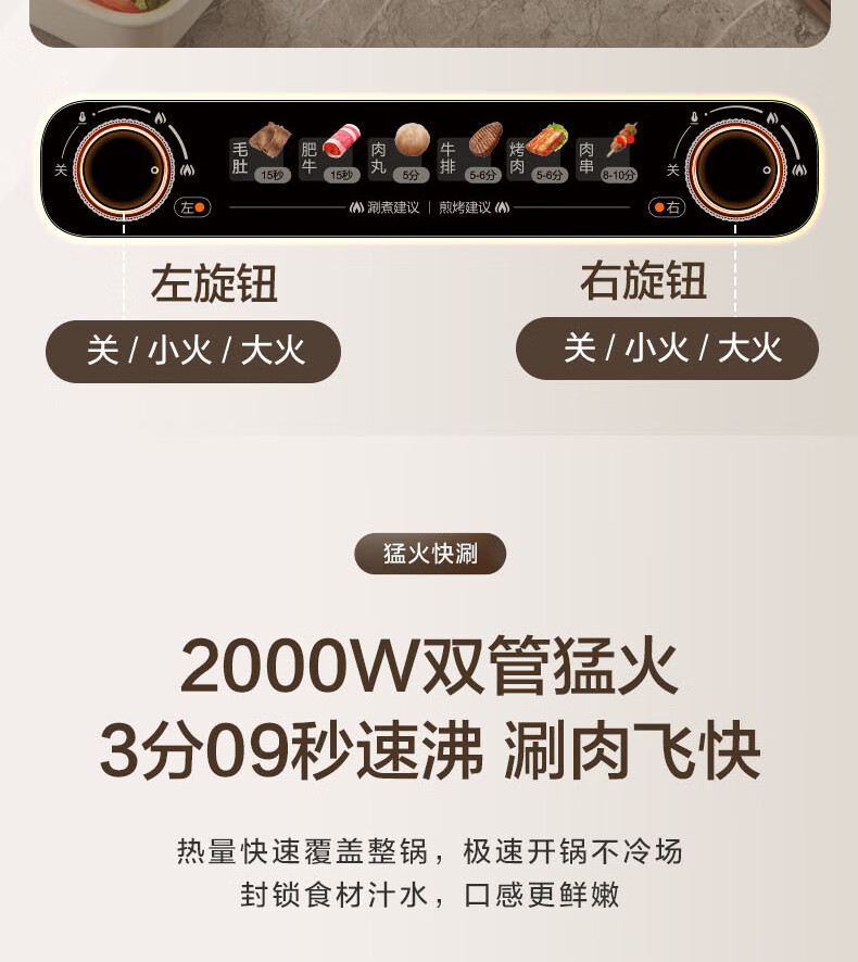 煎烤涮煮炖多功能;2000W猛火快涮;二重贴心安全保护