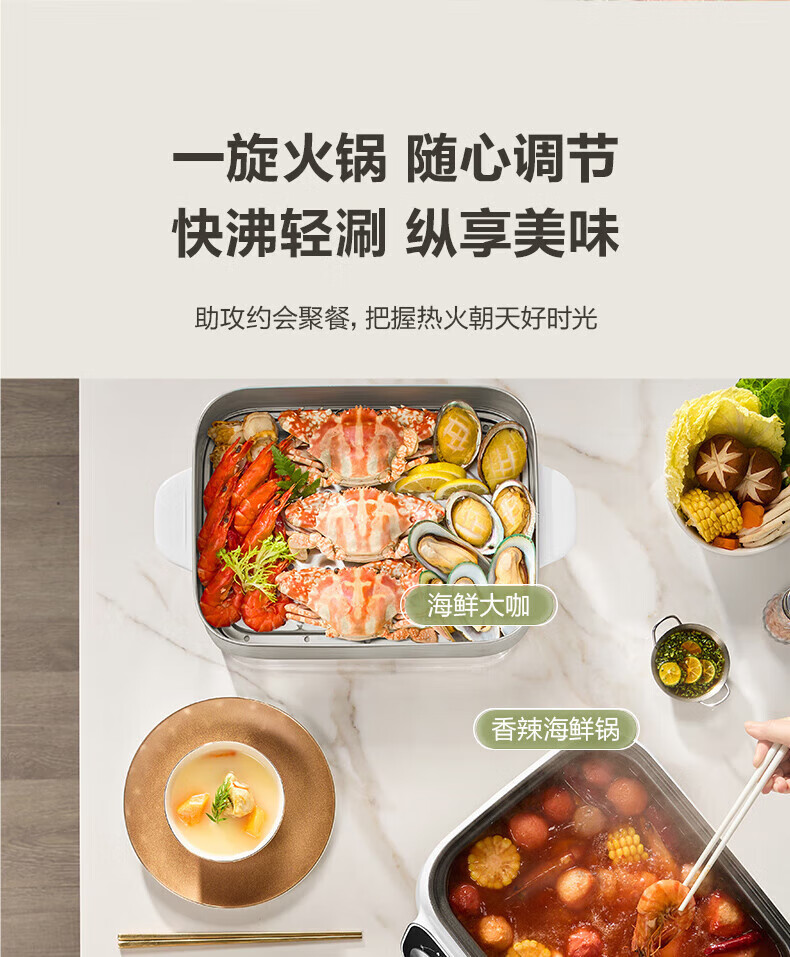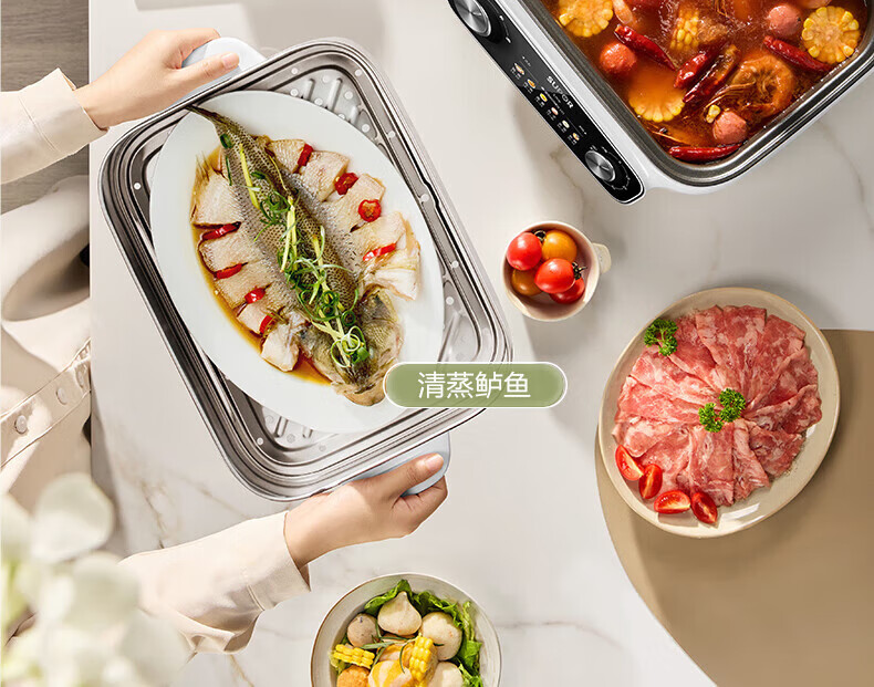 电热火锅功能:蒸,煮,炖,焖,火锅