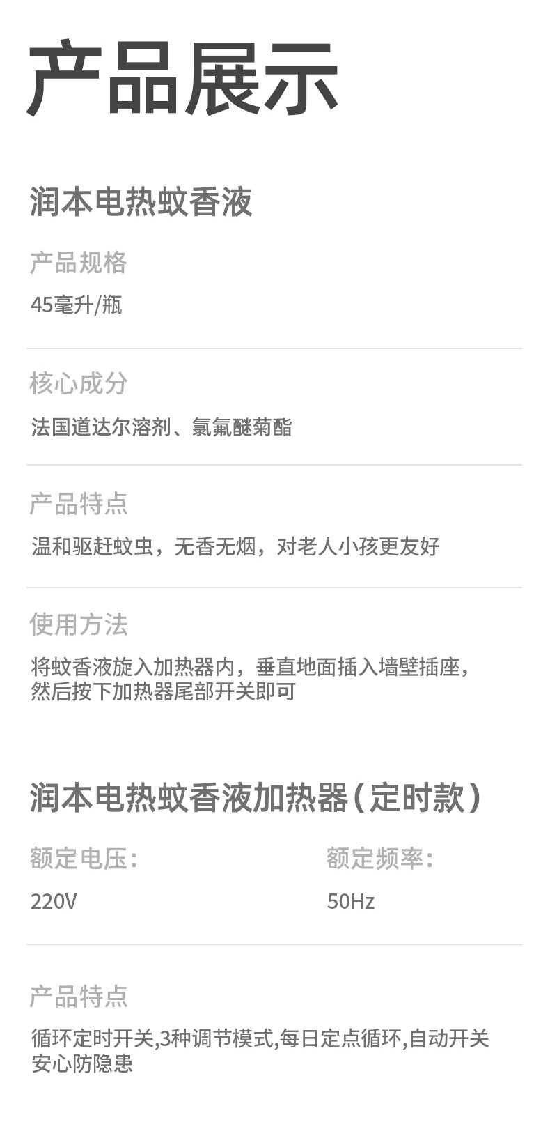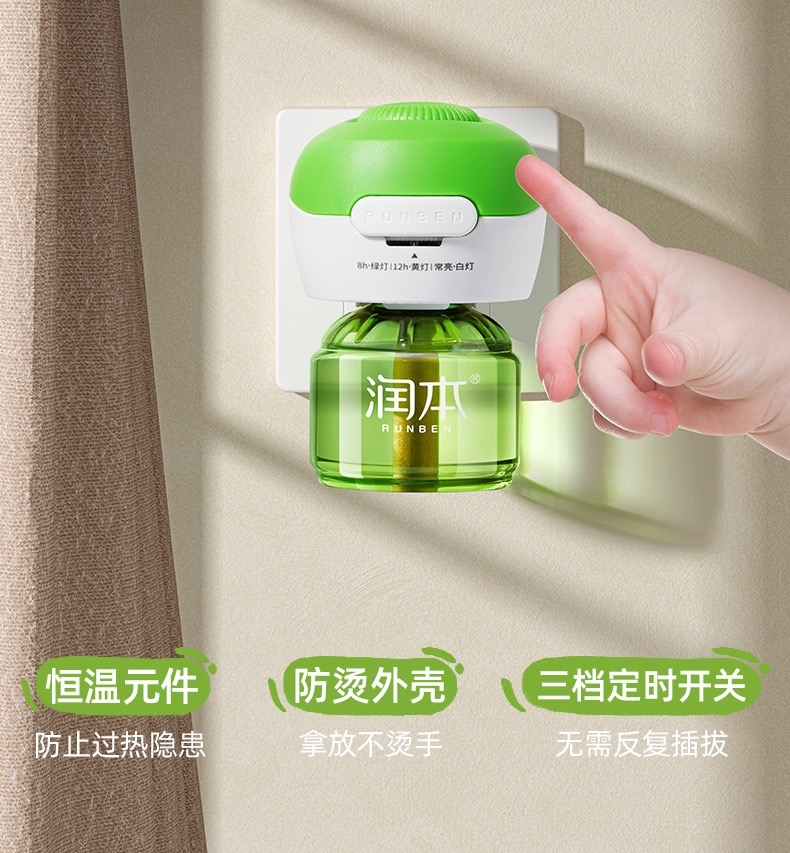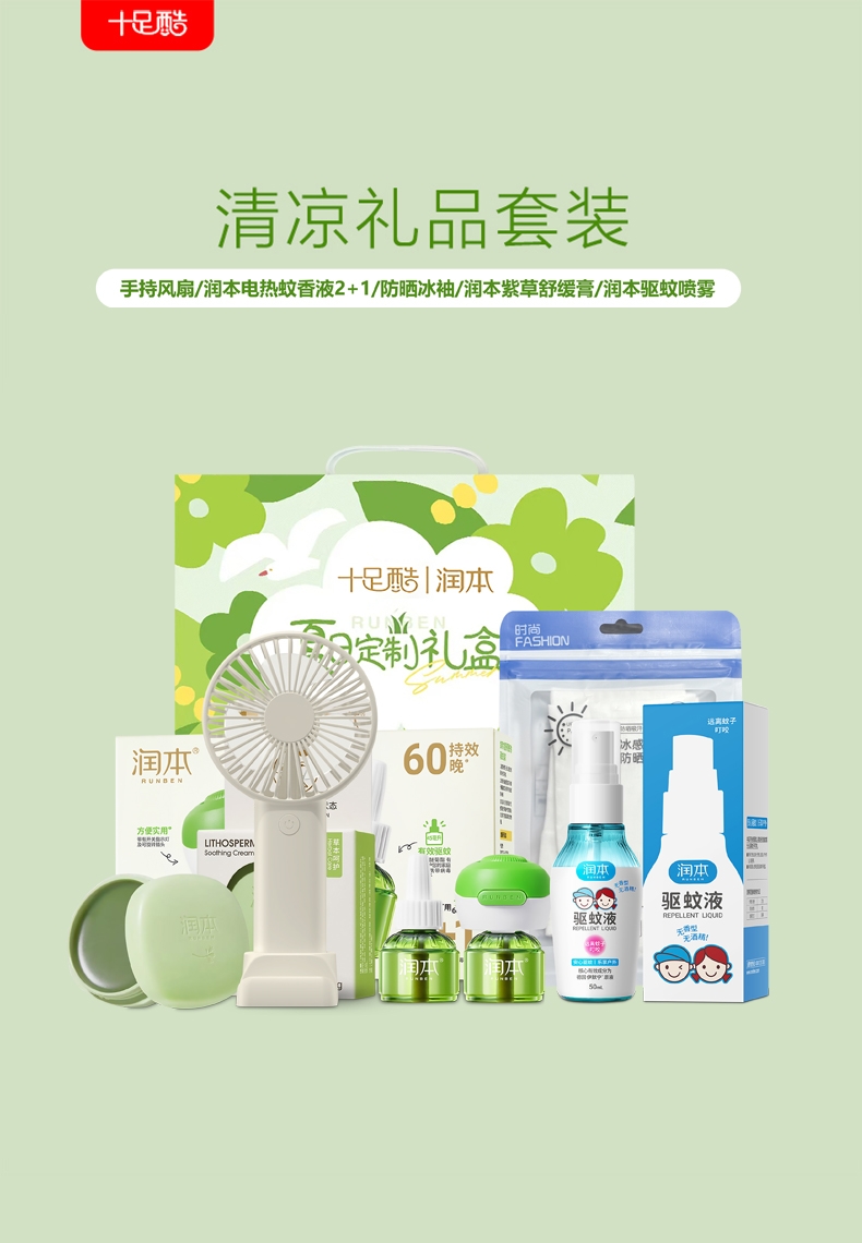 迷你手持风扇、三档调节,手机支架功能;润本电热蚊香液: 法国道达尔溶剂;润本驱蚊液: 50ml,7%驱蚊酯驱蚊液