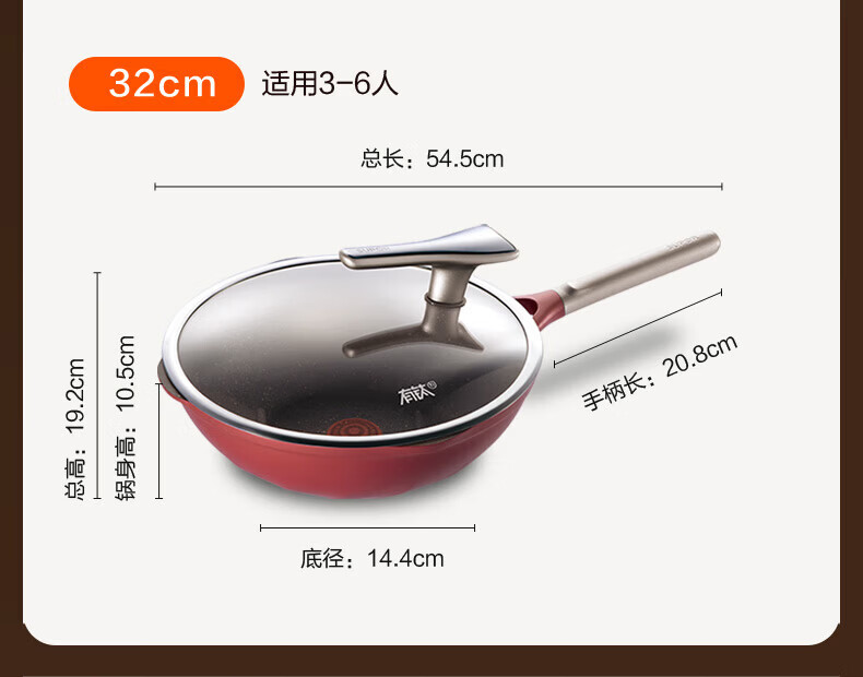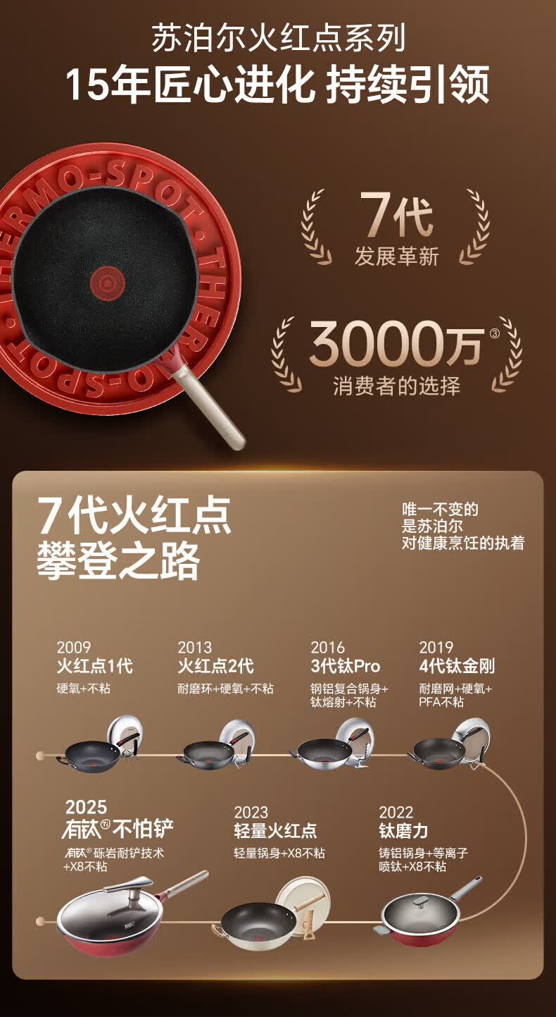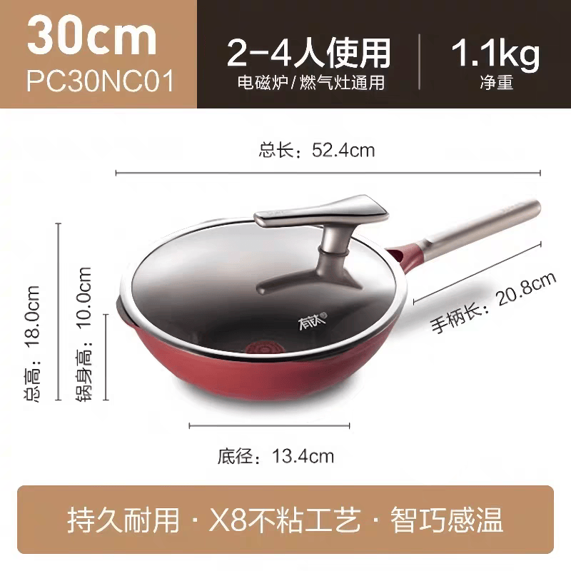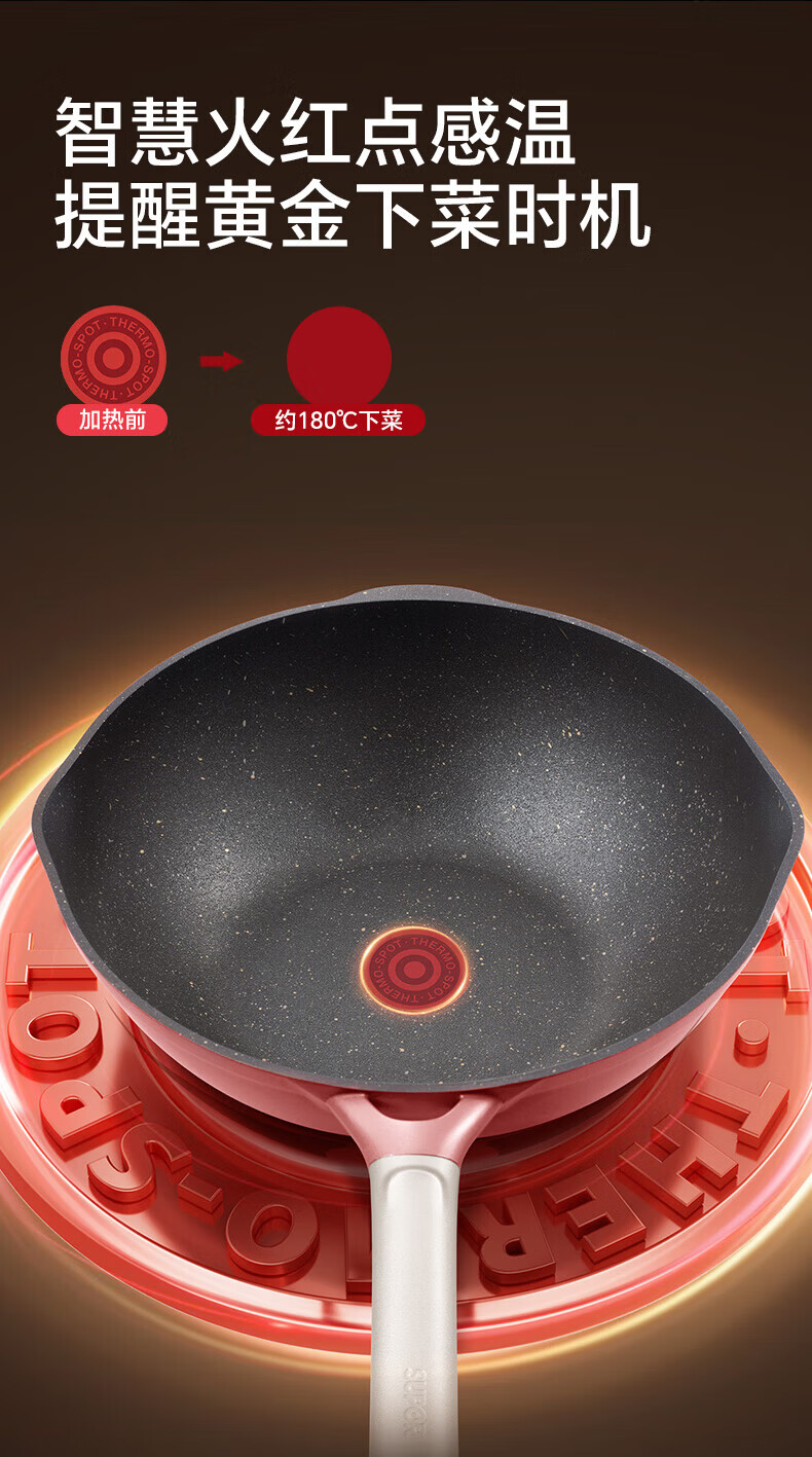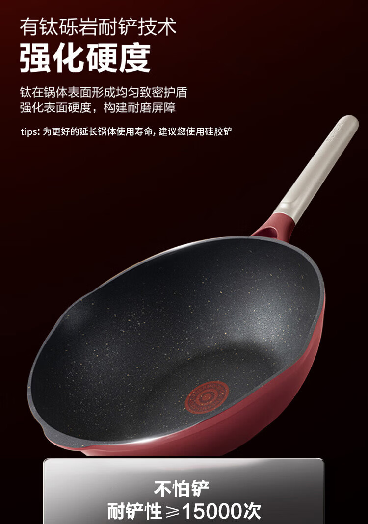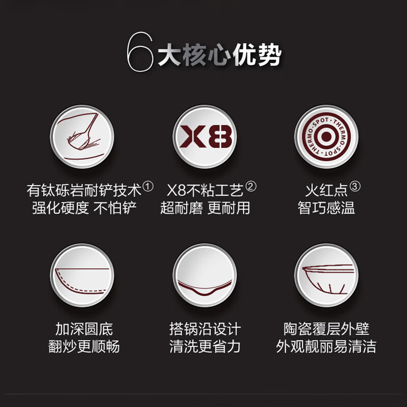 国标一级不粘;⑦ 火红点控温;耐磨耐用