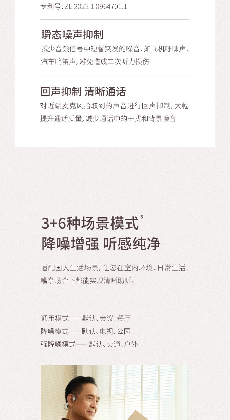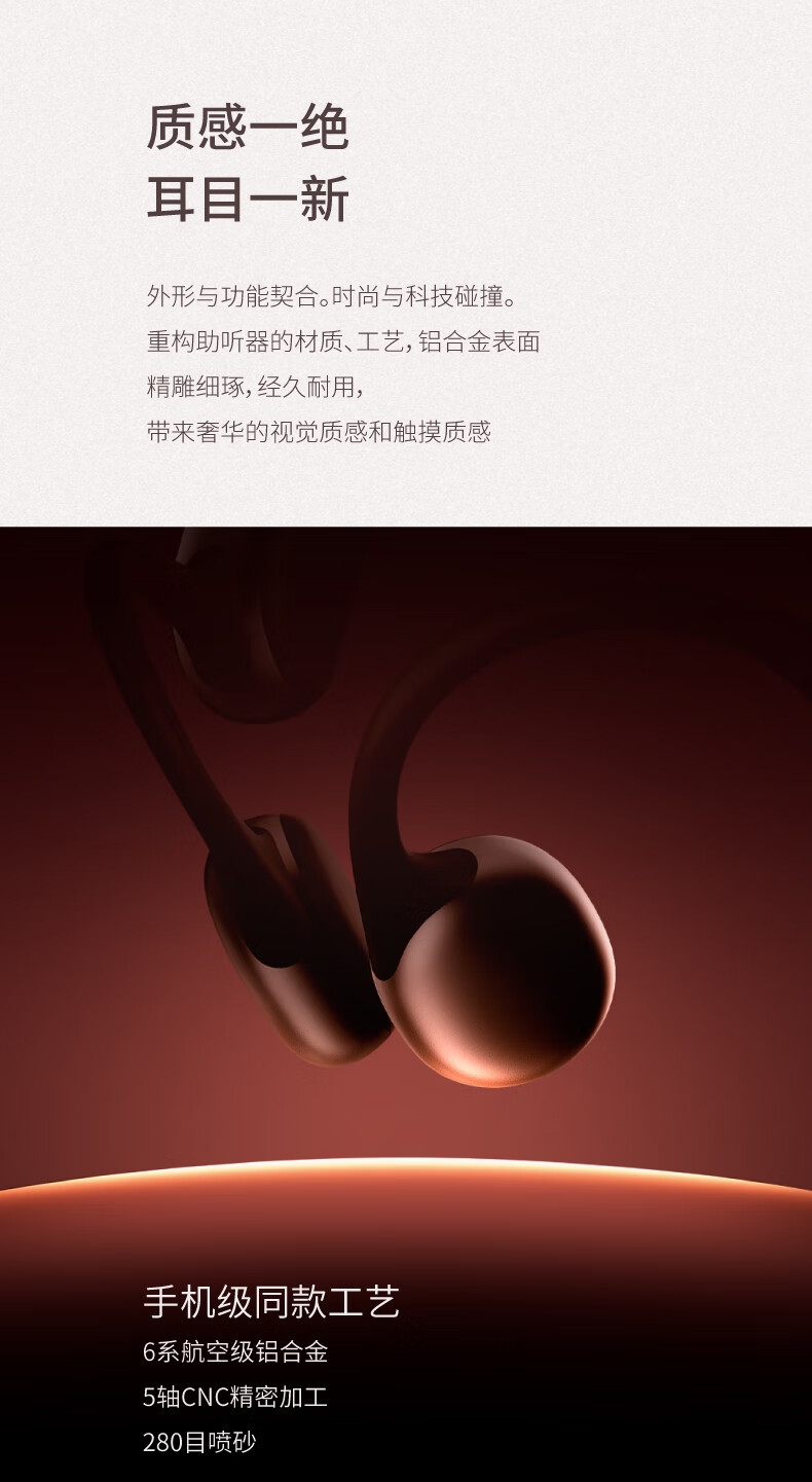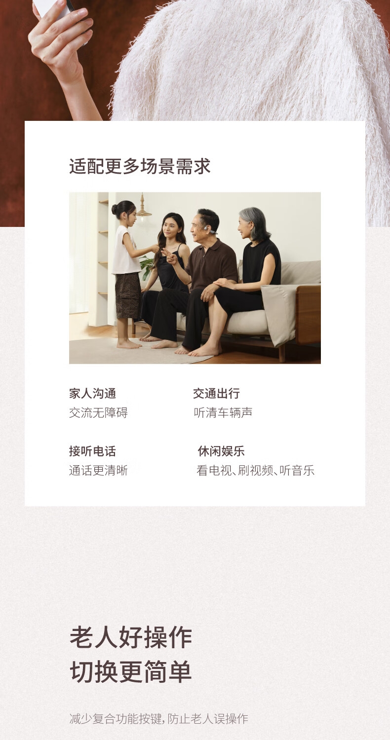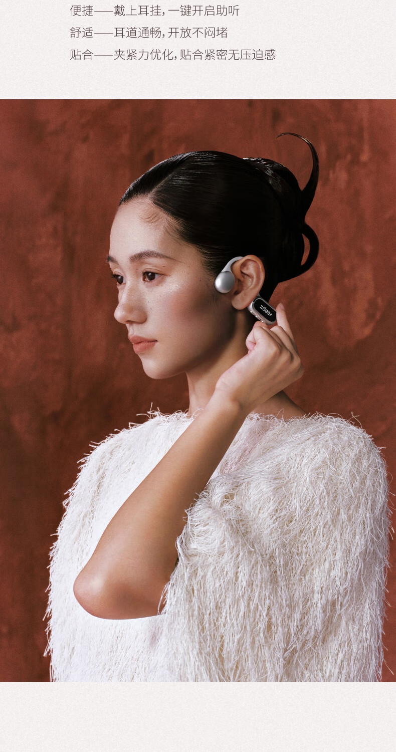 便捷:戴上耳挂,一键开启助听;;舒适:耳道通畅,开放不闷堵;;贴合:夹紧力优化,贴合紧密无压迫感;
