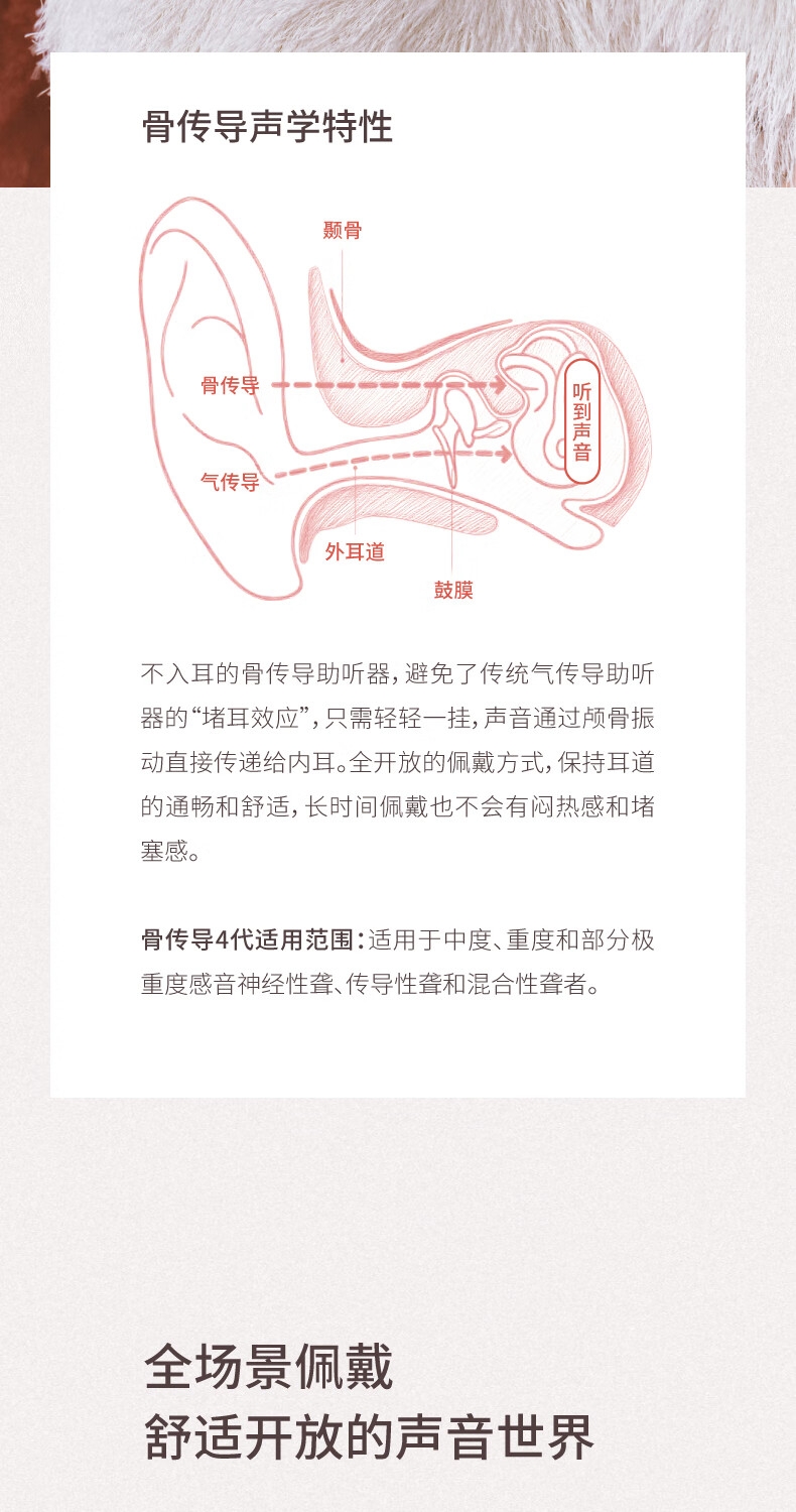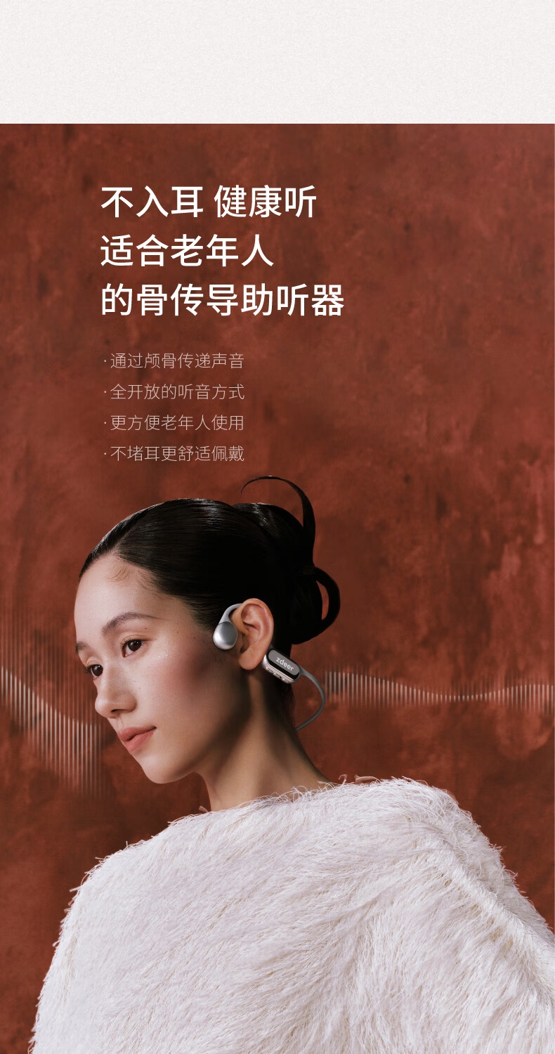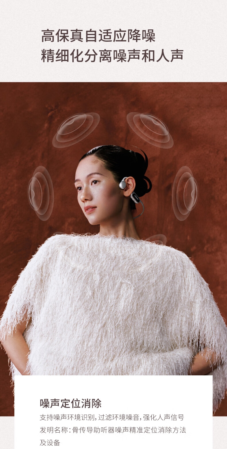 便捷:戴上耳挂,一键开启助听;舒适:耳道通畅,开放不闷堵;贴合:夹紧力优化,贴合紧密无压迫感