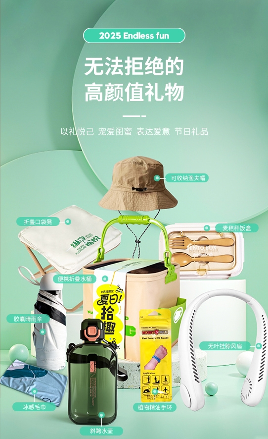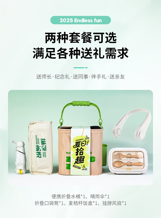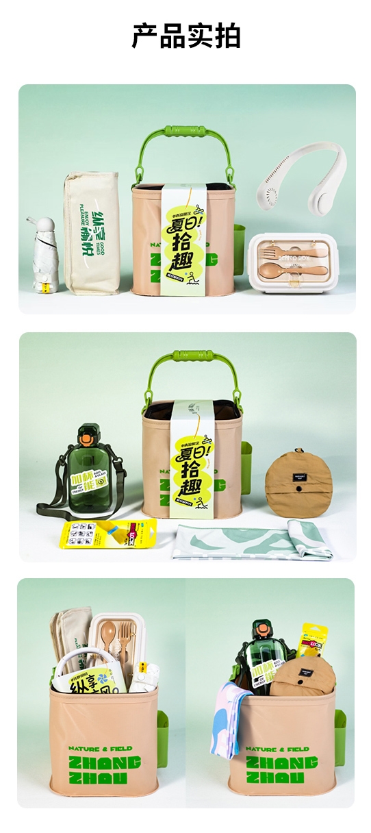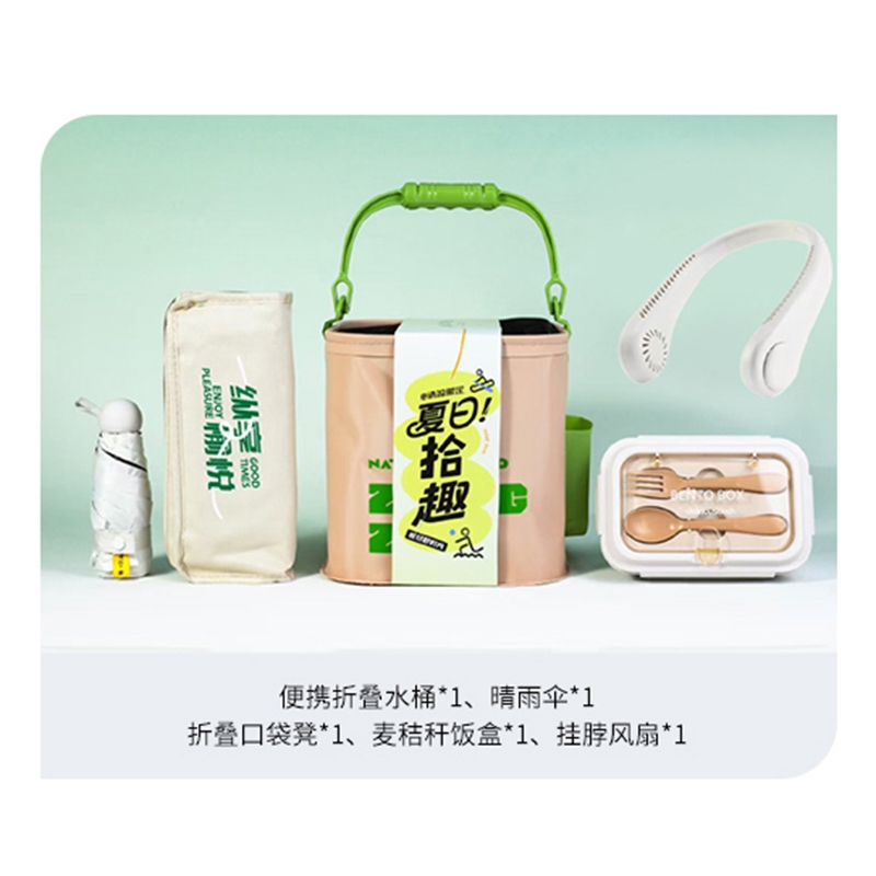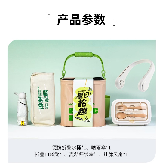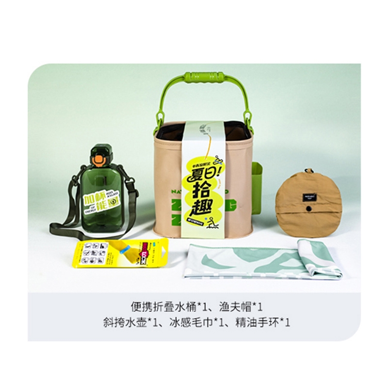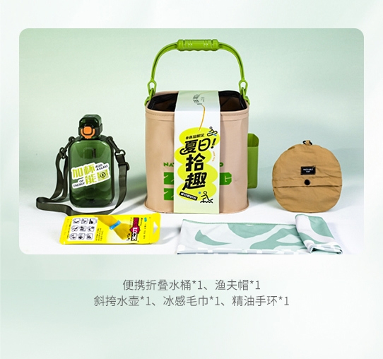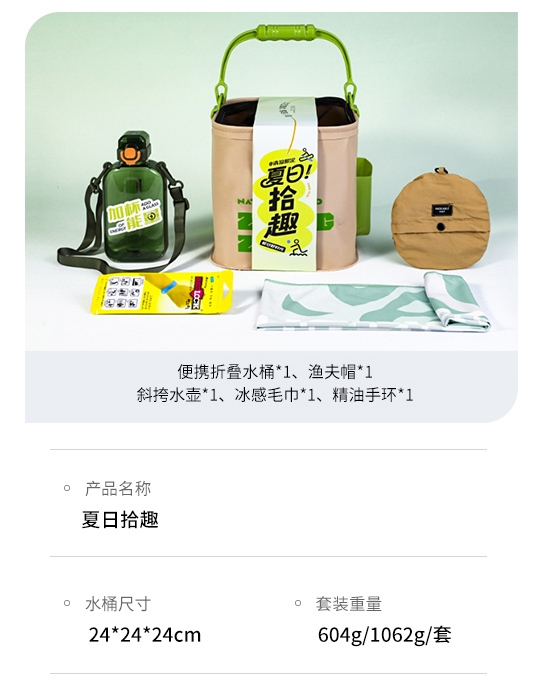 配置清单:便携折叠水桶 、渔夫帽*1、 斜挎水壶*1、冰感毛巾*1、 精油手环*1