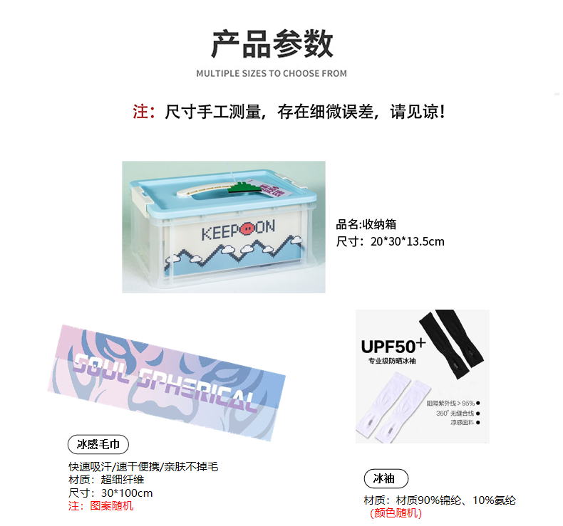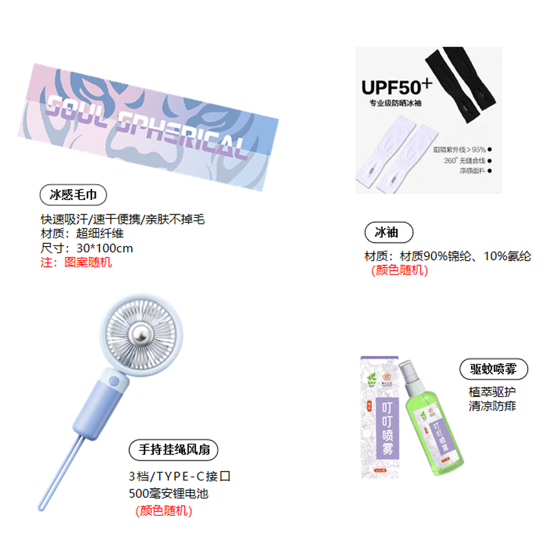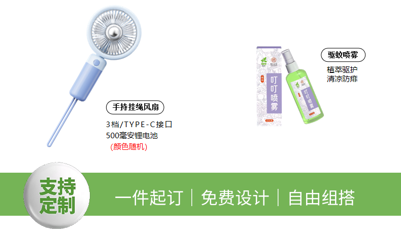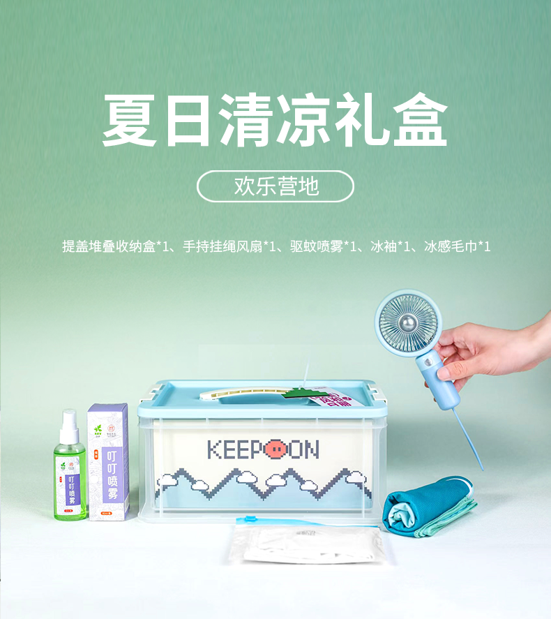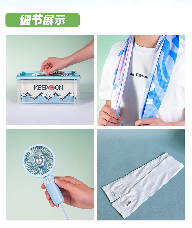 配置清单:提盖堆叠收纳盒*1、手持挂绳风扇*1、驱蚊喷雾*1、冰袖*1、冰感毛巾*1