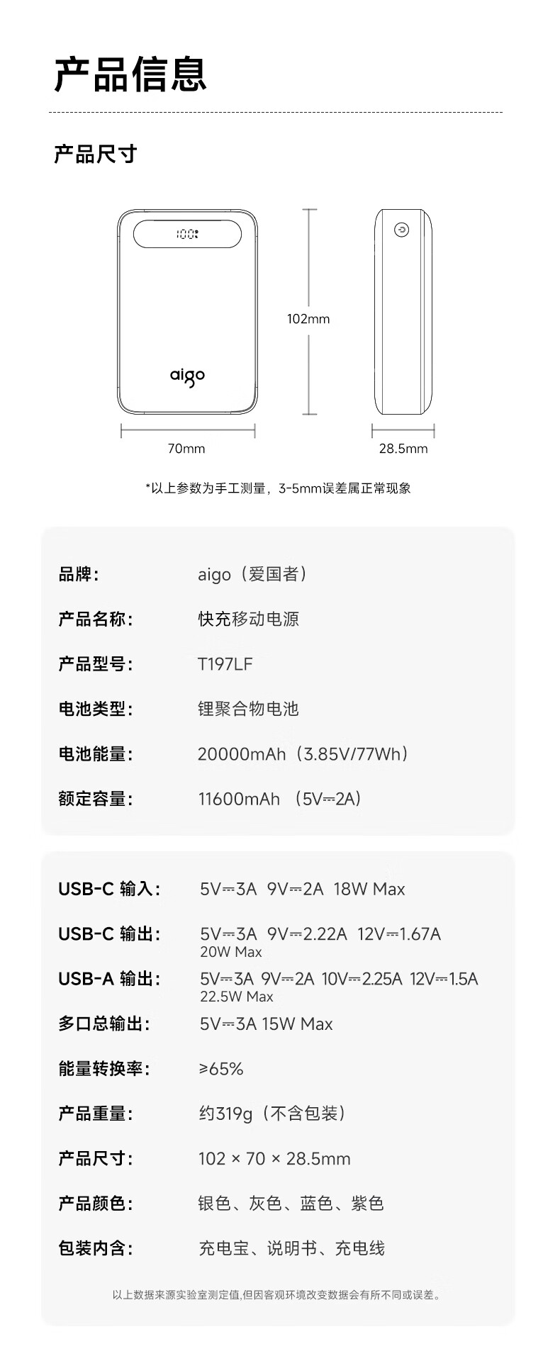 爱国者 22.5W快充20000毫安T197LF