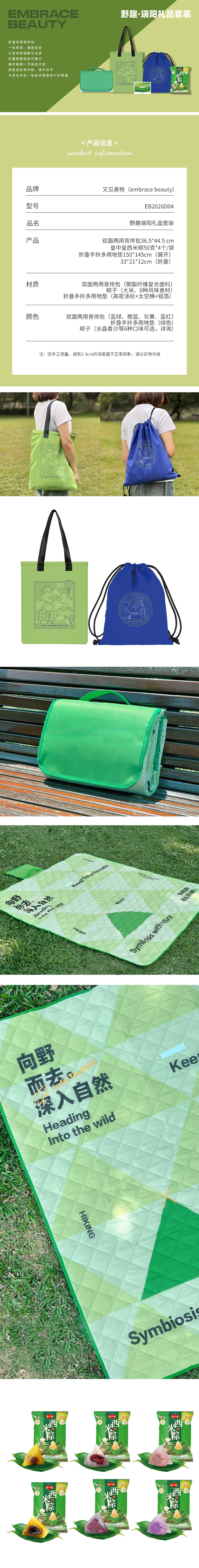 材质:双面两用背挎包(聚酯纤维复合面料)、粽子(大米、6种风味食材) 折叠手拎多用地垫(高密涤纶+太空棉+铝箔)