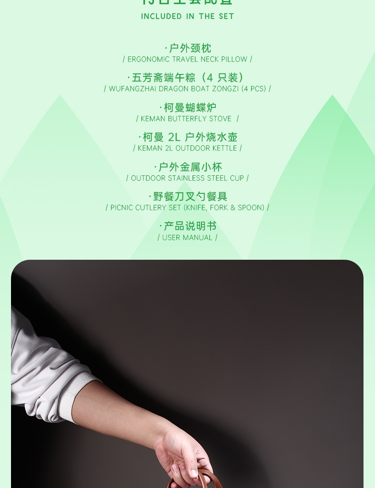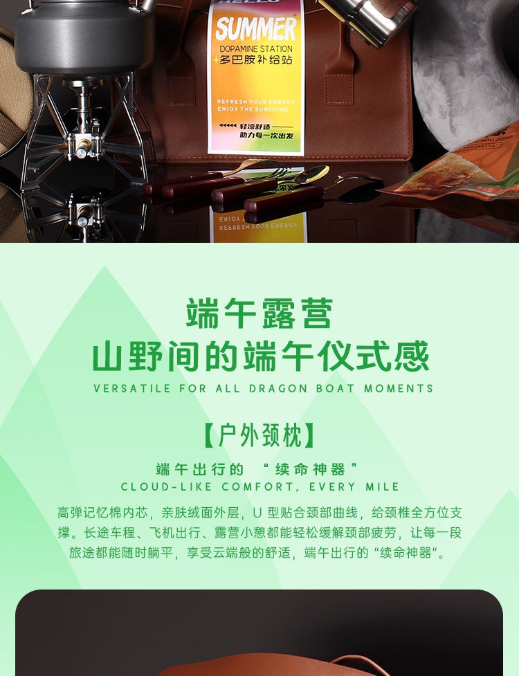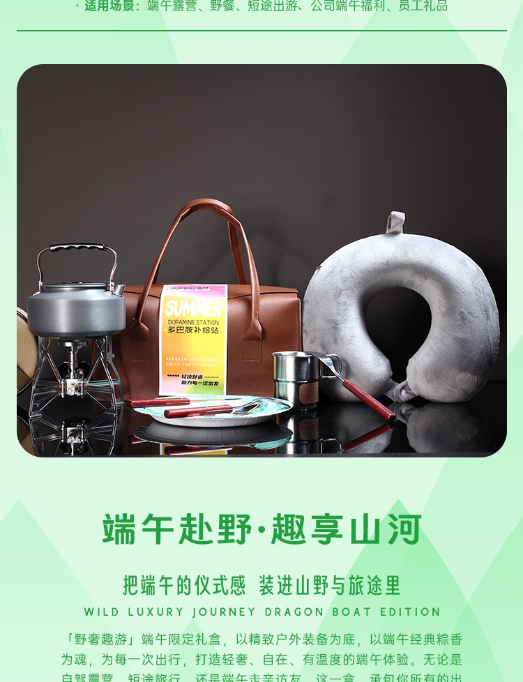 五芳斋粽 + 柯曼炉具,露营自驾一站式轻奢端午礼;手提皮包收纳全套装备,端午送礼实用又有面;甜咸双粽配专业户外套装,端午出行仪式感拉满;户外露营 + 端午粽香结合,高端伴手礼不撞款;柯曼炉壶 + 便携出行装备,端午送礼体面实用