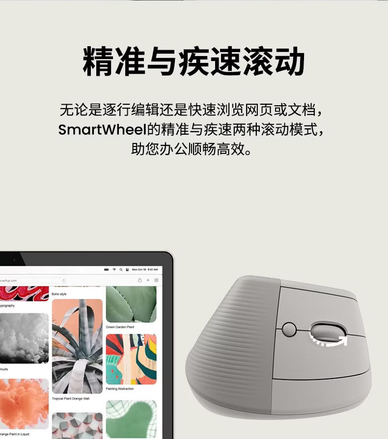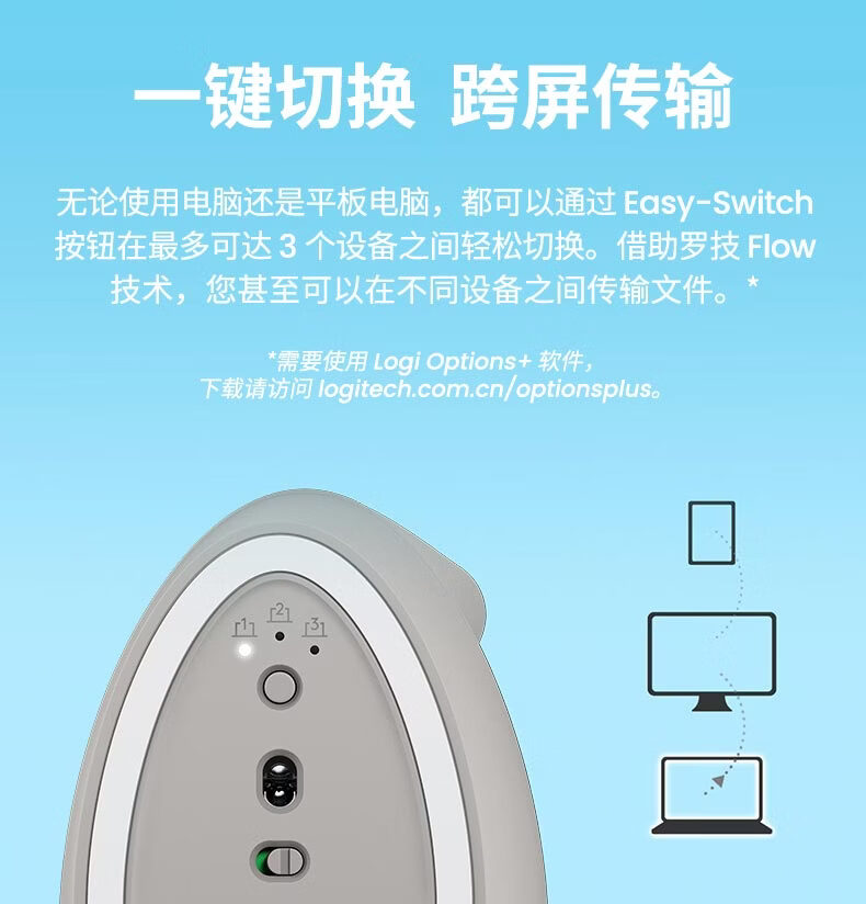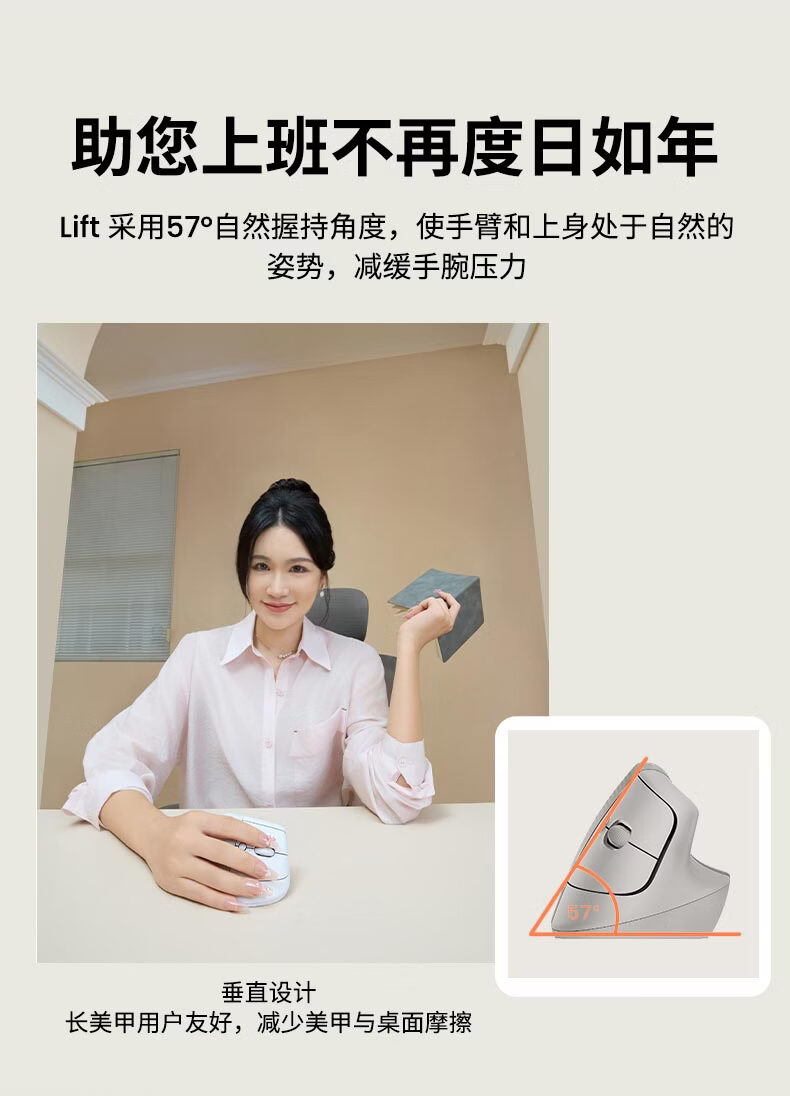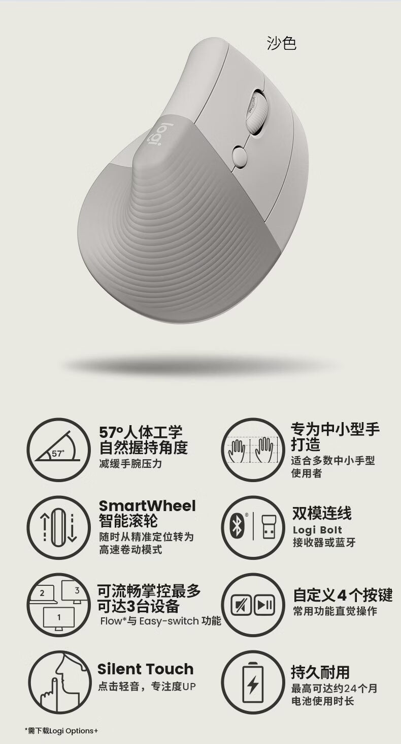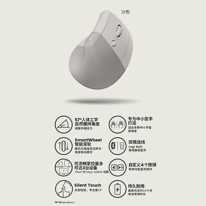 57° 倾角, 自然握持角度,适合亚洲中小手型;轻音点击按键点击;配有smartwheel自适应滚轮,逐行&疾速两种;三台设备连接,easy-switch 简易切换;双模连接,蓝牙低功耗& logi bolt