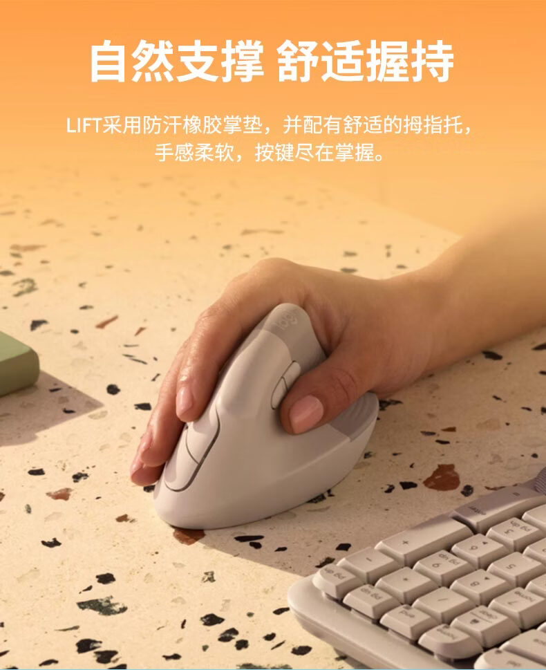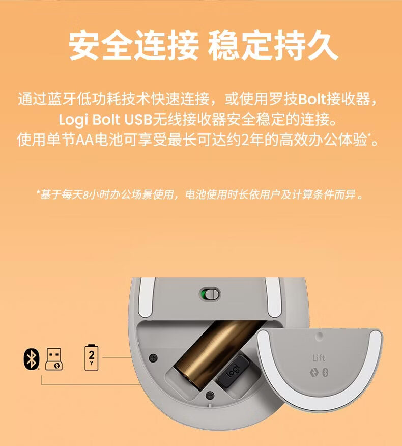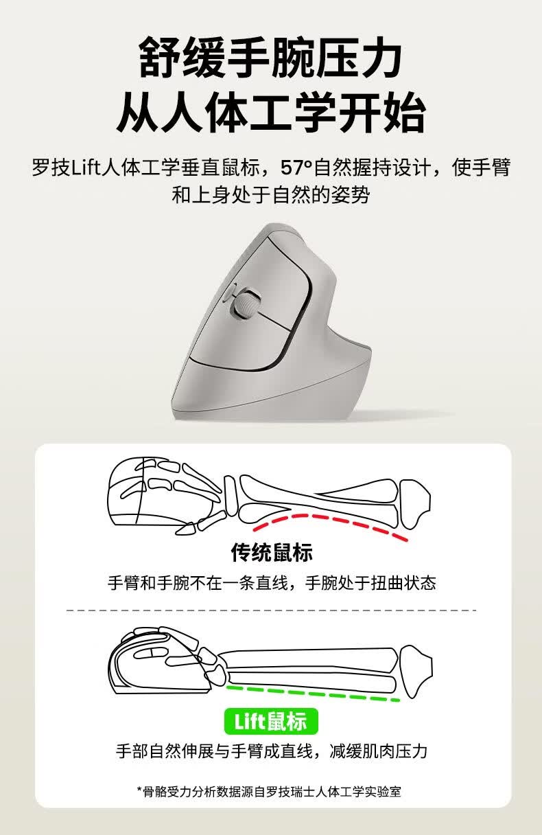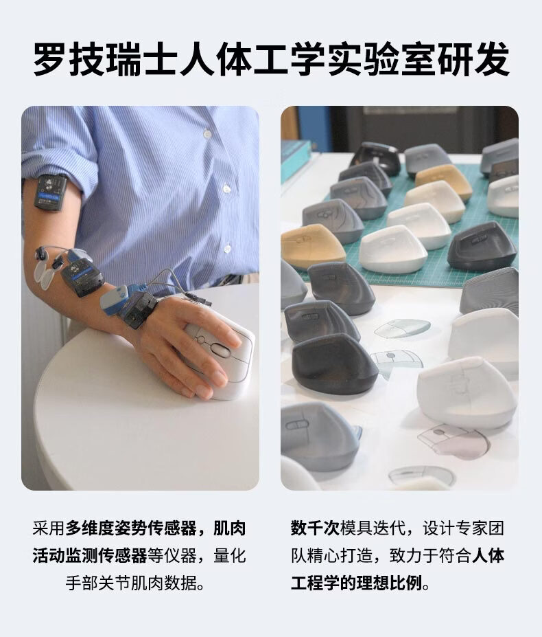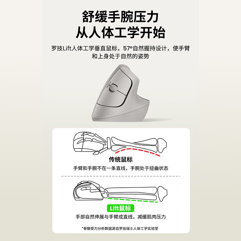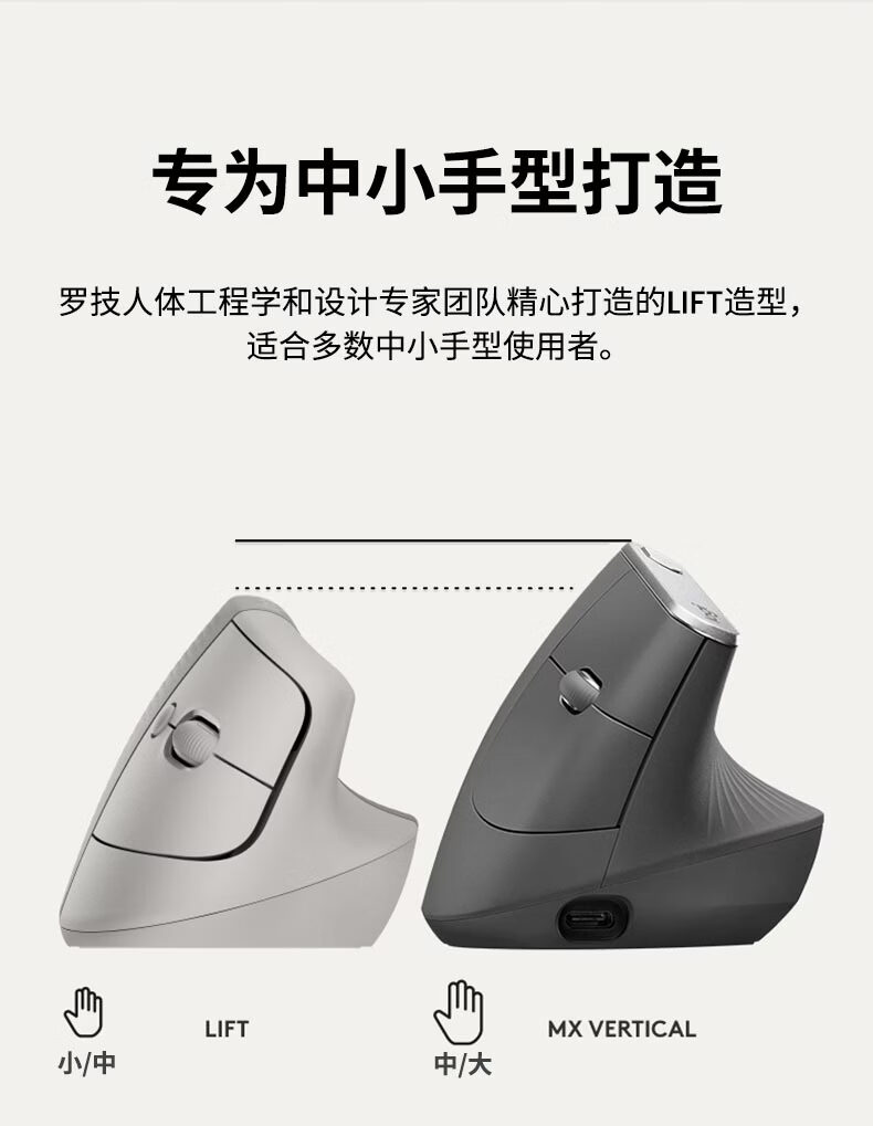 57° 倾角, 自然握持角度,适合亚洲中小手型;轻音点击按键点击;配有smartwheel自适应滚轮,逐行&疾速两种;三台设备连接,easy-switch 简易切换;双模连接,蓝牙低功耗& logi bolt