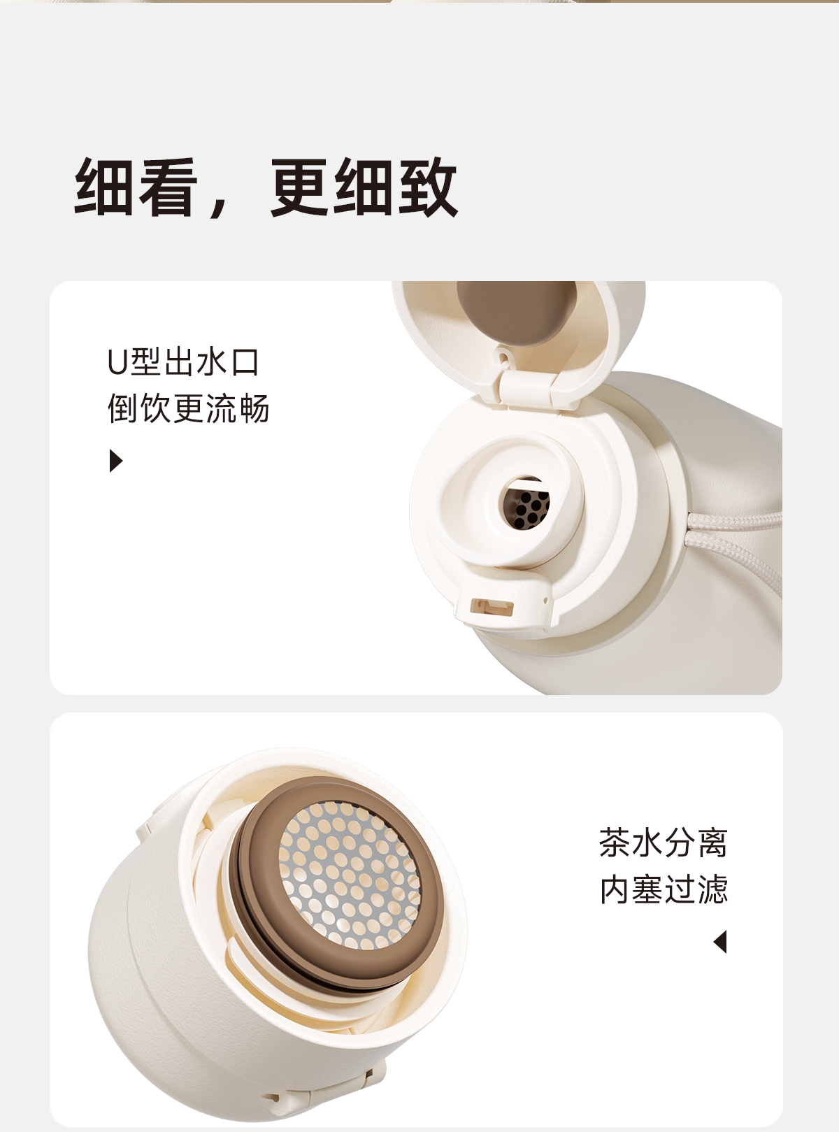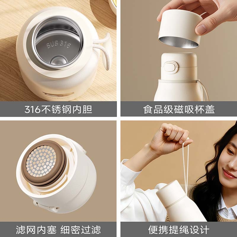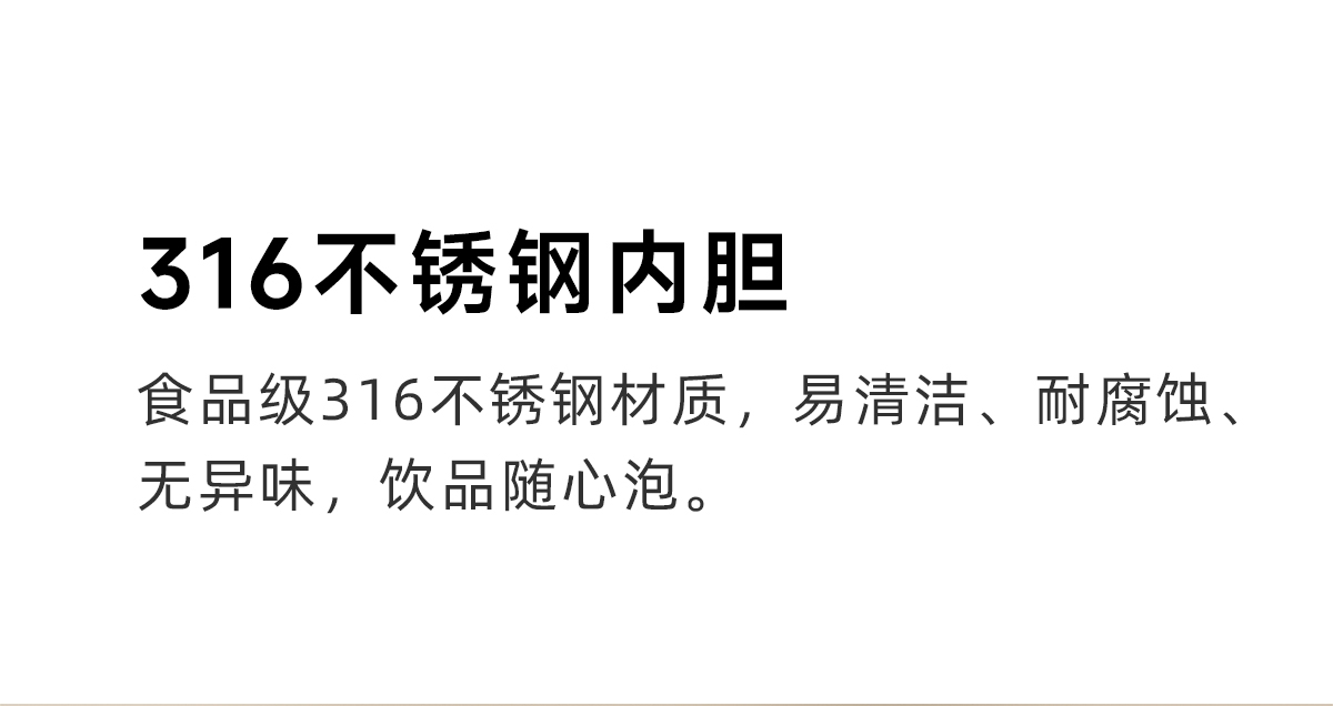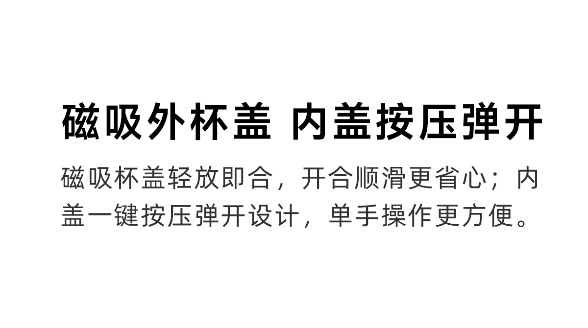 316不锈钢内胆,易清洁洗,耐腐蚀;内置过滤内塞,茶水分离;磁吸外盖杯,内盖按压弹开,操作简单,杯盖也可当杯子