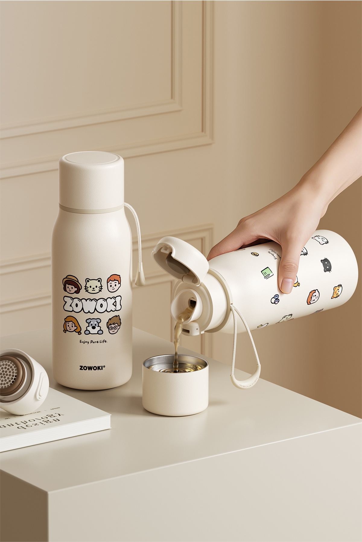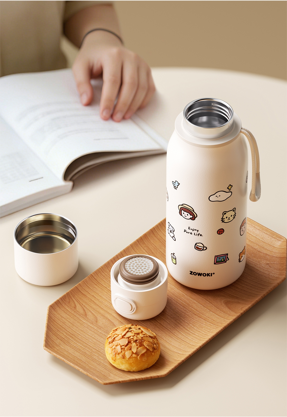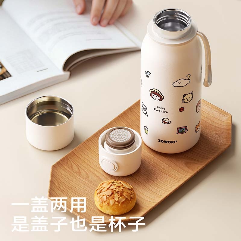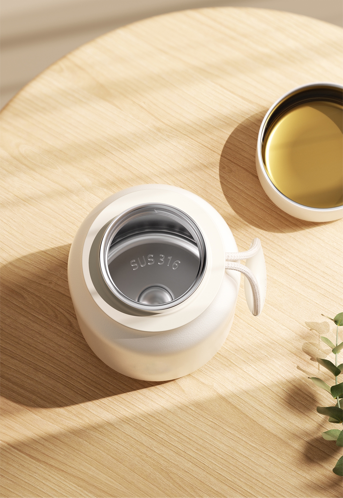 316不锈钢内胆,易清洁洗,耐腐蚀;内置过滤内塞,茶水分离;磁吸外盖杯,内盖按压弹开,操作简单,杯盖也可当杯子