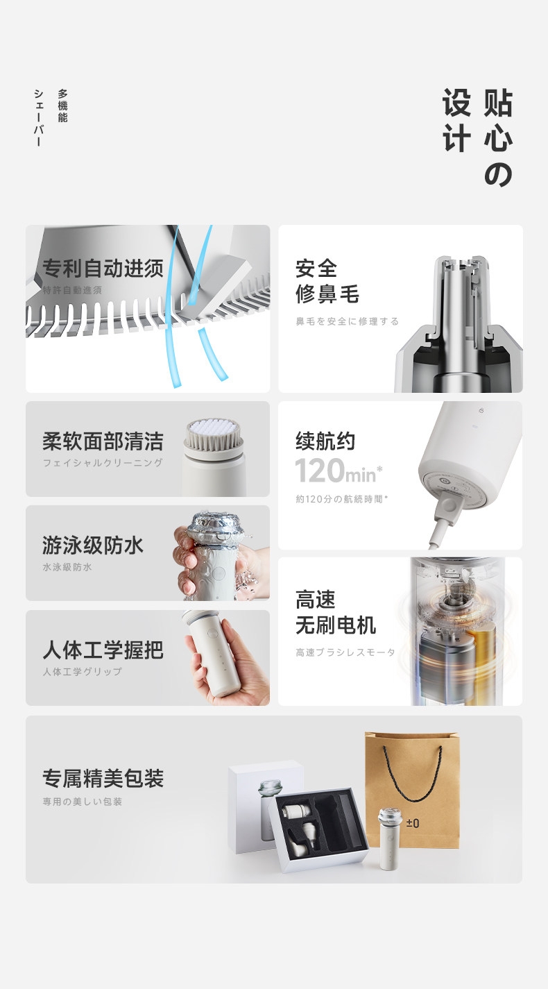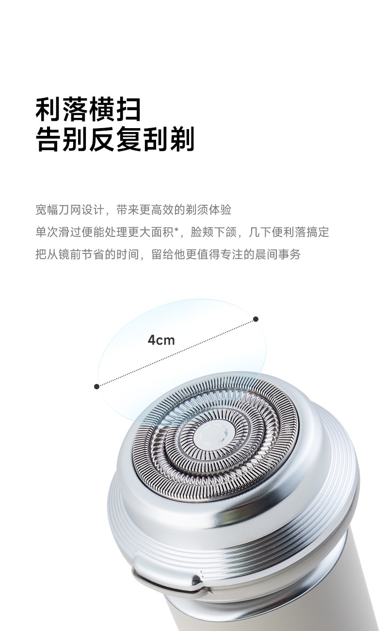 配备四种刀头,满足多种使用需求;创新旋转外刀网,自动寻须,精准剃须不遗漏;4D 维度,双层九叶刀片,贴面剃须更顺滑