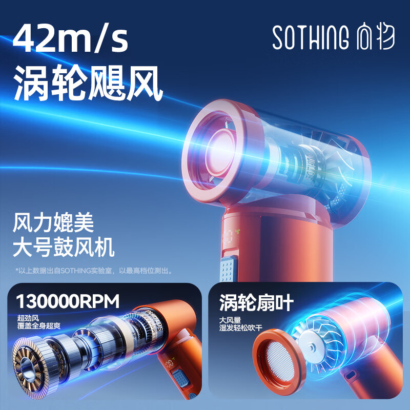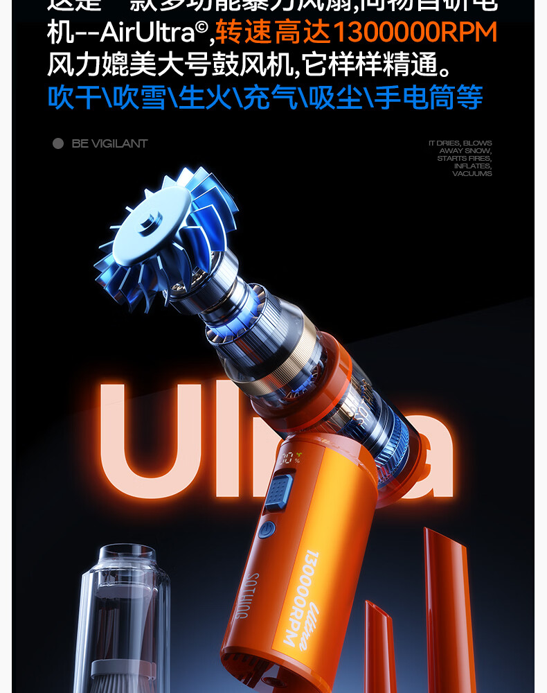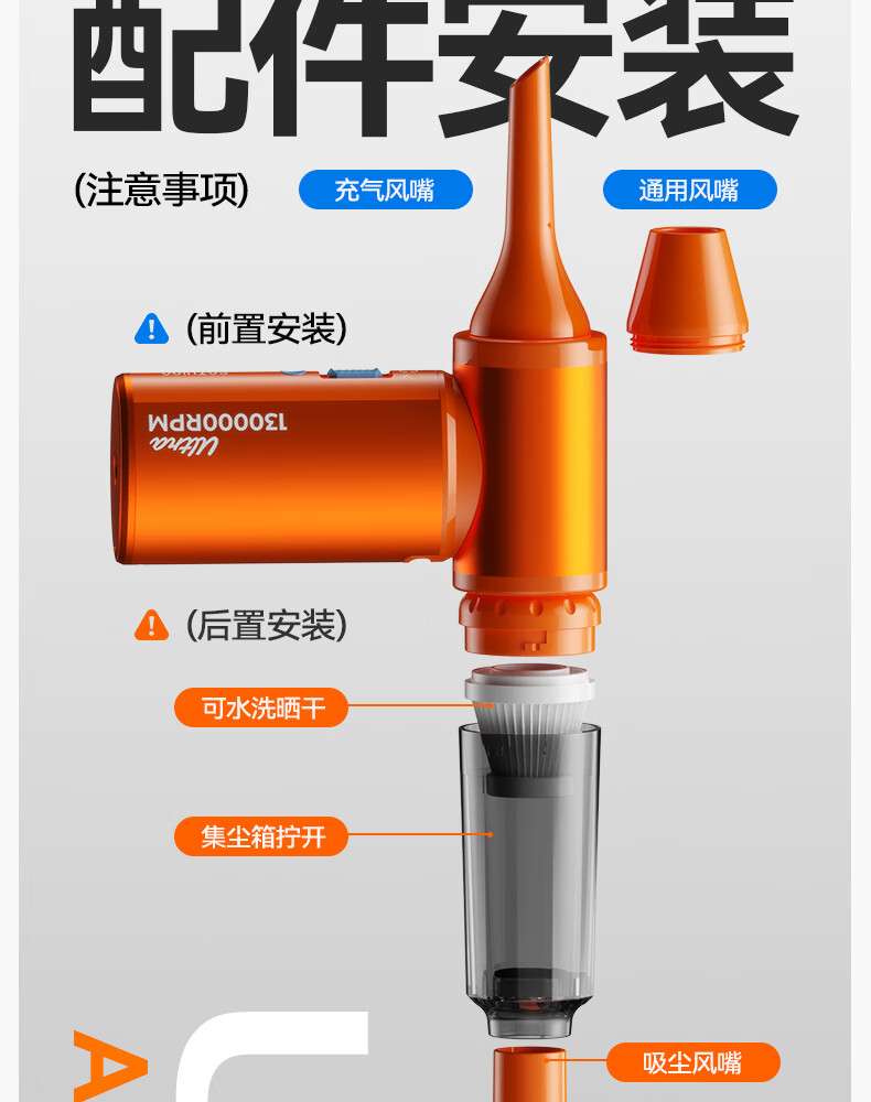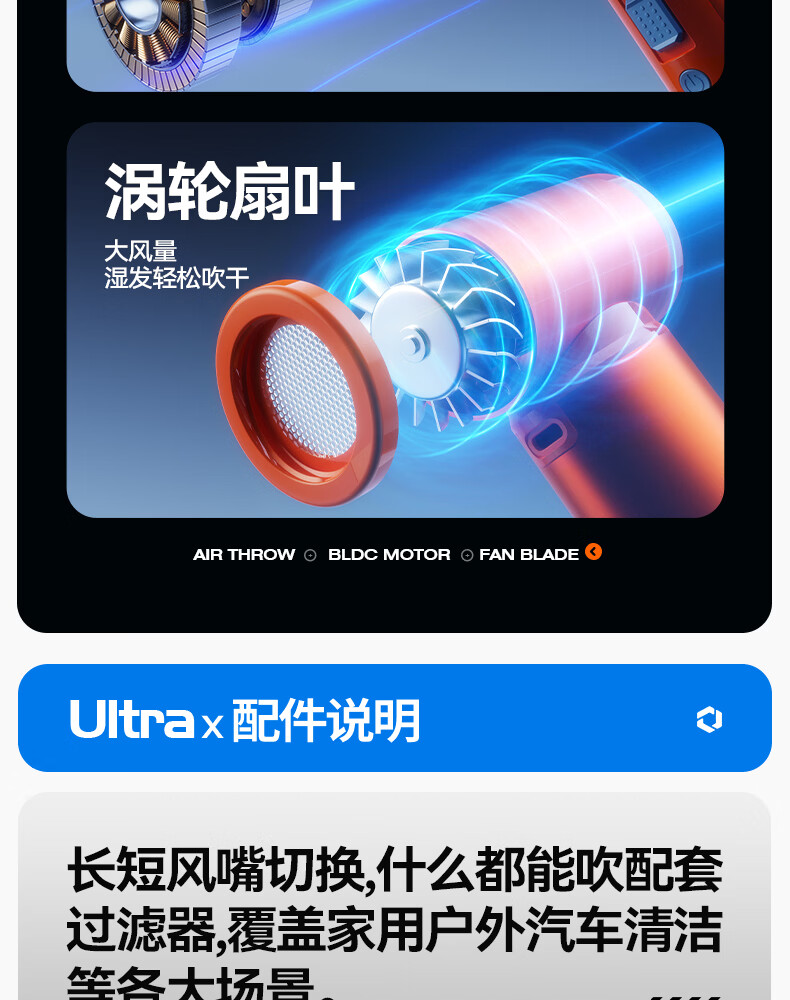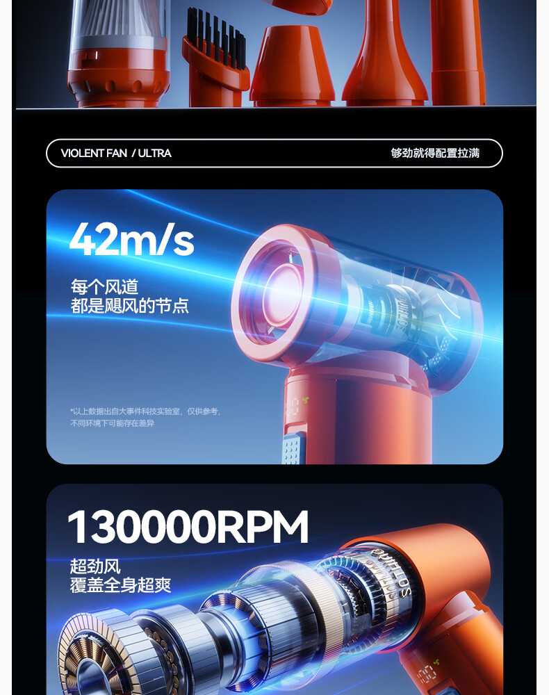 可拆洗 充电续航;吸吹一体套装;转速高达1.3万转