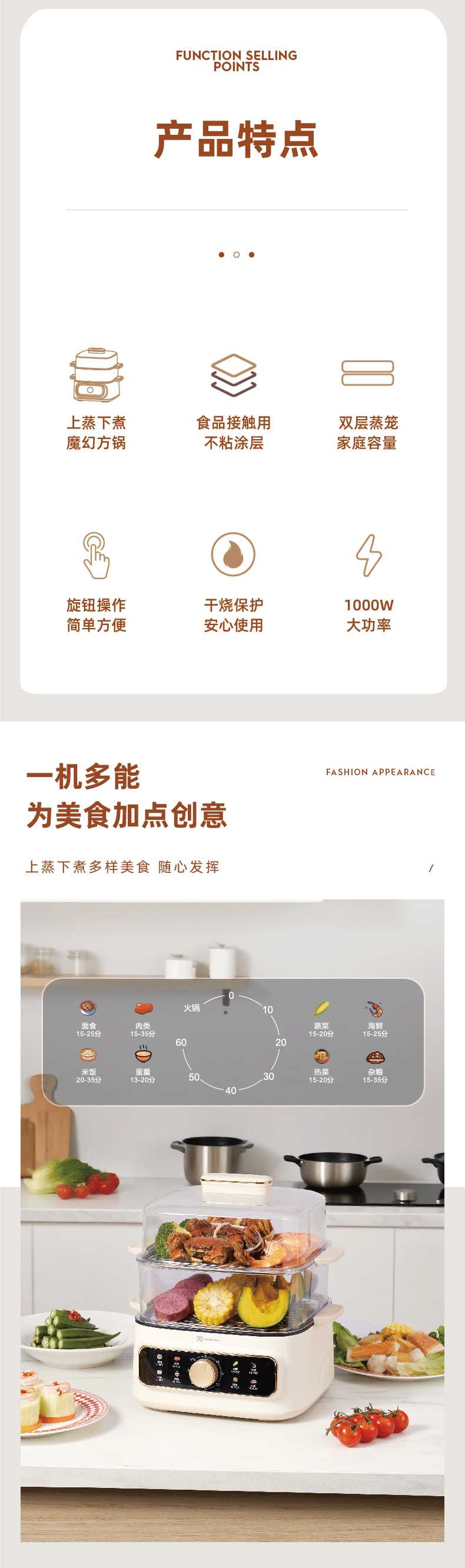 透明PC蒸层,烹饪进程一目了然;功能强大:蒸煮焖炖涮 花式美味;机械手控操作,简单方便