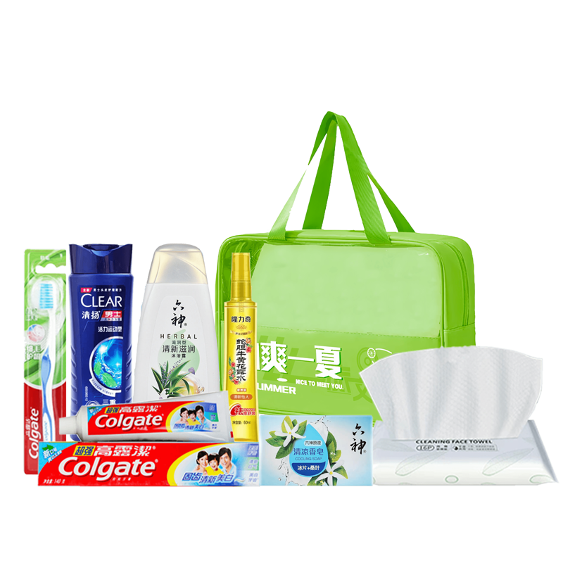 配置清单:1.清扬洗发水160ml*1(颜色随机) 2.六神清新滋润沐浴露200ml*1(颜色随机) 3.隆力奇蛇胆花露水60ml*1 4.六神清凉香皂108g*1 5.高露洁固齿清新牙膏90g*1 6..高露洁纤丝软毛牙刷 *1 7.干湿两用绵柔洗脸巾16抽*1 8.沁爽一夏收纳包*1