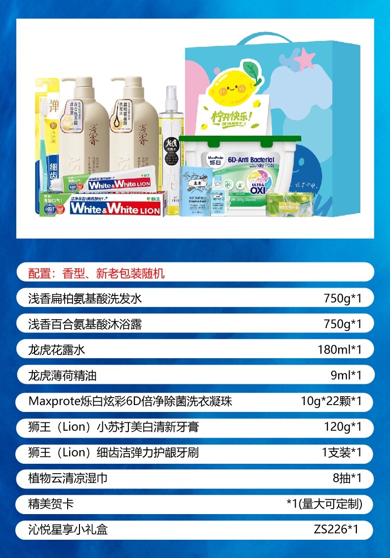 配置清单:配置明细: 浅香扁柏氨基酸洗发水750g*1 浅香百合氨基酸沐浴露750g*1 龙虎黄柏花露水180ml*1 龙虎薄荷精油9ml*1 Maxprote烁白炫彩6D倍净除菌洗衣凝珠10g*22颗*1 狮王(Lion)小苏打美白清新牙膏120g*1狮王(Lion)细齿洁弹力护龈牙刷1支装*1 植物云清凉湿巾8抽*1 精美贺卡*1(量大可定制) 沁悦星享小礼盒ZS226*1