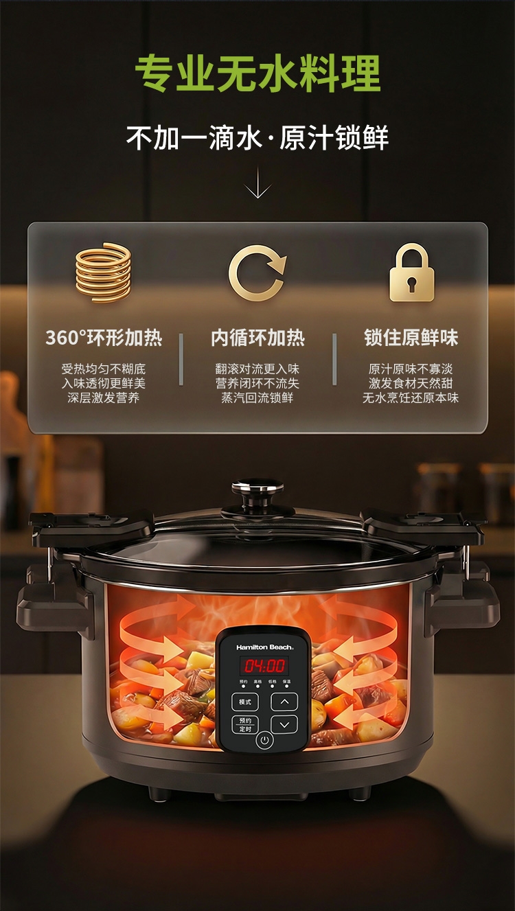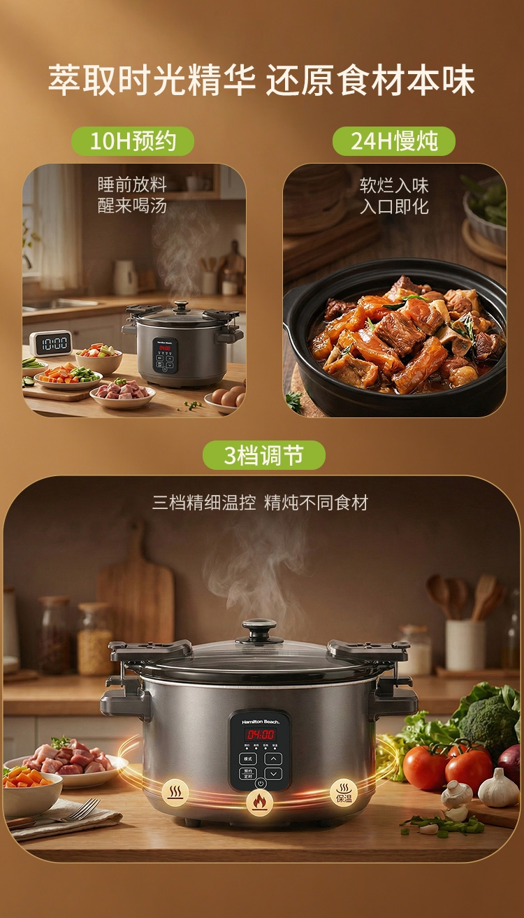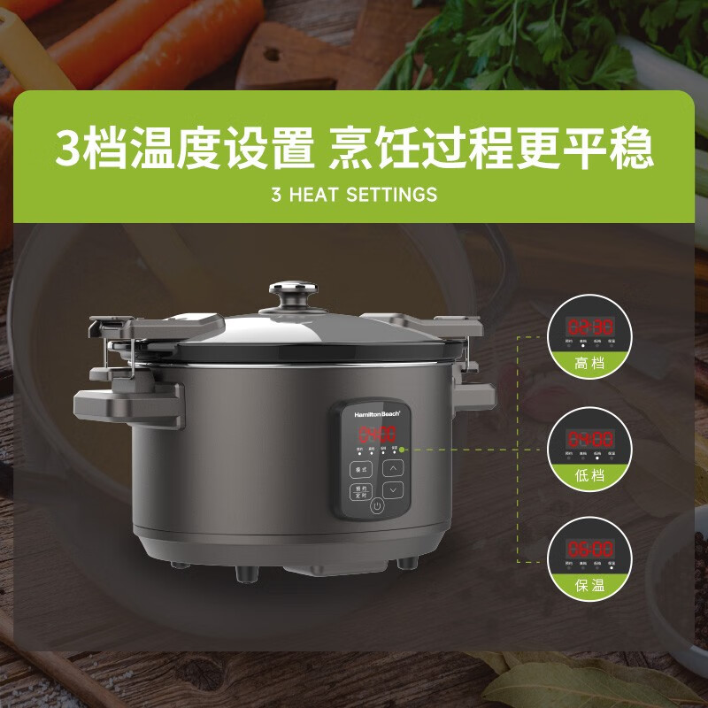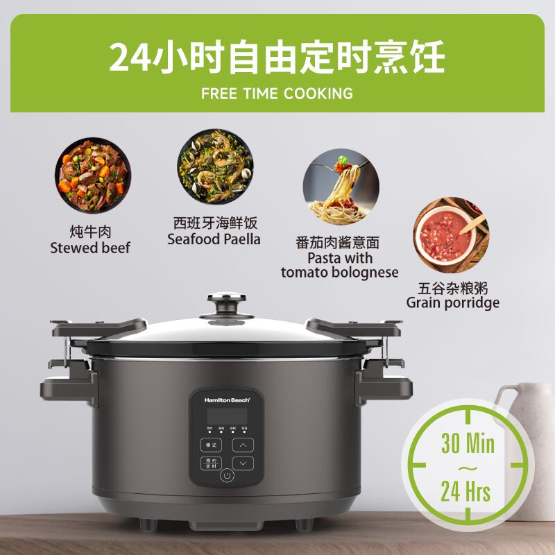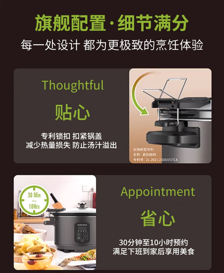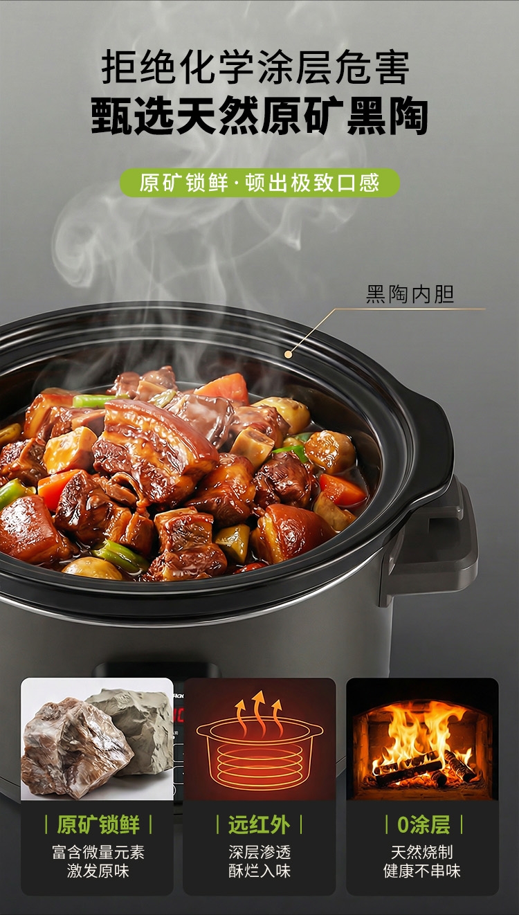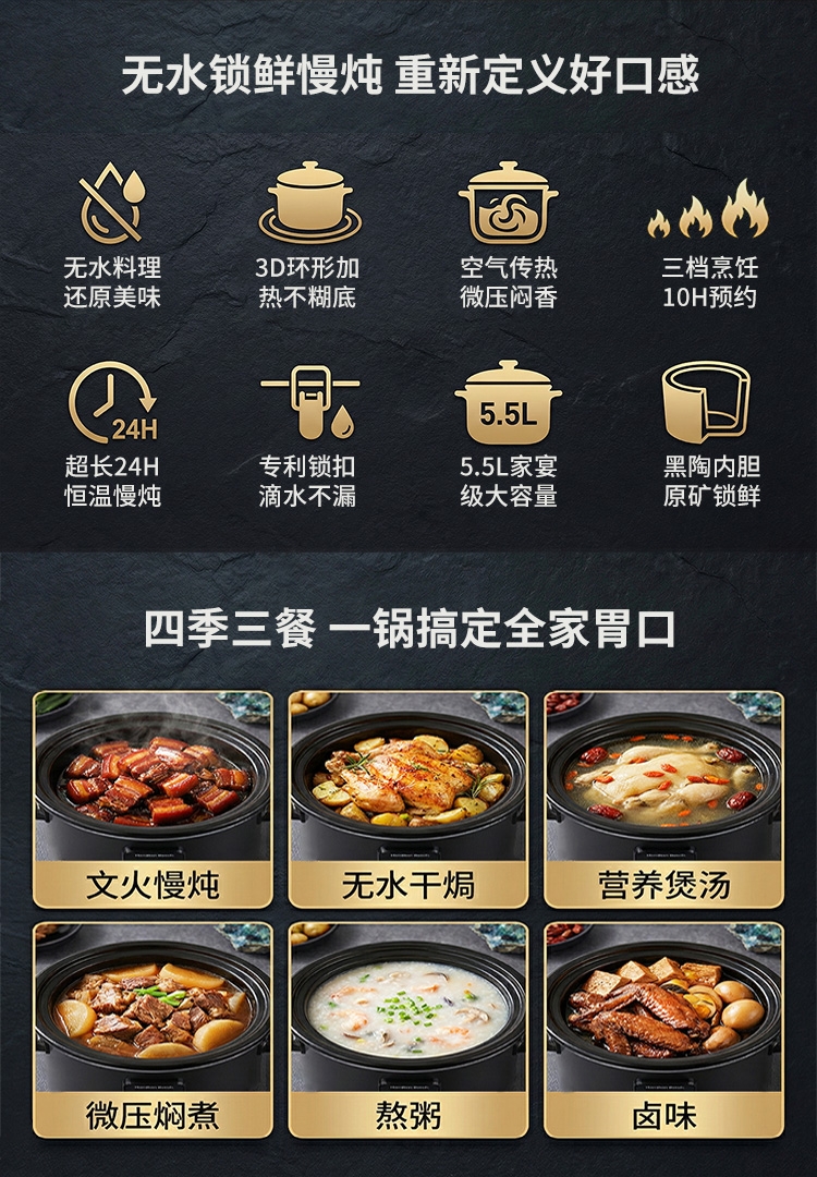 天然陶土烧制内胆、储热强散热慢;5.5升大容量,轻松满足6-8人用餐;三维立体加热, 小火慢炖, 传承独特口感;最长可设置24小时定时工作,无需看管更省心;30分钟-10小时预约时间,生活更轻松