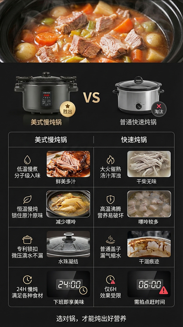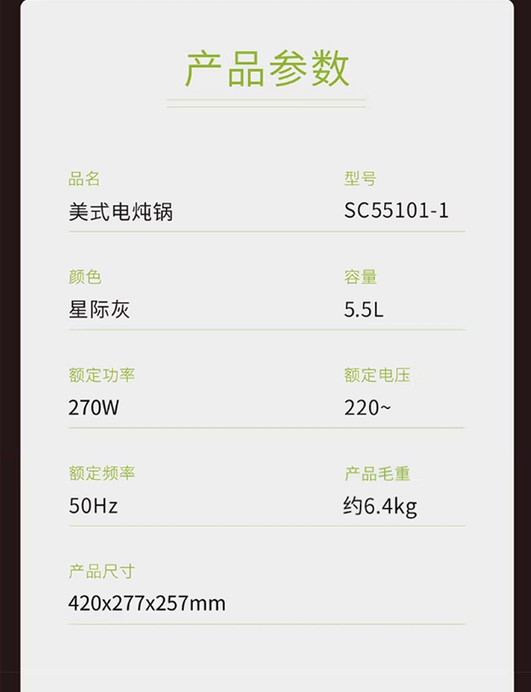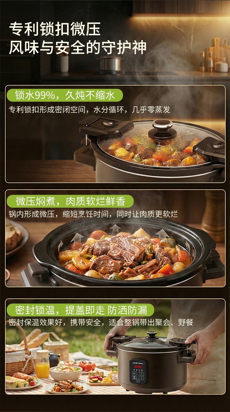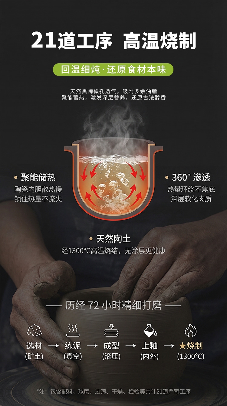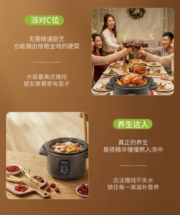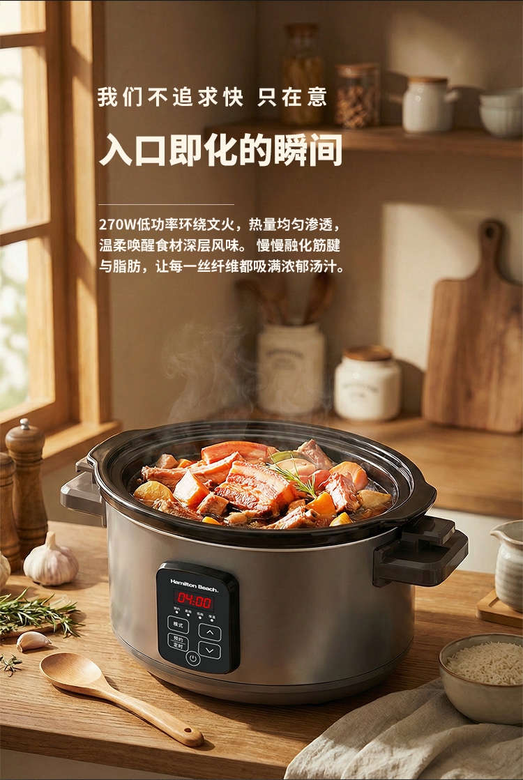 天然陶土烧制内胆、储热强散热慢;5.5升大容量,轻松满足6-8人用餐;三维立体加热, 小火慢炖, 传承独特口感;最长可设置24小时定时工作,无需看管更省心;30分钟-10小时预约时间,生活更轻松