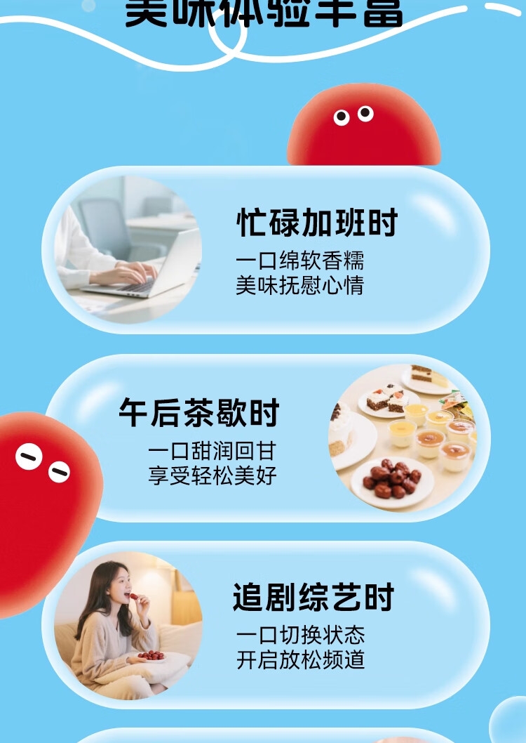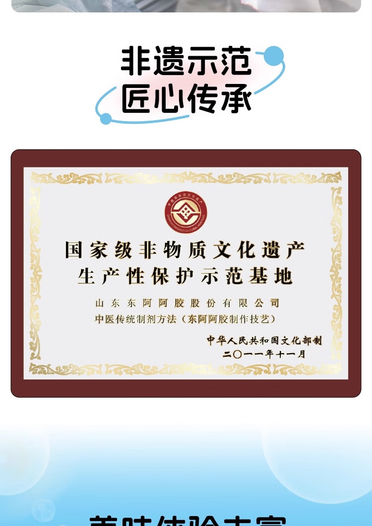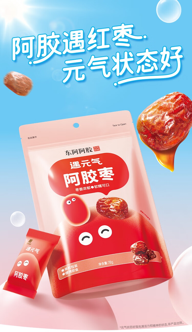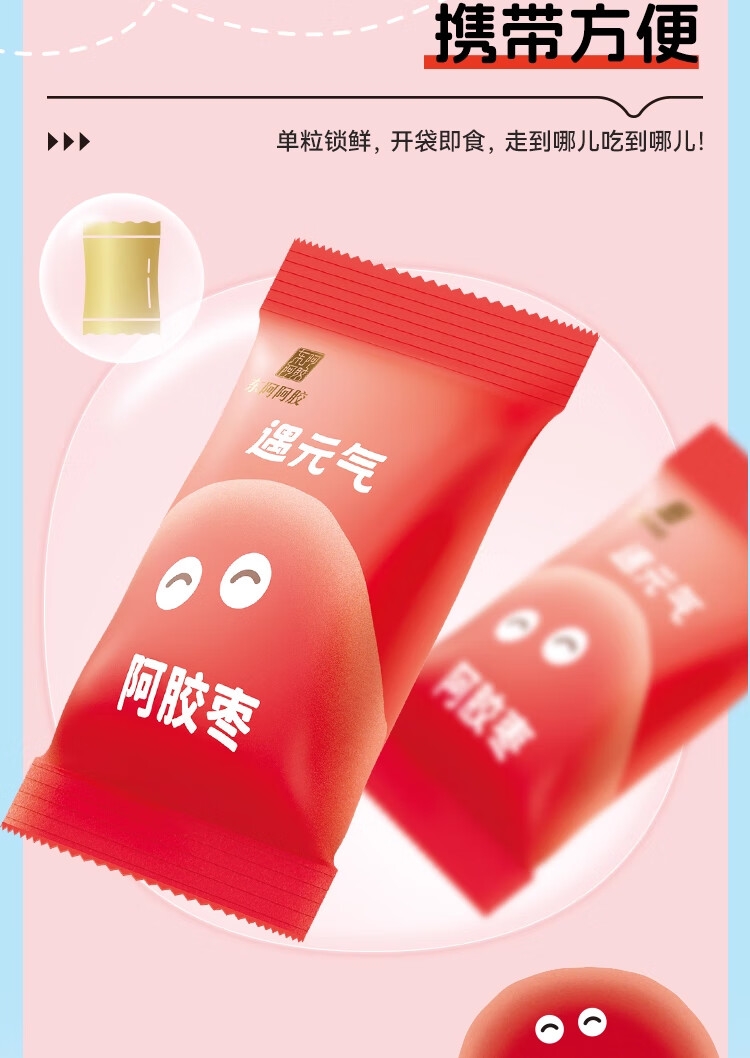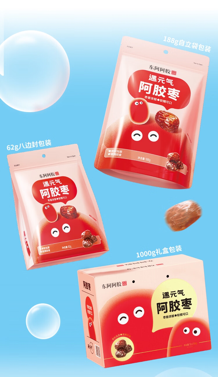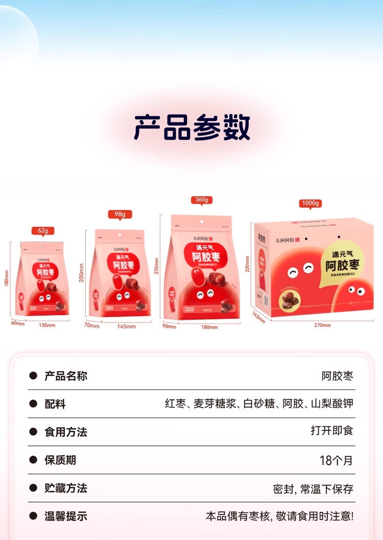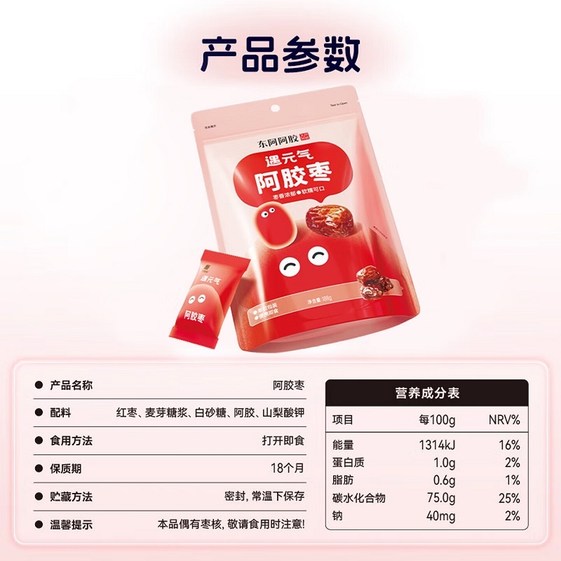 央企华润集团控股上市公司东阿阿胶荣誉出品;阿胶枣通过东阿阿胶原液浸泡、煮制等多道工序制作而成;每颗独立包装,无核食用方便,口感软糯甘甜,甜而不腻