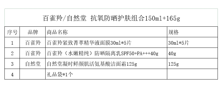 配置清单:百雀羚紧致菁萃精华液面膜30ml*5片 百雀羚(水嫩精纯)防晒隔离乳SPF50+PA+++40g 自然堂凝时鲜颜肌活氨基酸洁面霜125g 礼品袋*1个