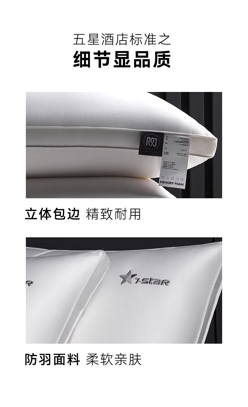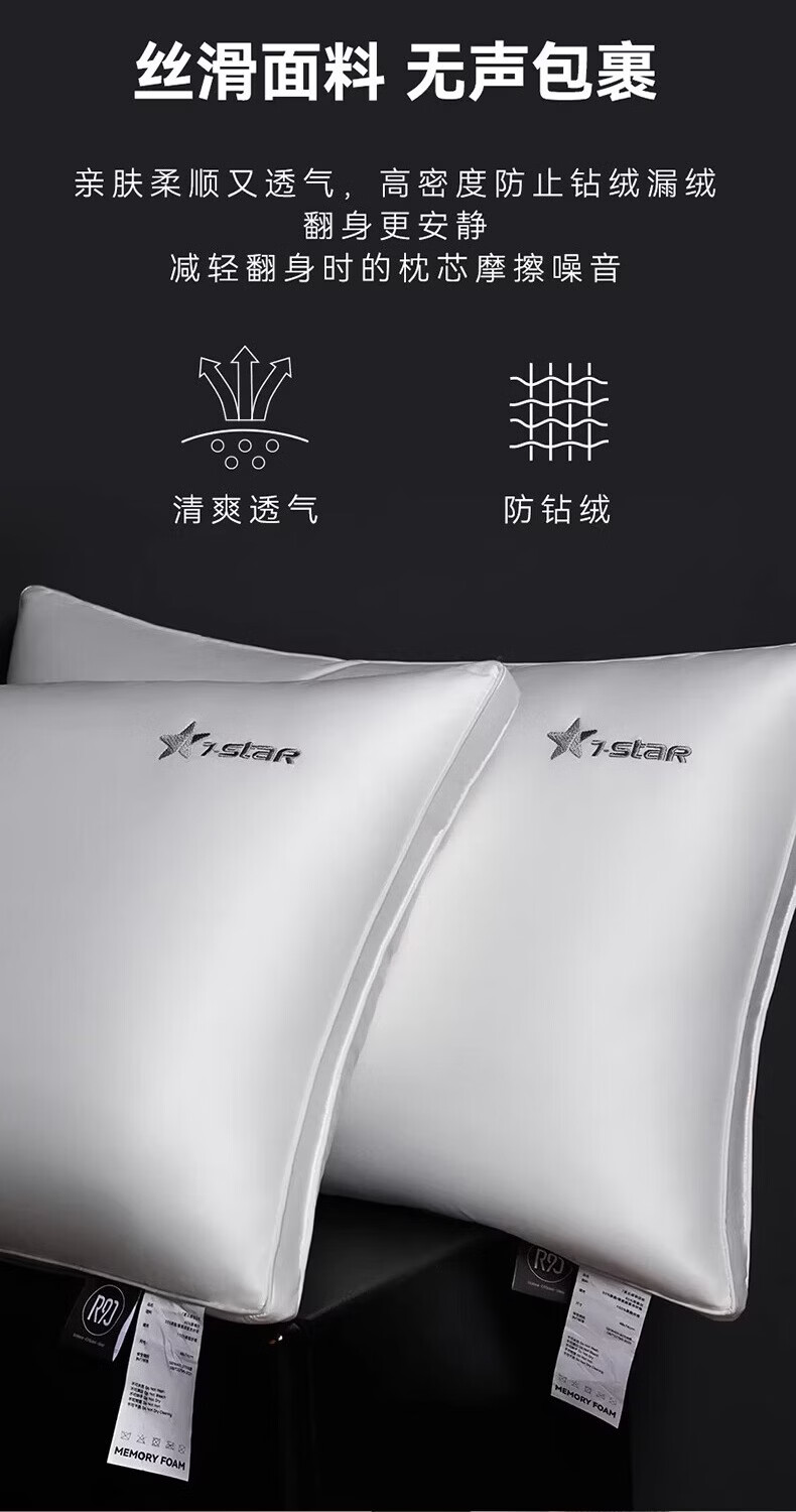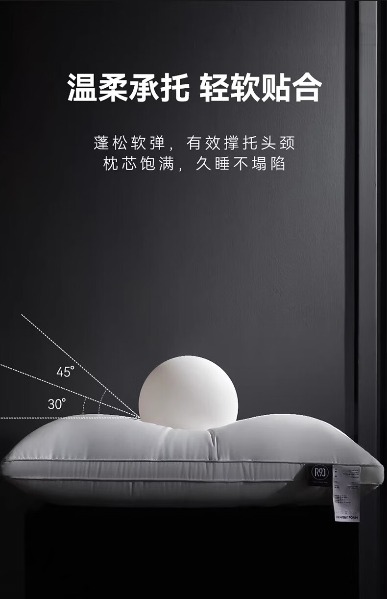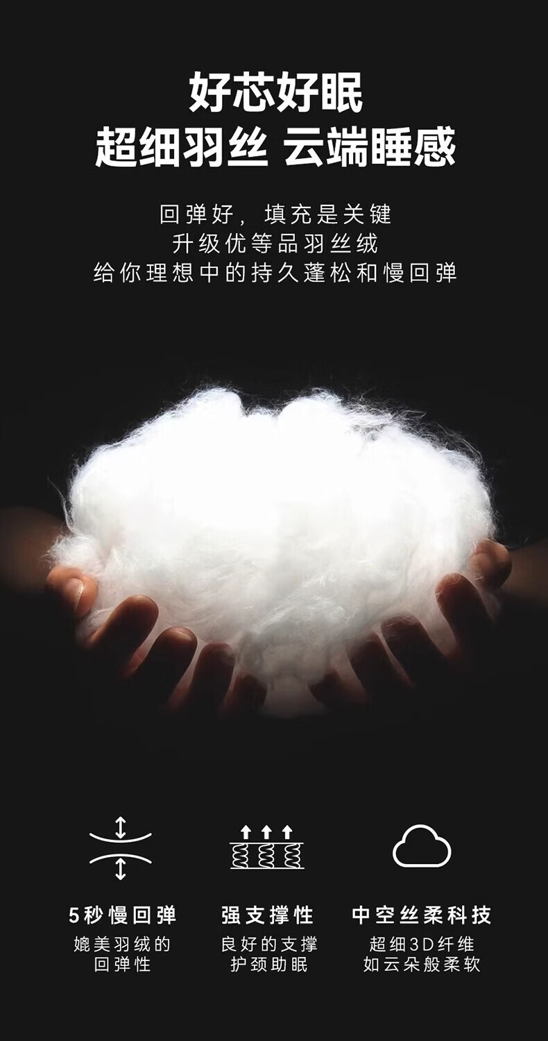 丝滑面料 无声包裹;亲肤柔顺又透气;翻身更安静,减轻翻身时的枕芯摩擦噪音;超细羽丝棉填充,5 秒慢回弹,强支撑护颈
