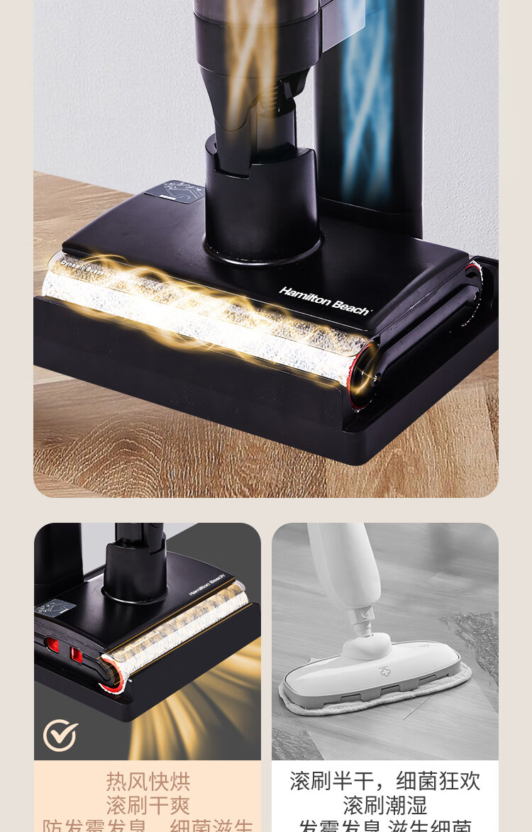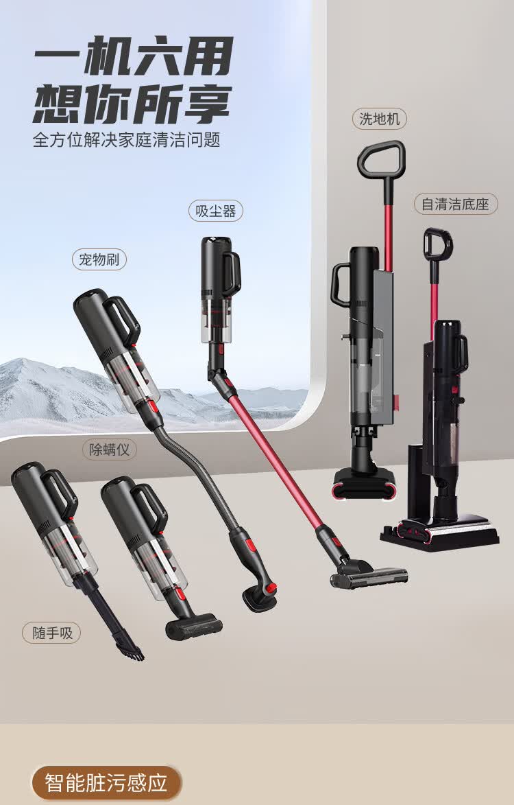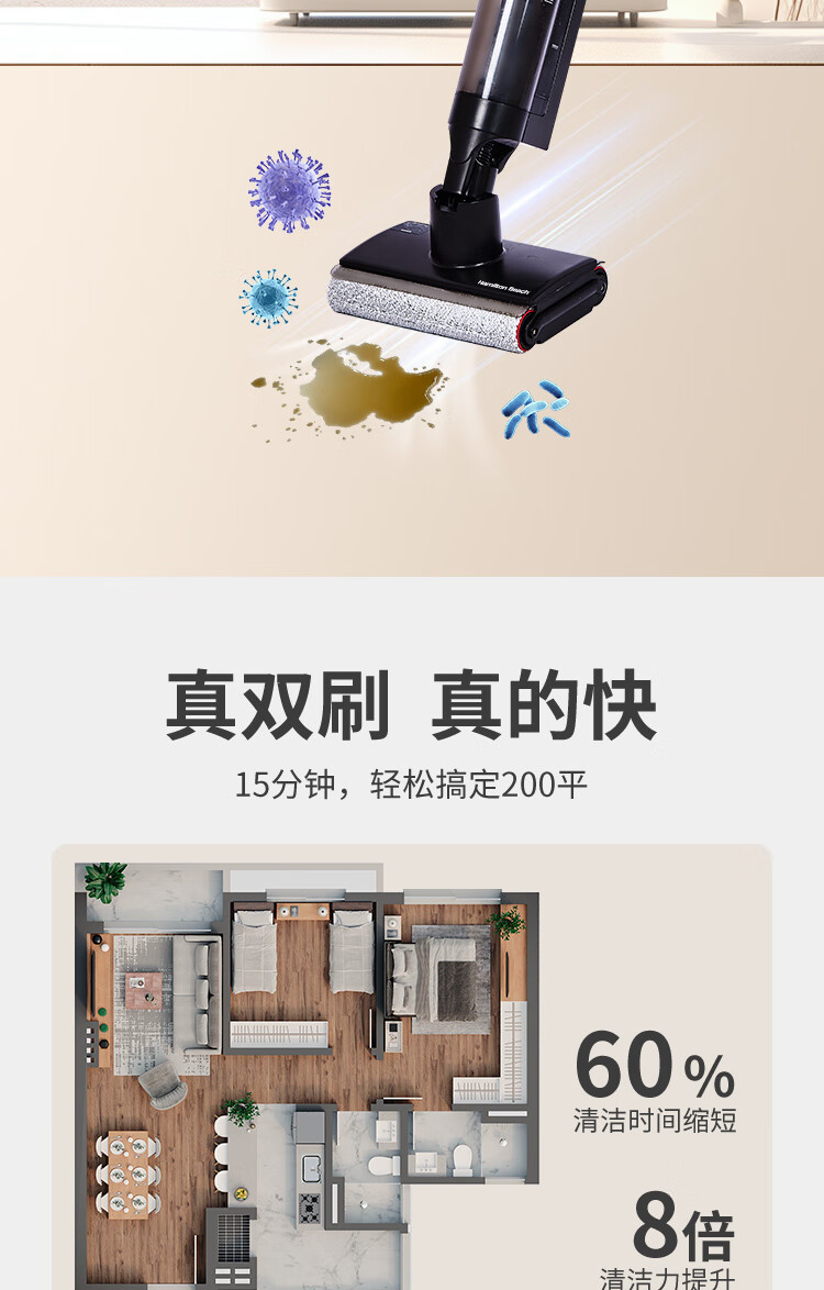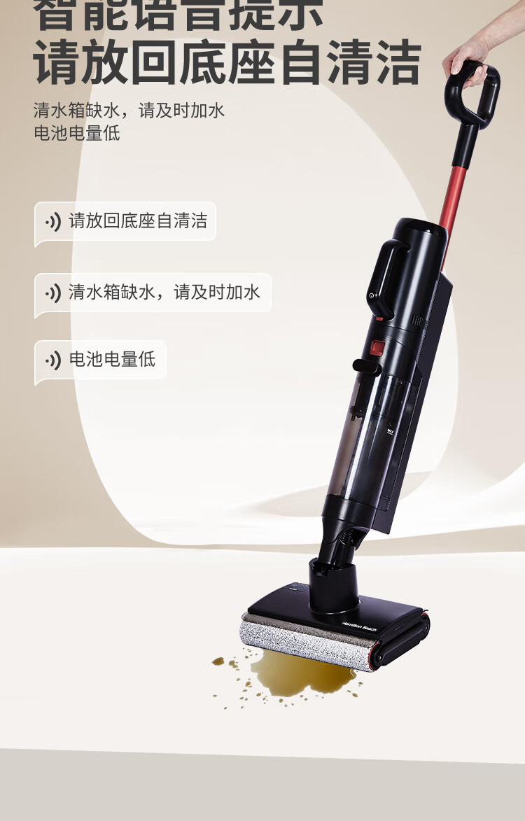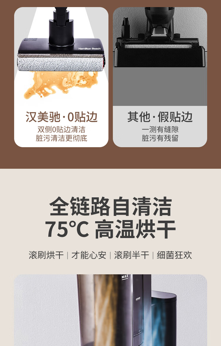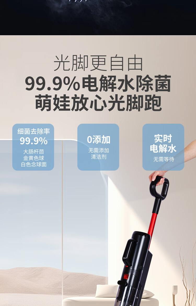 双侧0贴边清洁,脏污清洁更彻底;全链路自清洁,75℃高温烘干;人性化设计,智能语音提示;无刷大吸力电机,电解制水,除菌更高效;160°灵活转向,轻巧不费力