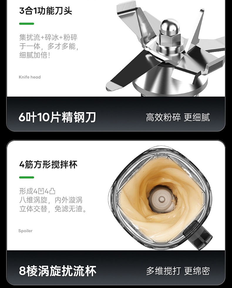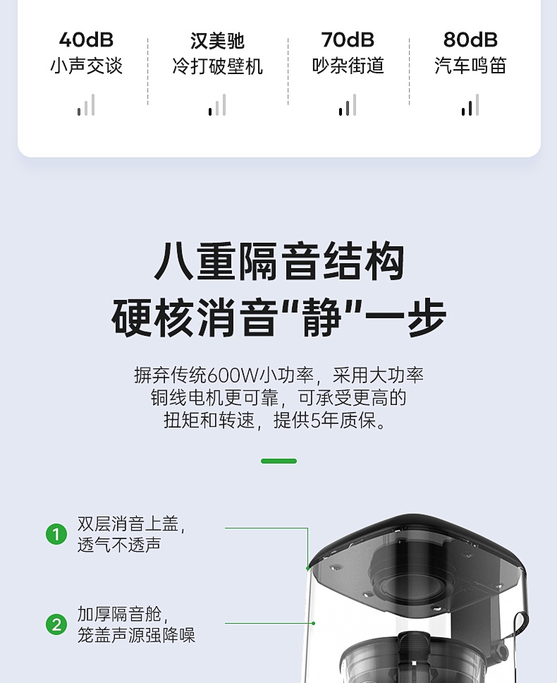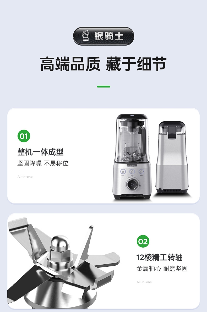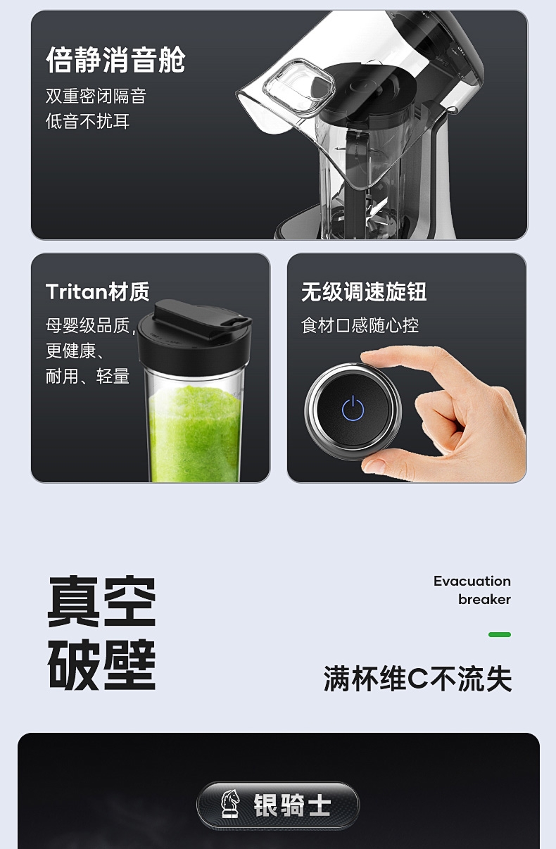 倍静消音仓,双重密闭隔音,低音不扰耳;真空锁鲜,25Kpa,负压大吸力,口感更顺滑;一机双杯,600ml便携式真空杯、存储时间更长更新;Tritan材质,母婴级品质;6叶10片精钢刀、三合一功能刀头,高效粉碎更细腻