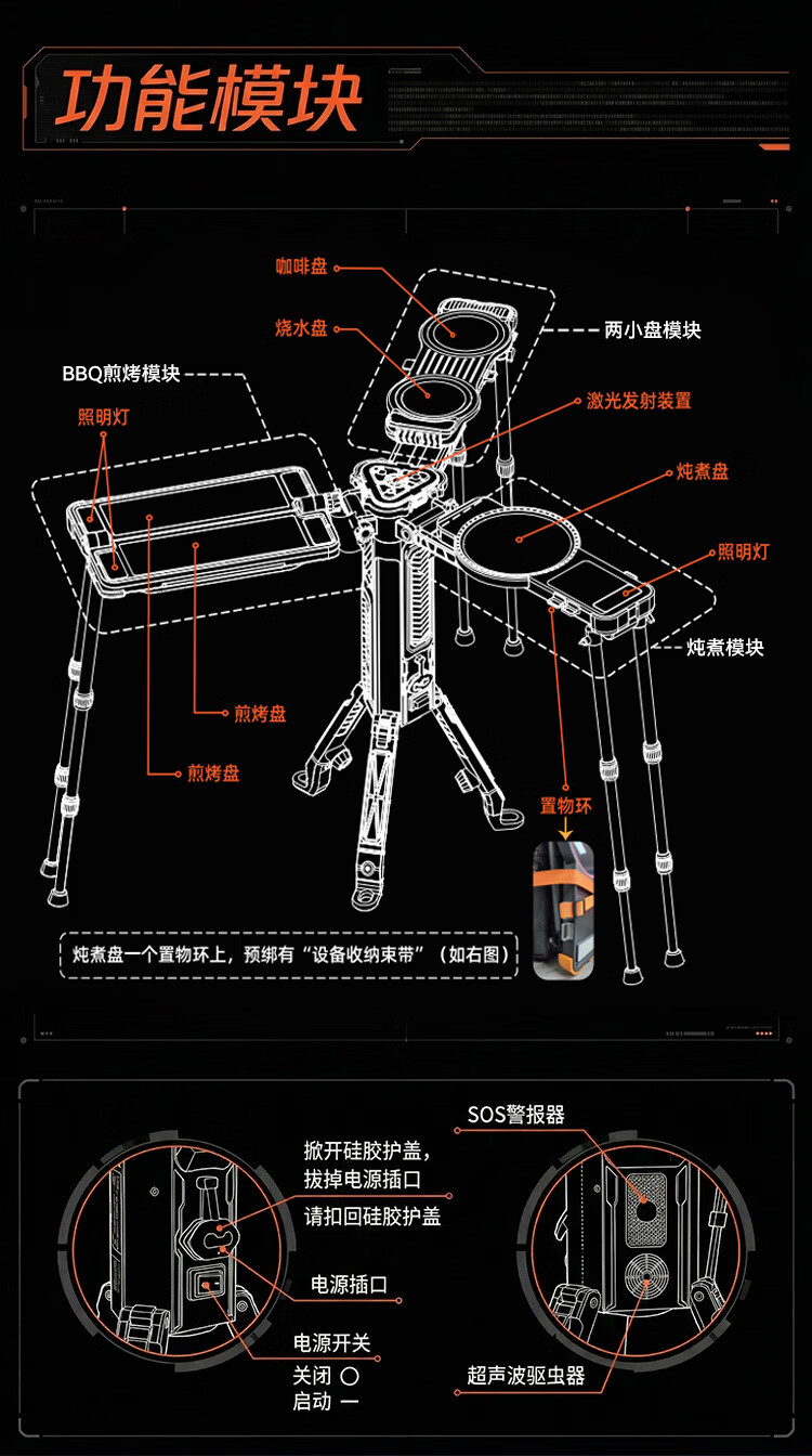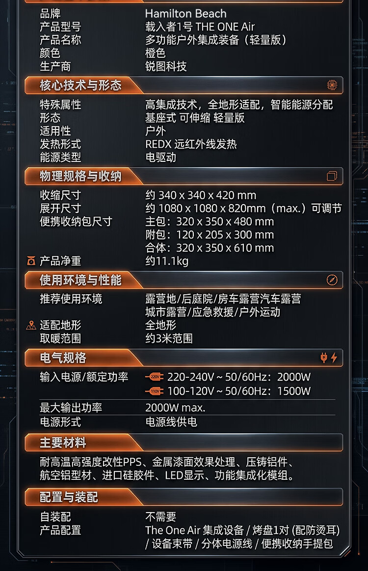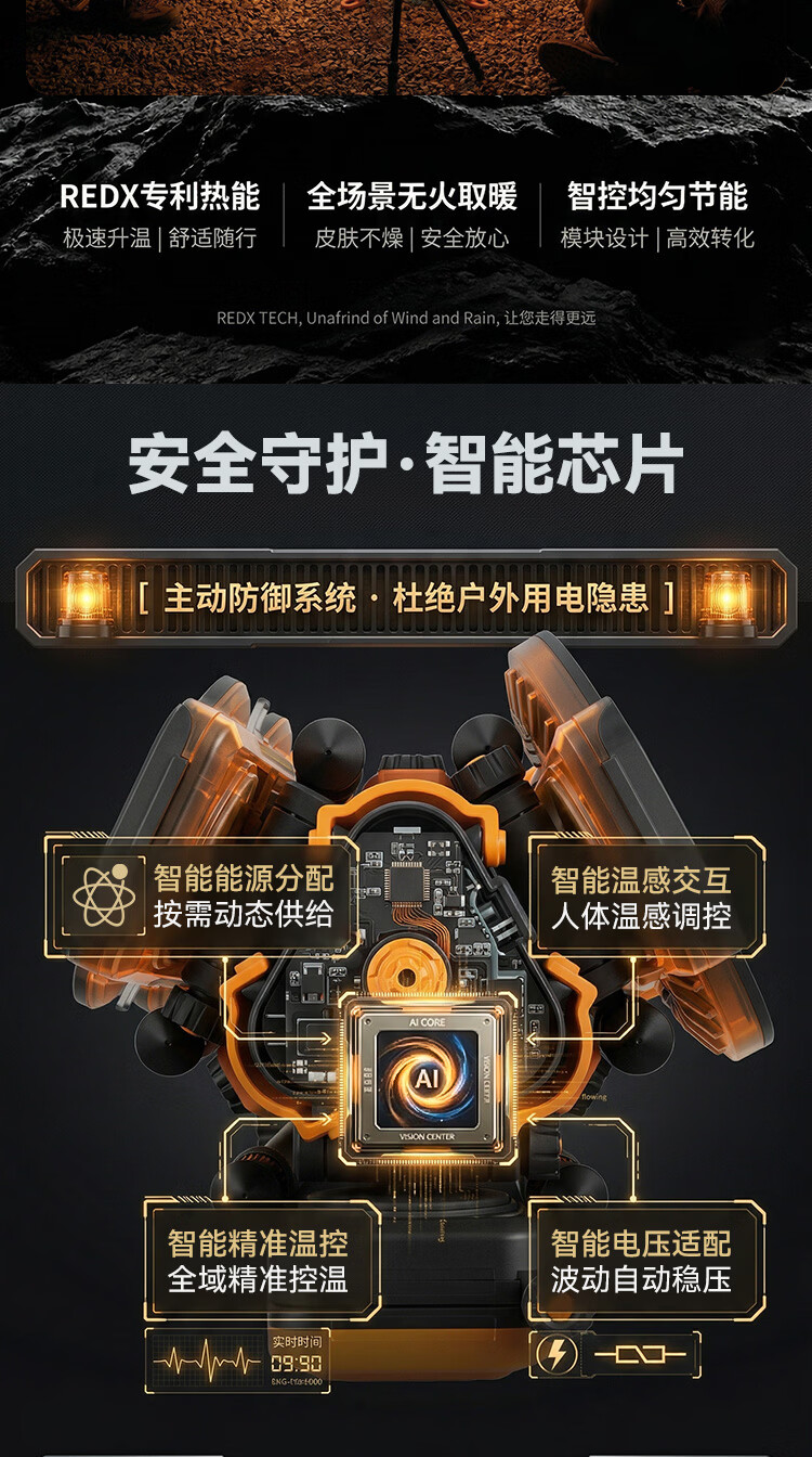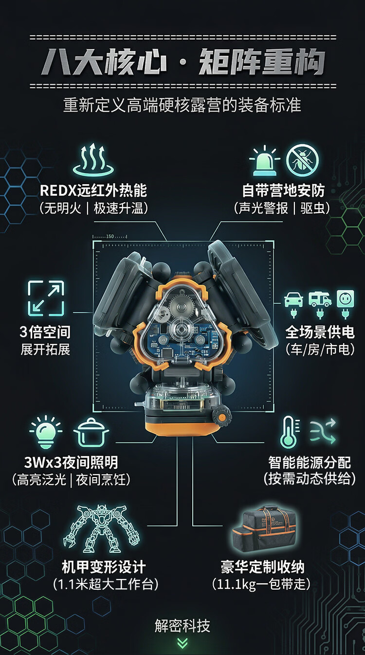 机甲万向结构,满足户外360度无死角取暖功能;9.6微米远红外热能技术,低能耗;REDX热能技术户外亦能定向取暖;激光镭射定位,求救发射;适配各种地形,旅行自由自在