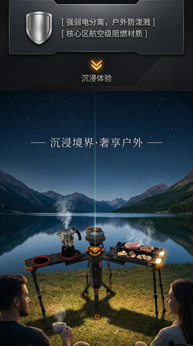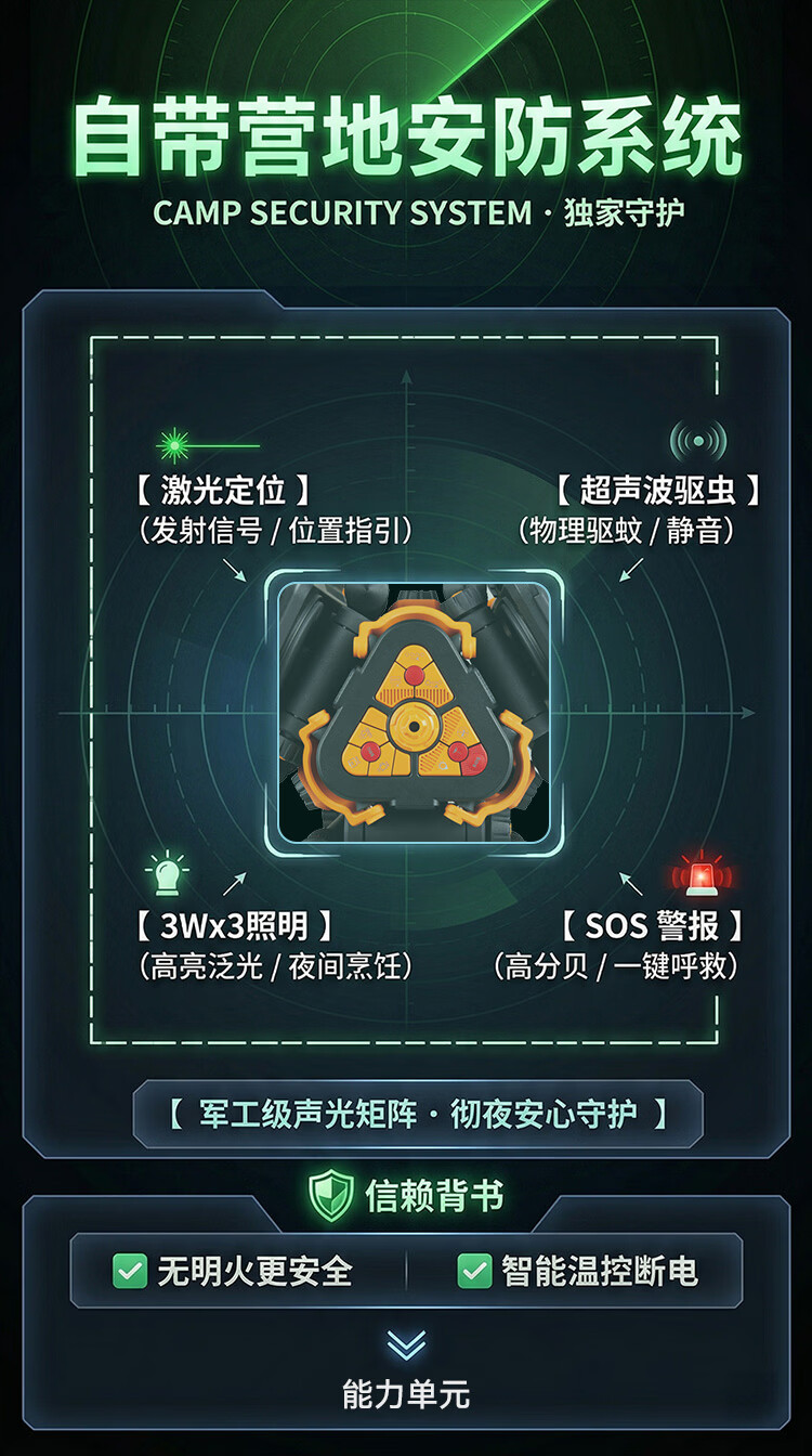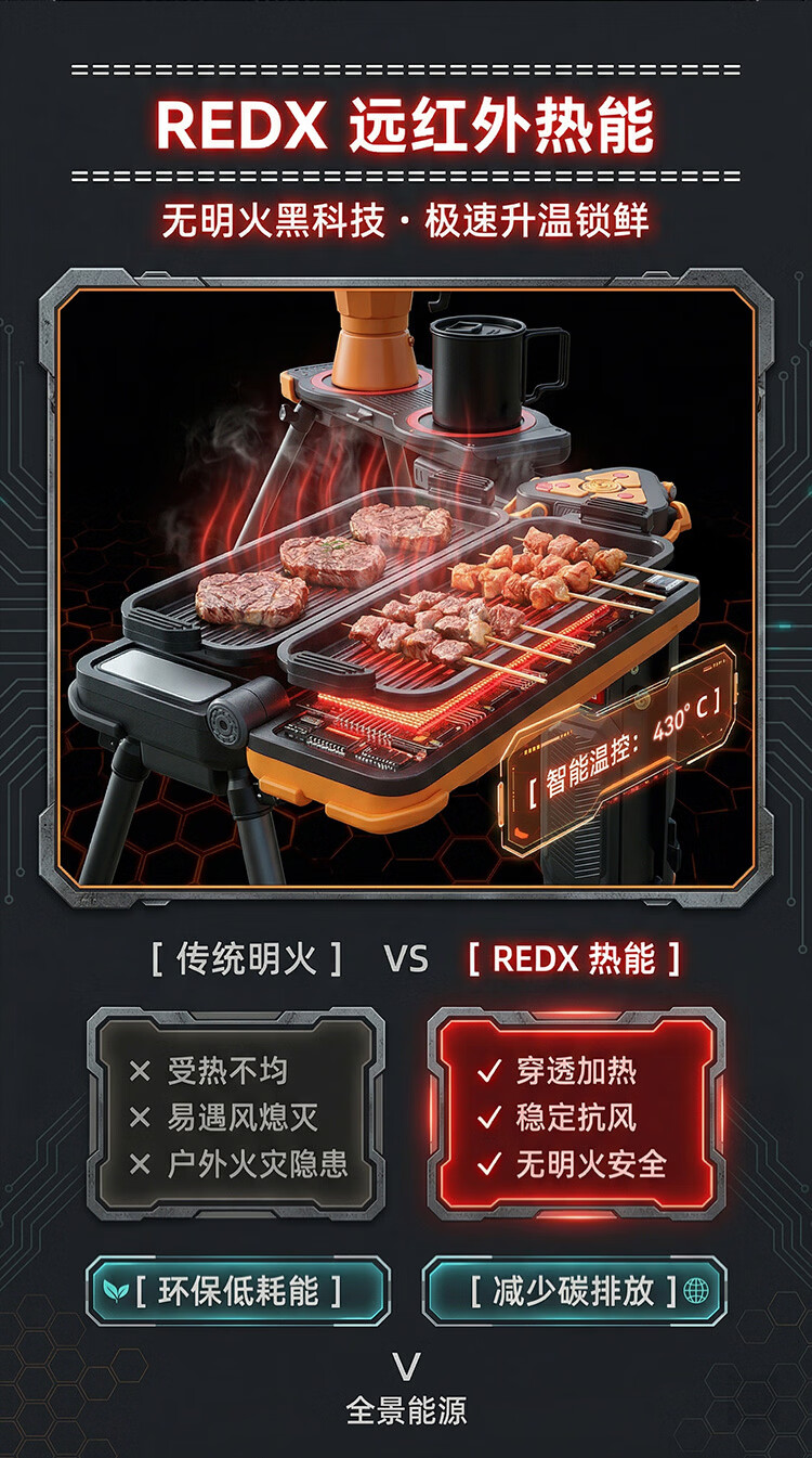 机甲万向结构,满足户外360度无死角取暖功能;9.6微米远红外热能技术,低能耗;REDX热能技术户外亦能定向取暖;激光镭射定位,求救发射;适配各种地形,旅行自由自在