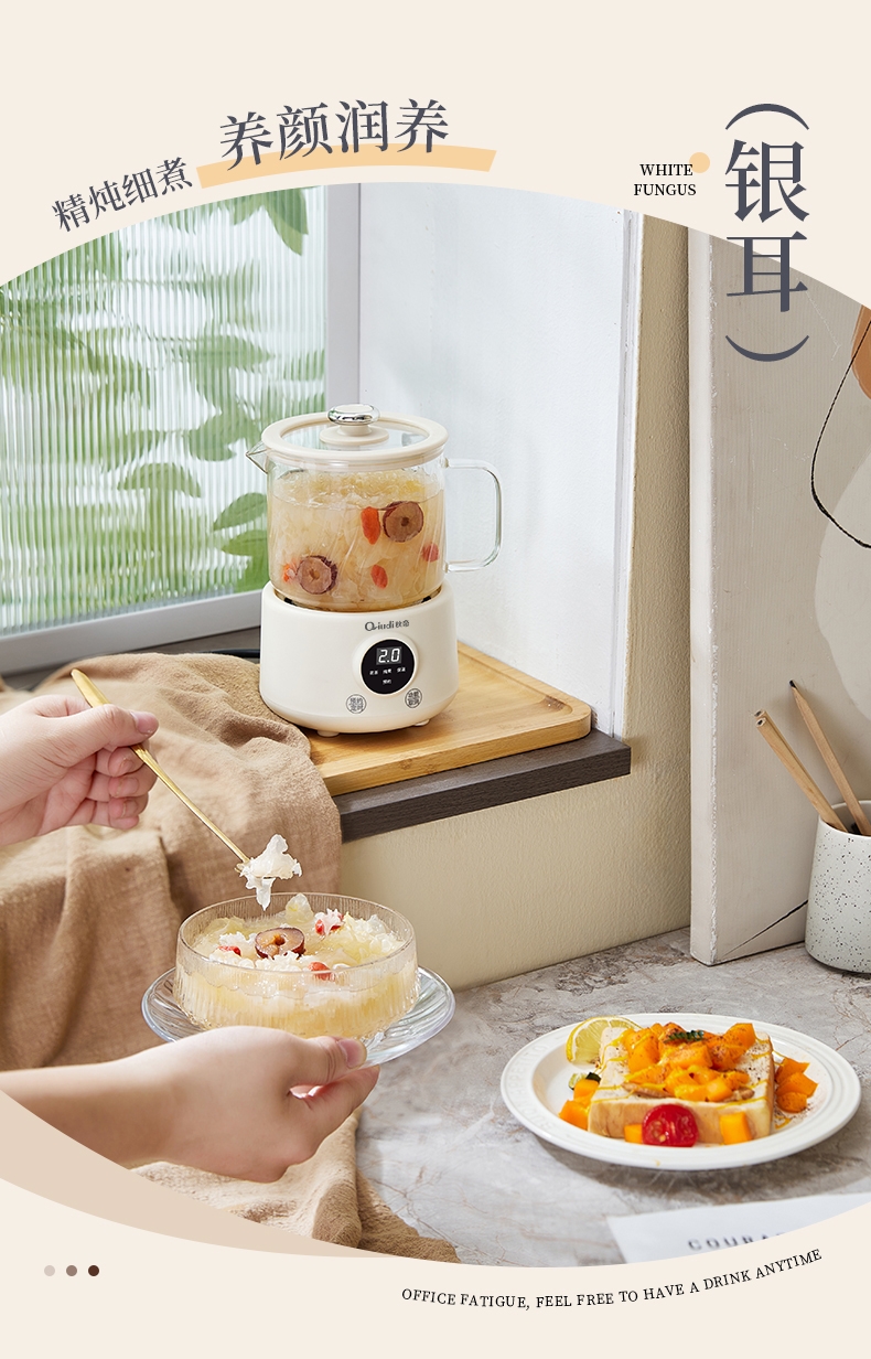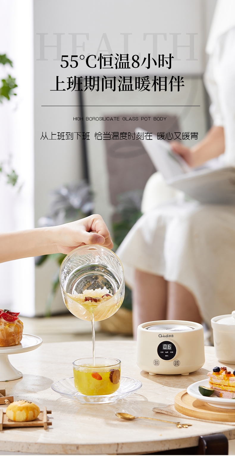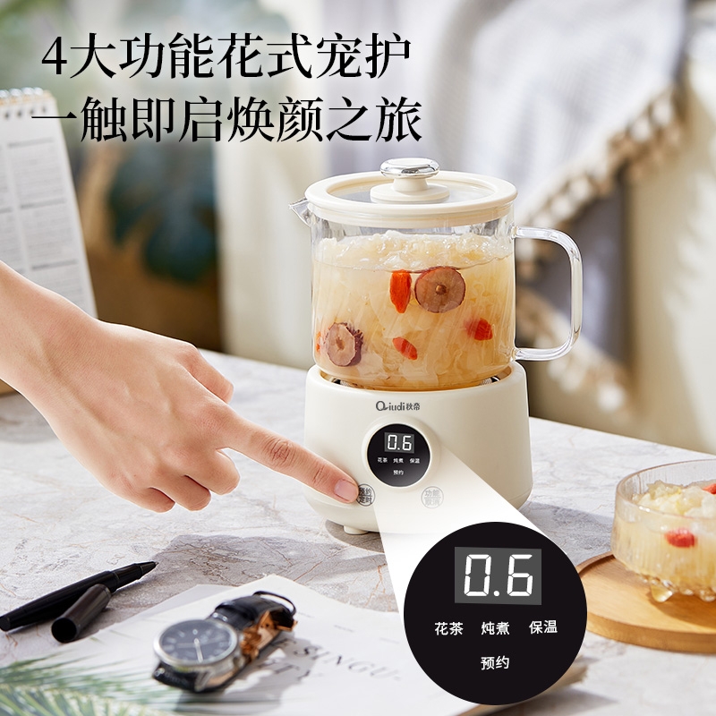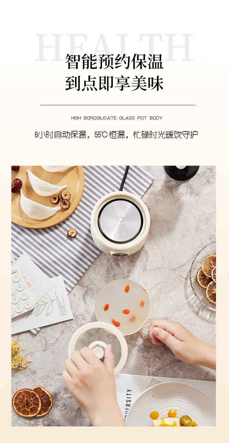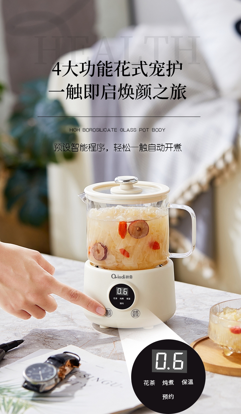一体成型玻璃壶,煮饮无硅胶无异味无金属无涂层更健康;一键式触控操作,一壶解锁花样养生炖煮自动保温全精通;智能预约保温,到点即享美味,上班忙碌时光暖心又暖胃;精致私享容量,精炖慢煮四季润养,办公居家随时来一杯;壶与低分体式设计,提杯即饮清洗方便打造专属养生空间