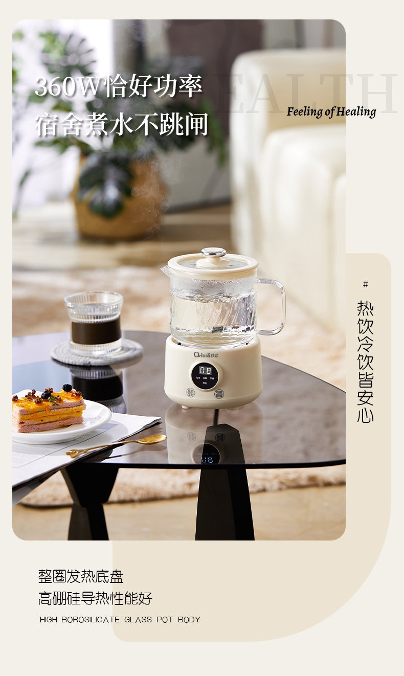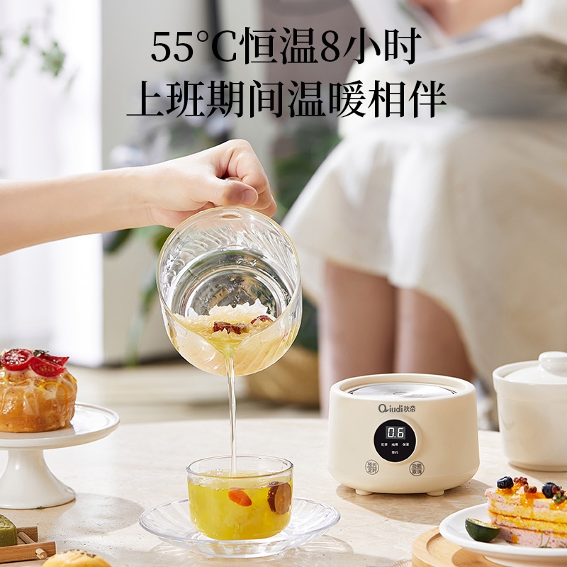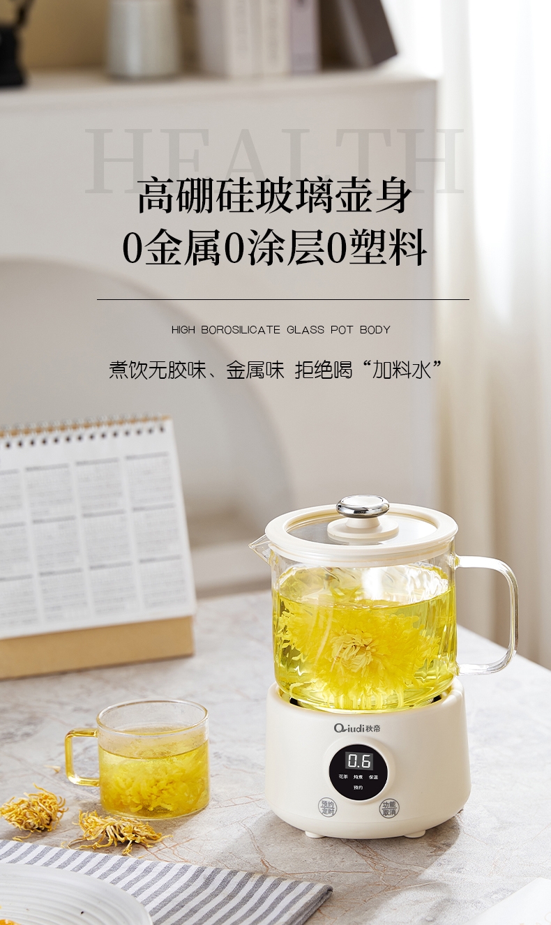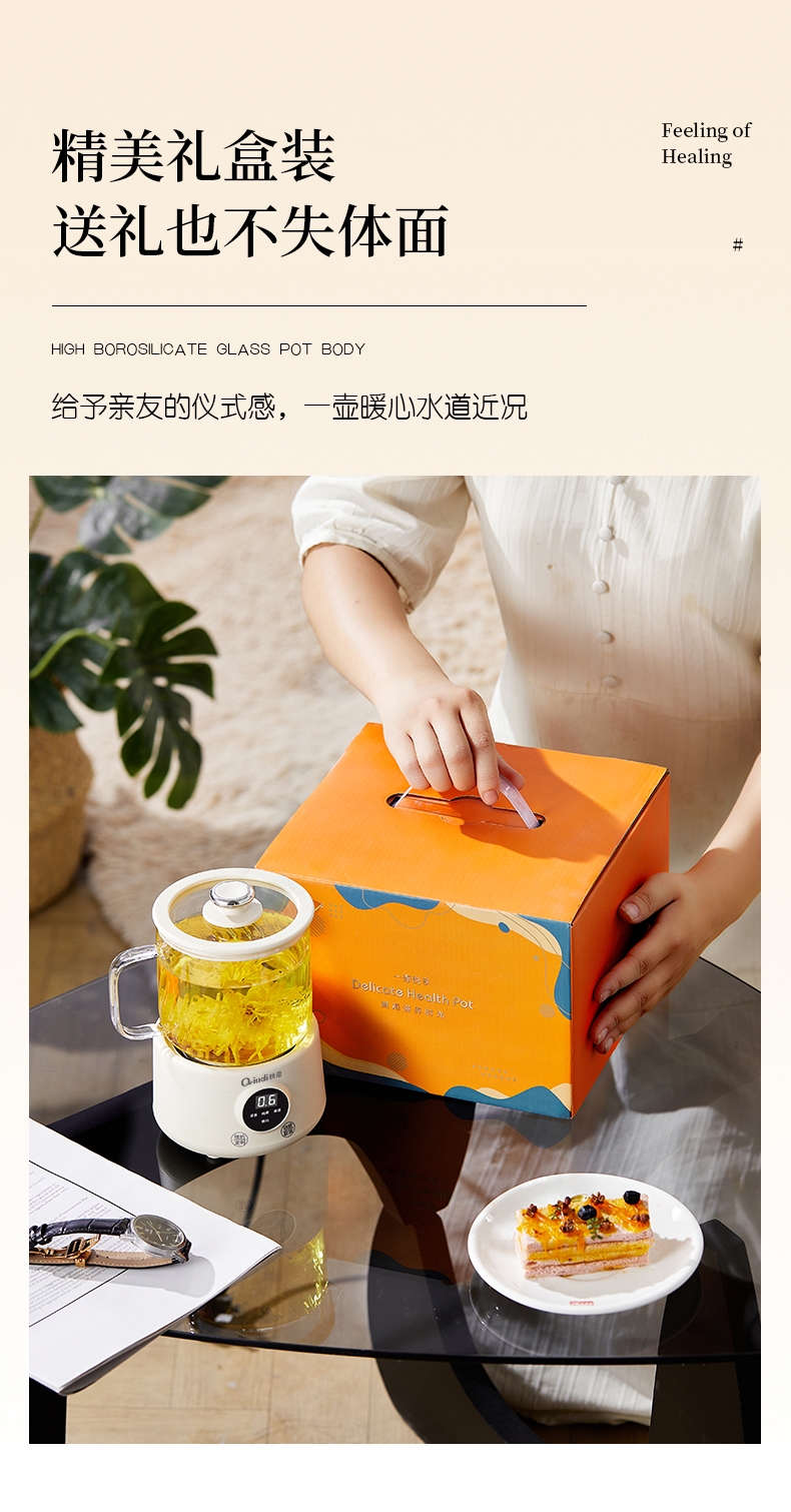 一体成型玻璃壶,煮饮无硅胶无异味无金属无涂层更健康;一键式触控操作,一壶解锁花样养生炖煮自动保温全精通;智能预约保温,到点即享美味,上班忙碌时光暖心又暖胃;精致私享容量,精炖慢煮四季润养,办公居家随时来一杯;壶与低分体式设计,提杯即饮清洗方便打造专属养生空间