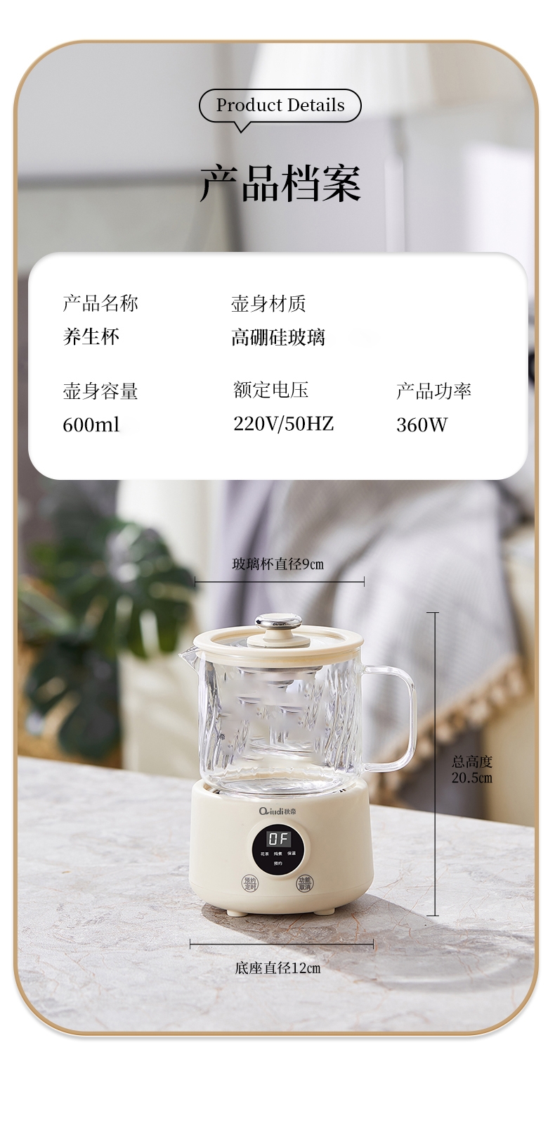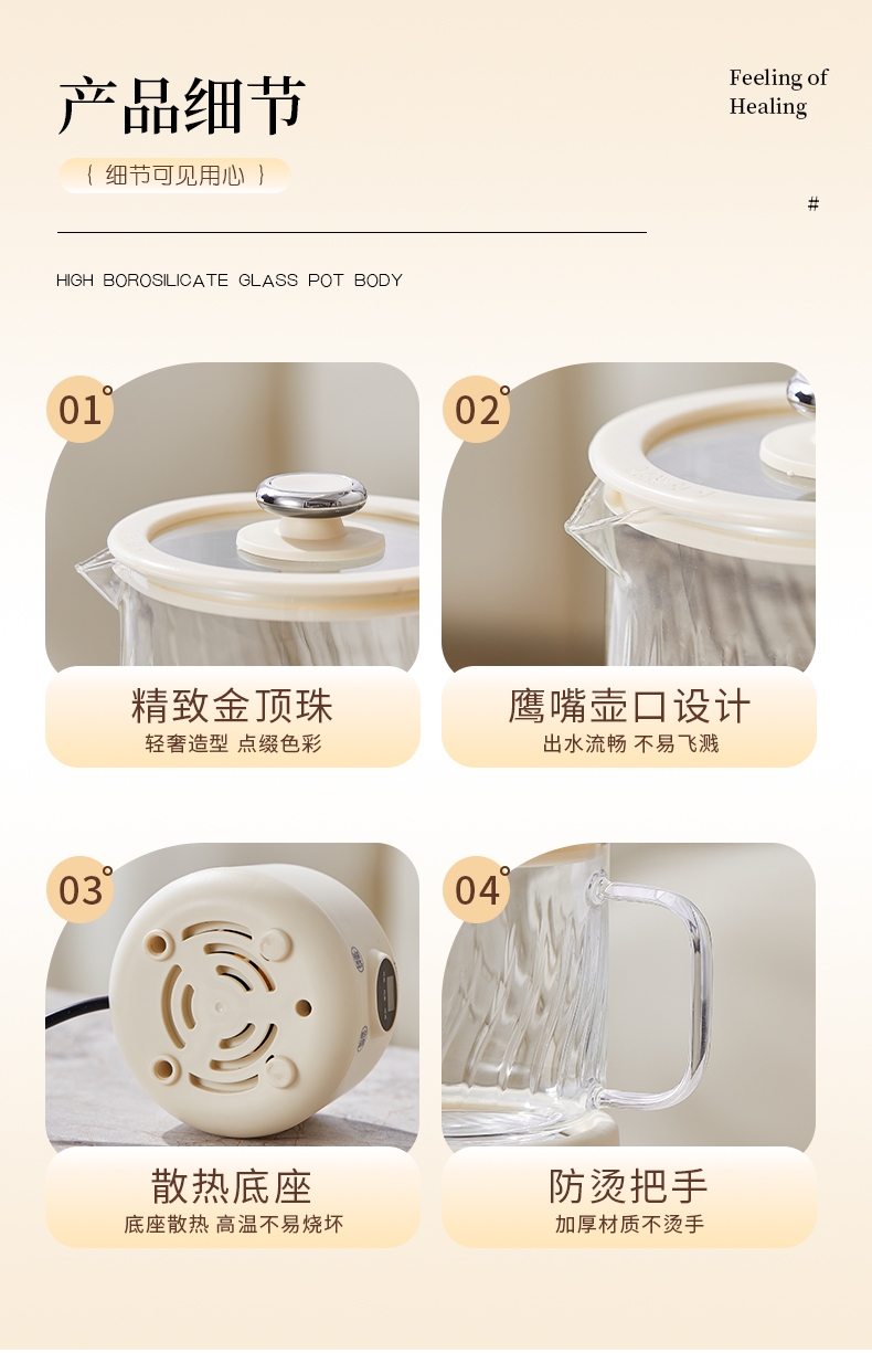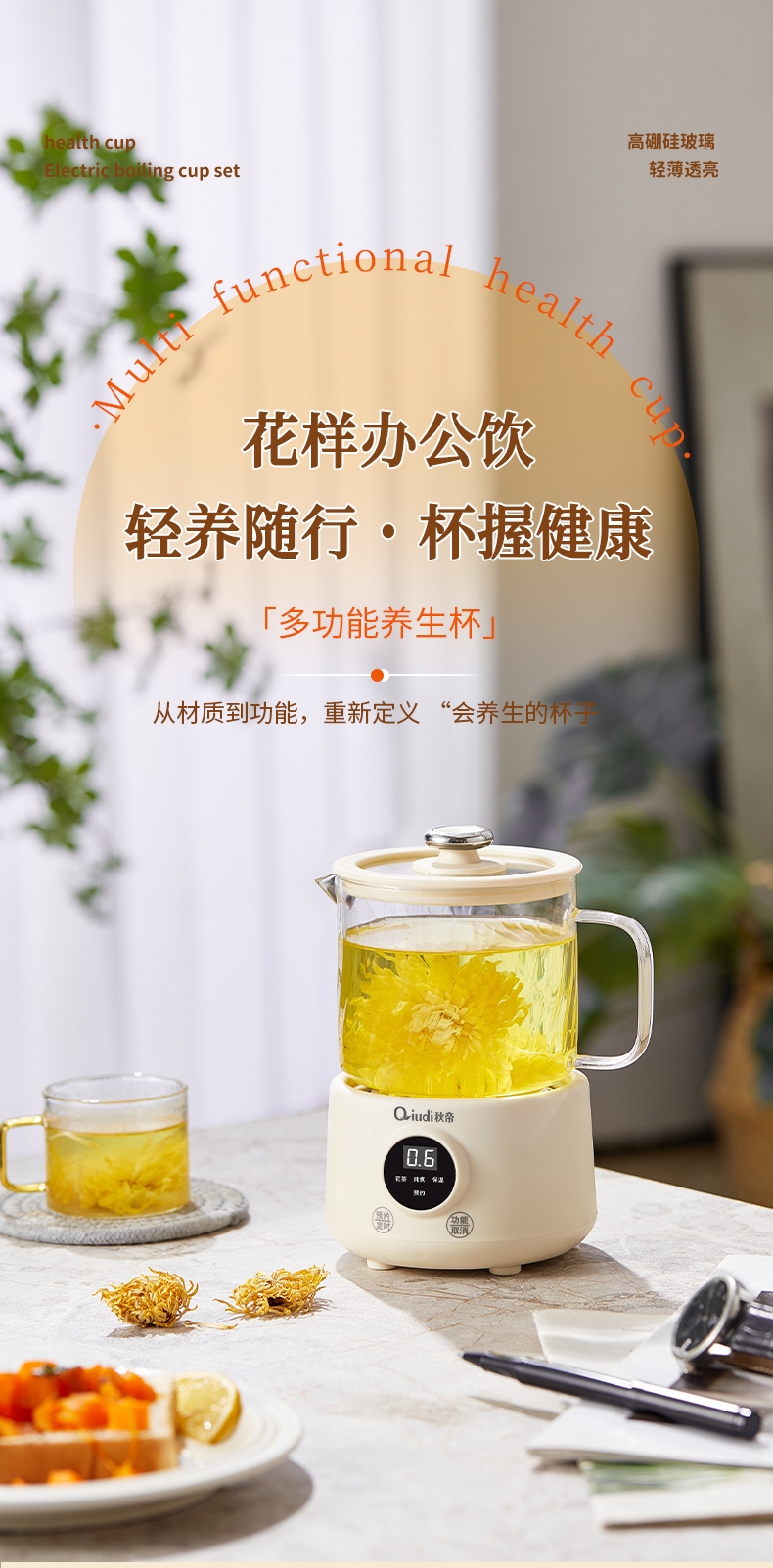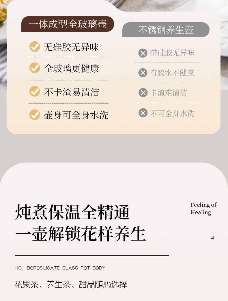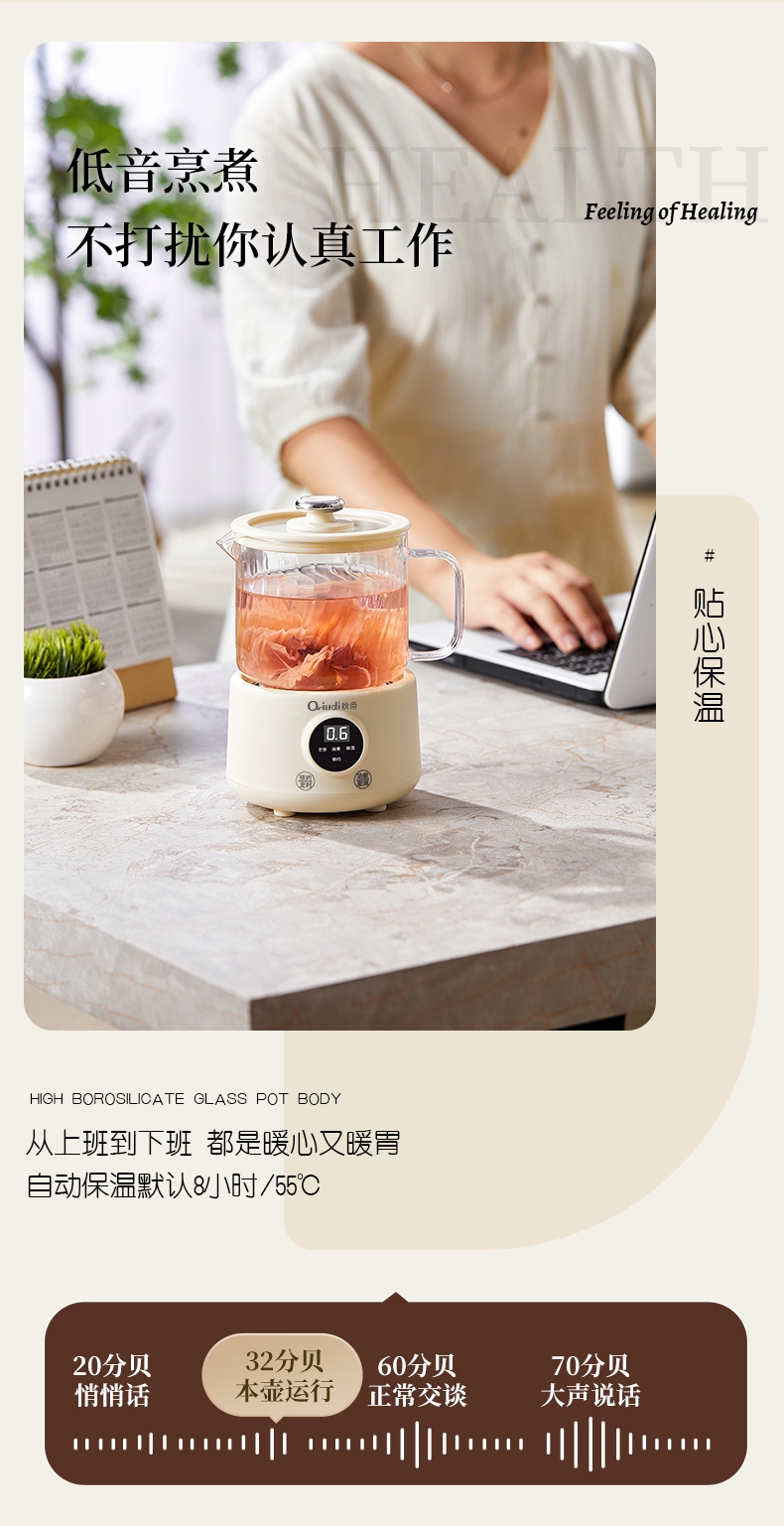 一体成型玻璃壶,煮饮无硅胶无异味无金属无涂层更健康;一键式触控操作,一壶解锁花样养生炖煮自动保温全精通;智能预约保温,到点即享美味,上班忙碌时光暖心又暖胃;精致私享容量,精炖慢煮四季润养,办公居家随时来一杯;壶与低分体式设计,提杯即饮清洗方便打造专属养生空间