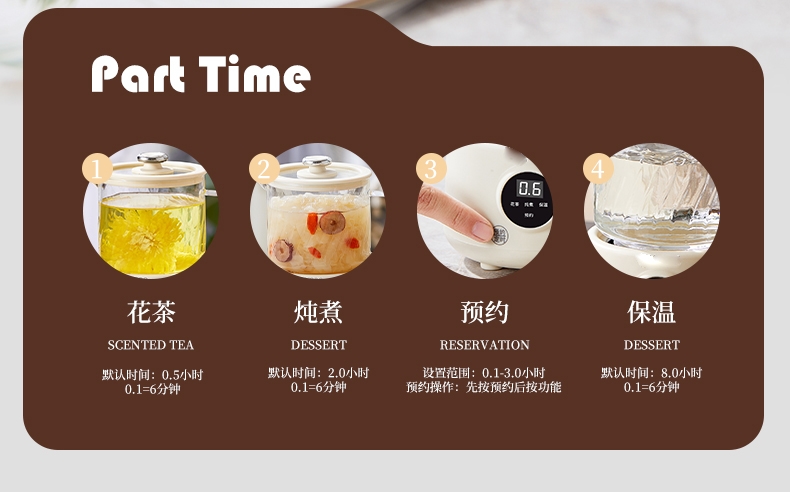 功能:烧水/花茶/保温/预约/炖品/甜品