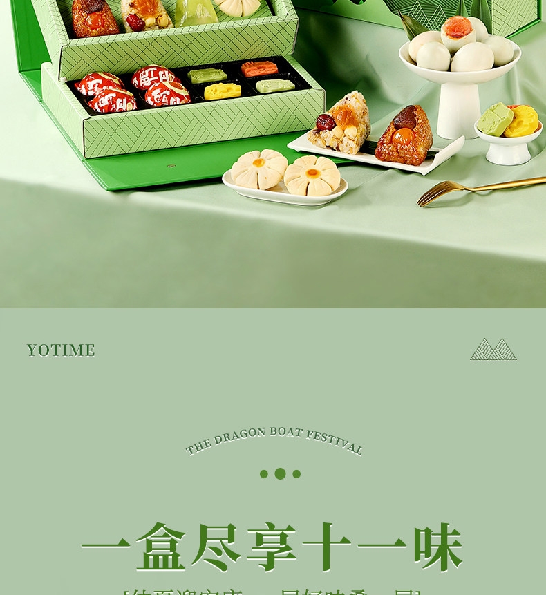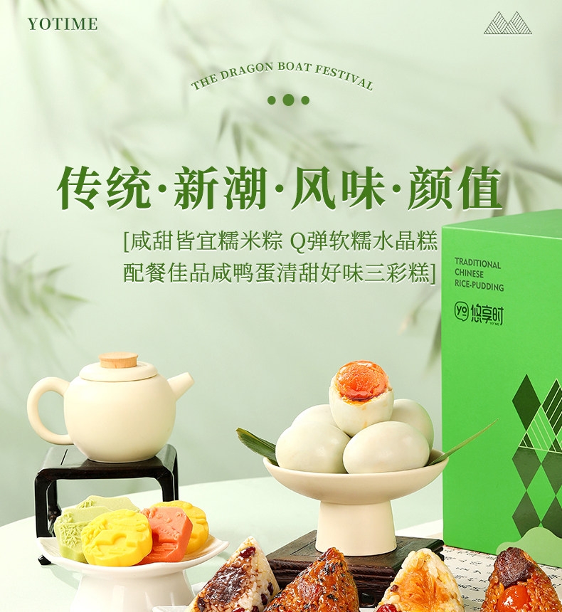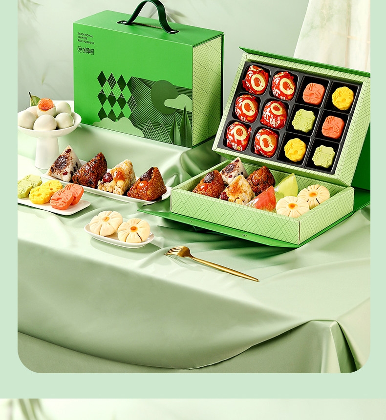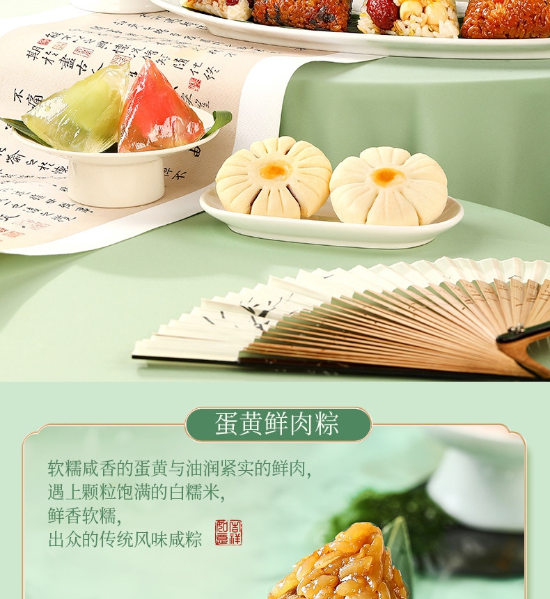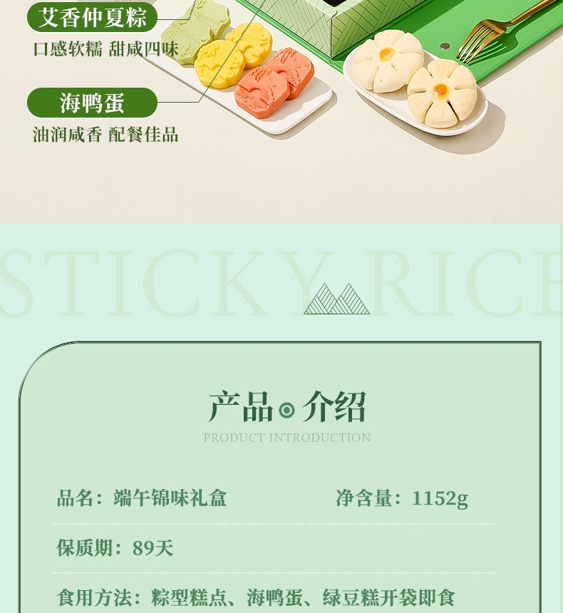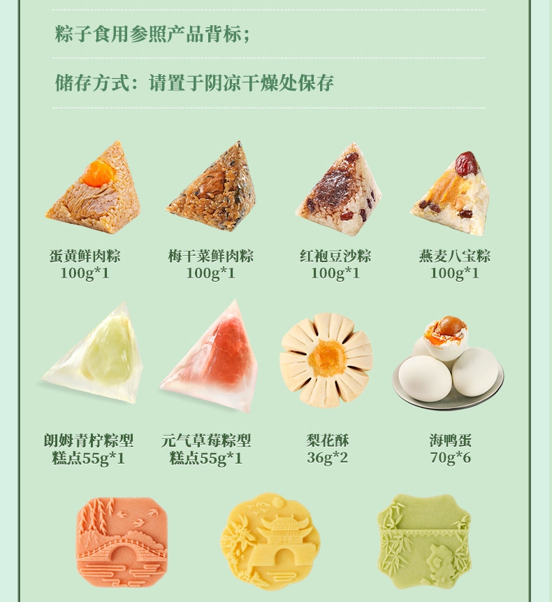 配置:蛋黄鲜肉粽子100g*1 梅干菜鲜肉粽子100g*1 艾草豆沙粽子100g*1 燕麦八宝粽子100g*1 朗姆青柠粽型糕点55g*1 元气草莓粽型糕点55g*1 唐风宋点-空山龙井味糕点25g*2 唐风宋点-红尘茉莉味糕点25g*2 唐风宋点-青松白茶味糕点25g*2 奶香芋泥花型酥糕点36g*2 海鸭蛋(熟制)70g*6