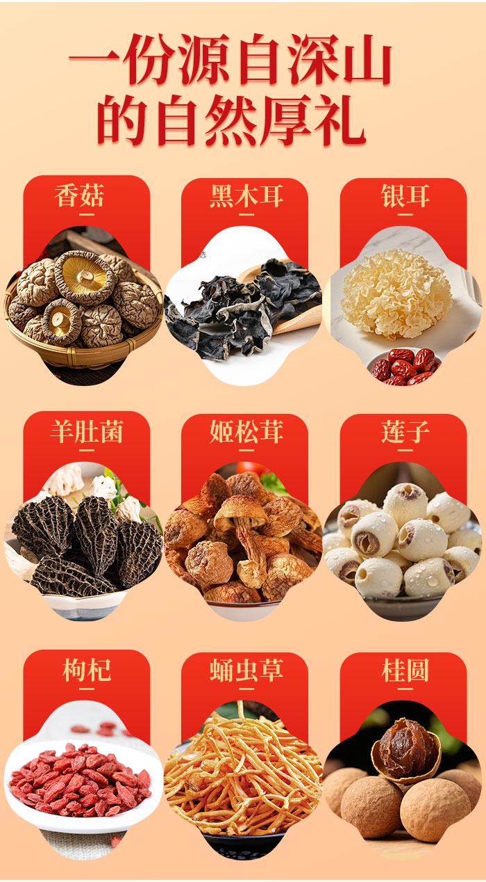 配置清单:古松香菇48g1 古松黑木耳50g1 古松银耳80g1 古松羊肚菌(罐)16g1 古松桂圆400g1 古松莲子(罐装)200g1 古松枸杞80g1 古松蛹虫草100g1 古松姬松茸(罐)30g1 古松山珍菌菇红礼盒个1