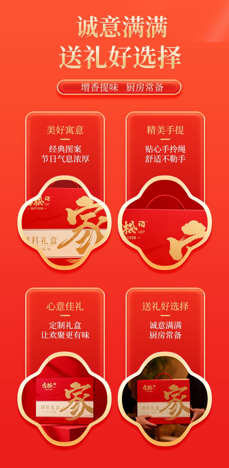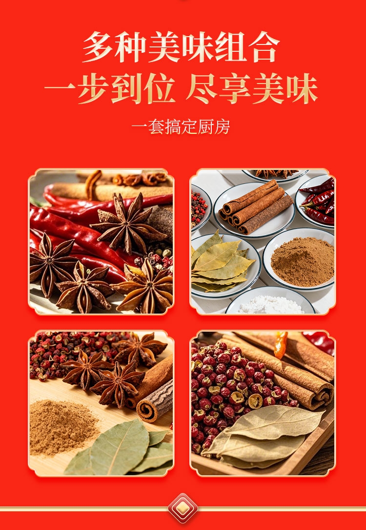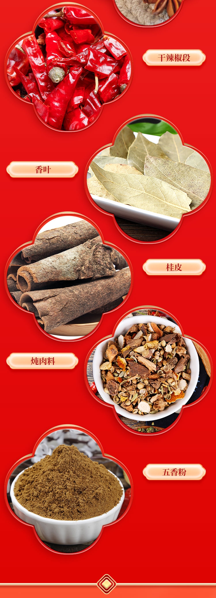 配置清单:古松带嘴马铃薯淀粉200g1 古松绵白糖(新)300g1 古松花椒50g1 古松大料30g1 古松干辣椒段50g1 古松香叶15g1 古松桂皮50g1 古松炖(卤)肉调料30g1 古松五香粉30g1 古松调料礼盒个1