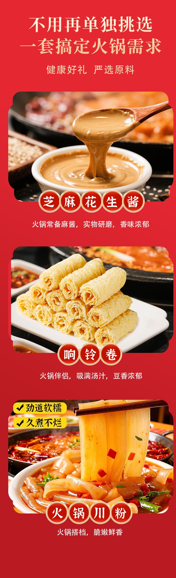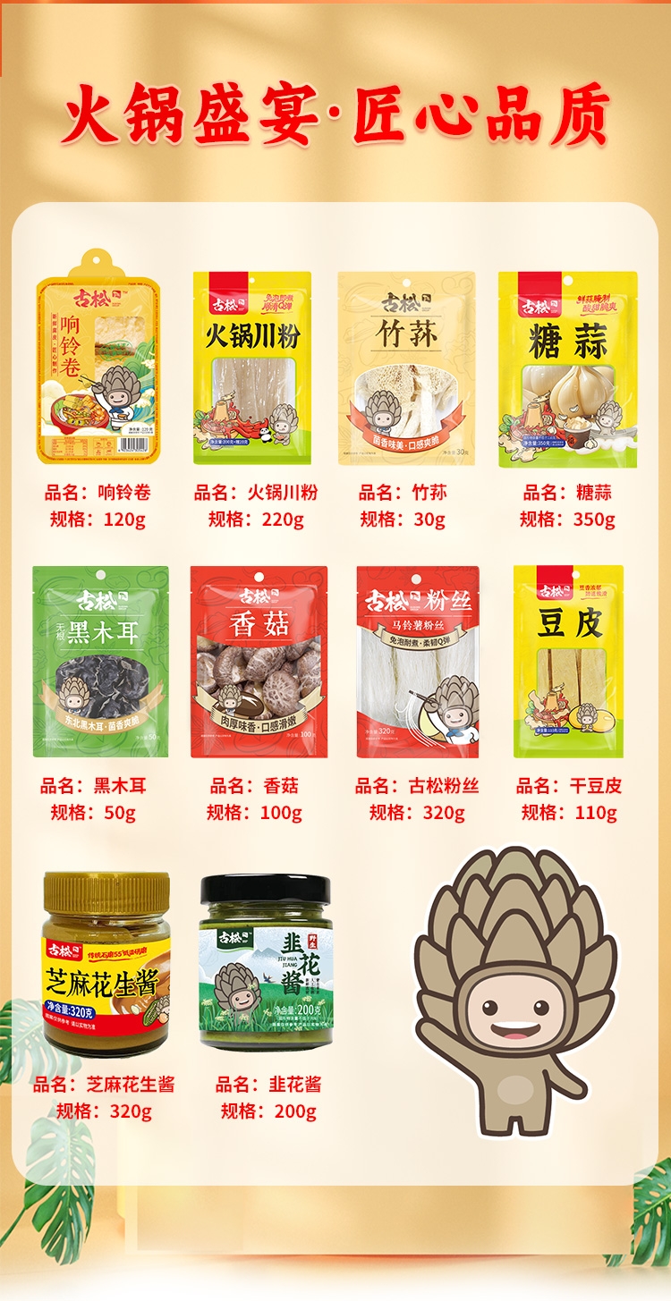 配置清单:古松响铃卷120g1 古松火锅川粉220g1 古松竹荪30g1 古松糖蒜350g1 古松黑木耳50g1 古松香菇100g1 古松粉丝320g1 古松干豆皮110g1 古松芝麻花生酱320g1 古松韭花酱200g1 古松火锅食材礼盒个1