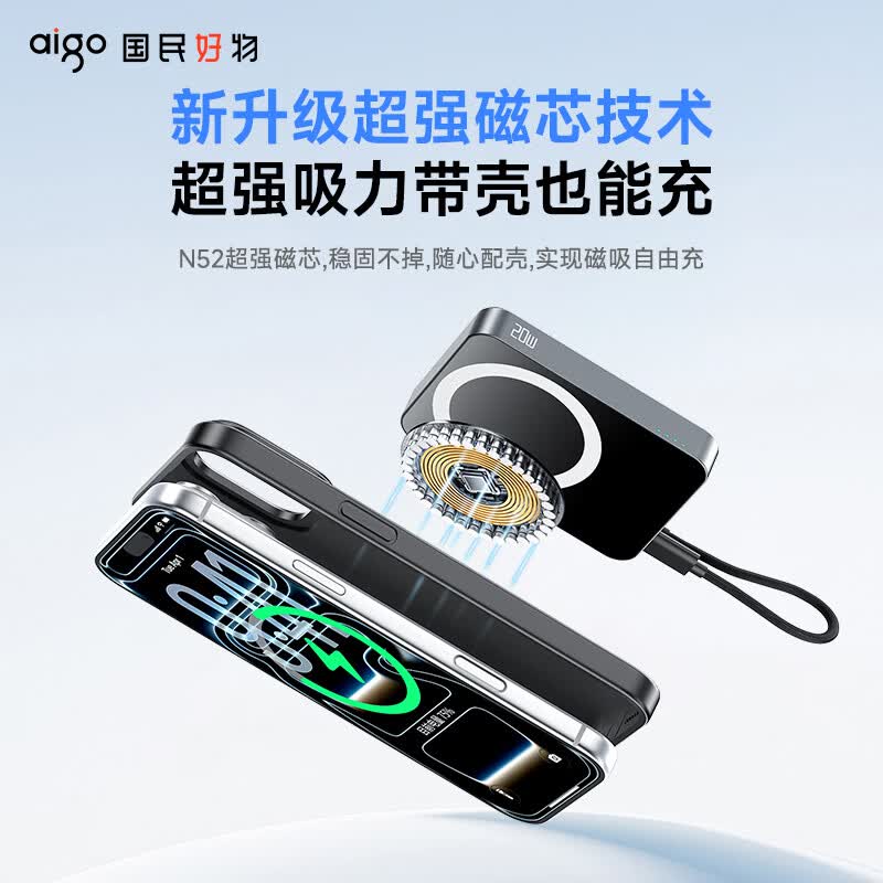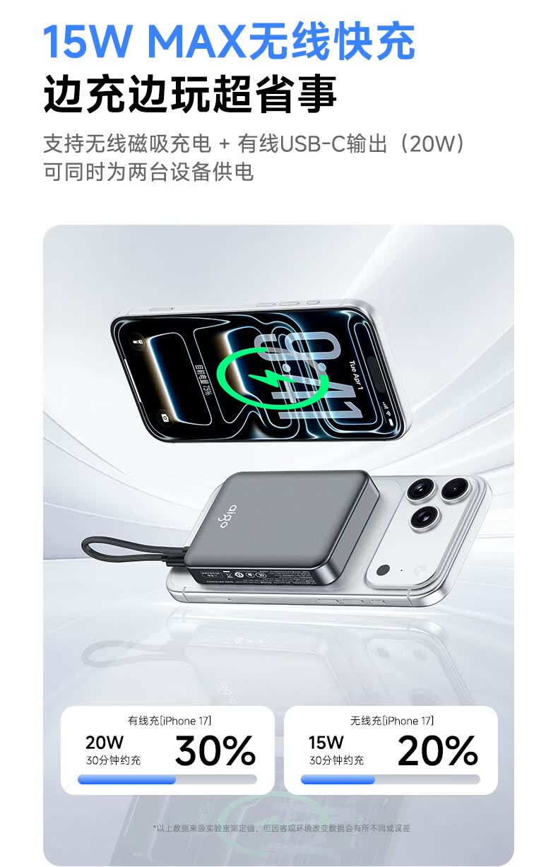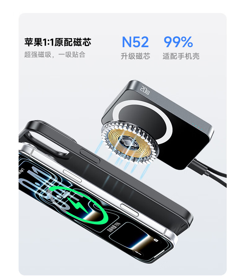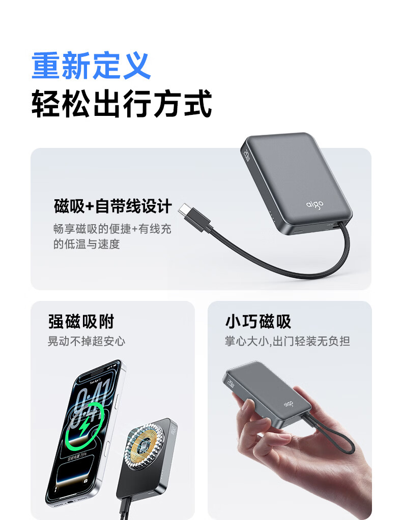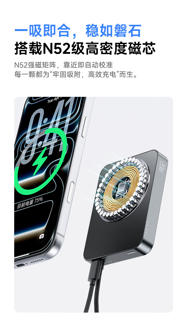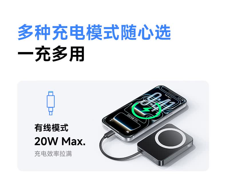 3C认证可上飞机;磁吸自带线;20W快充超薄便携