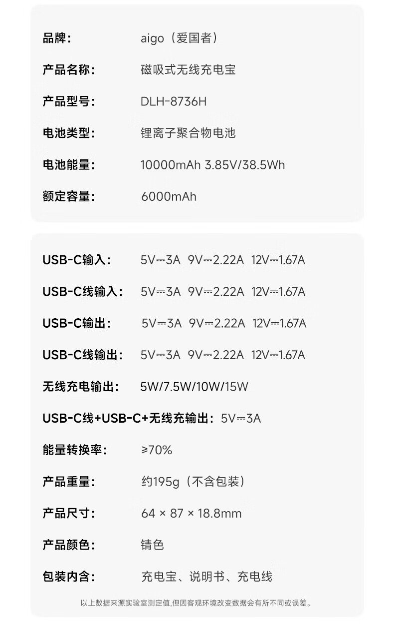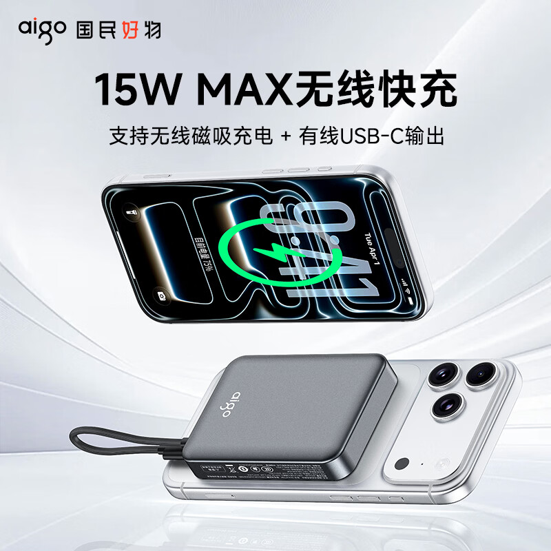 爱国者 3C认证充电宝无线磁吸自带线DLH-8736H