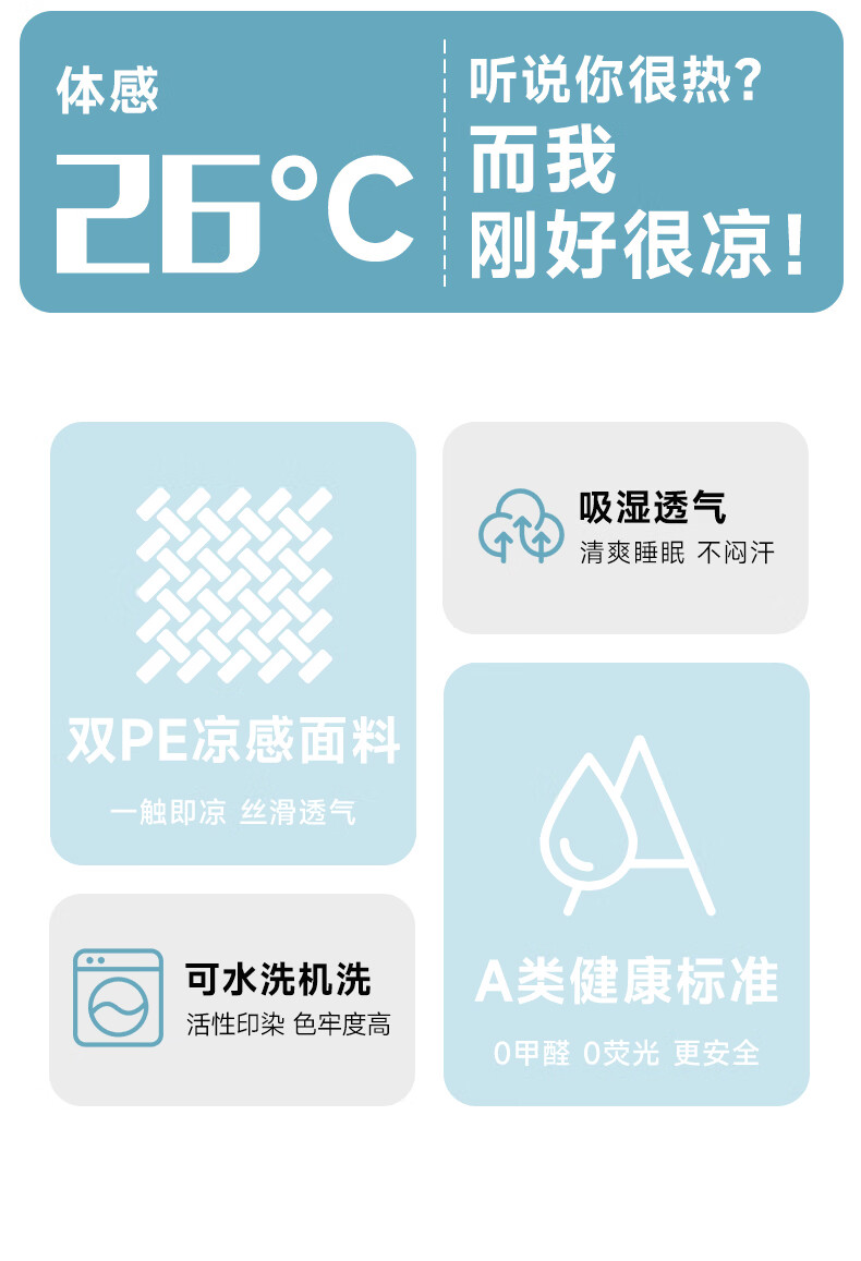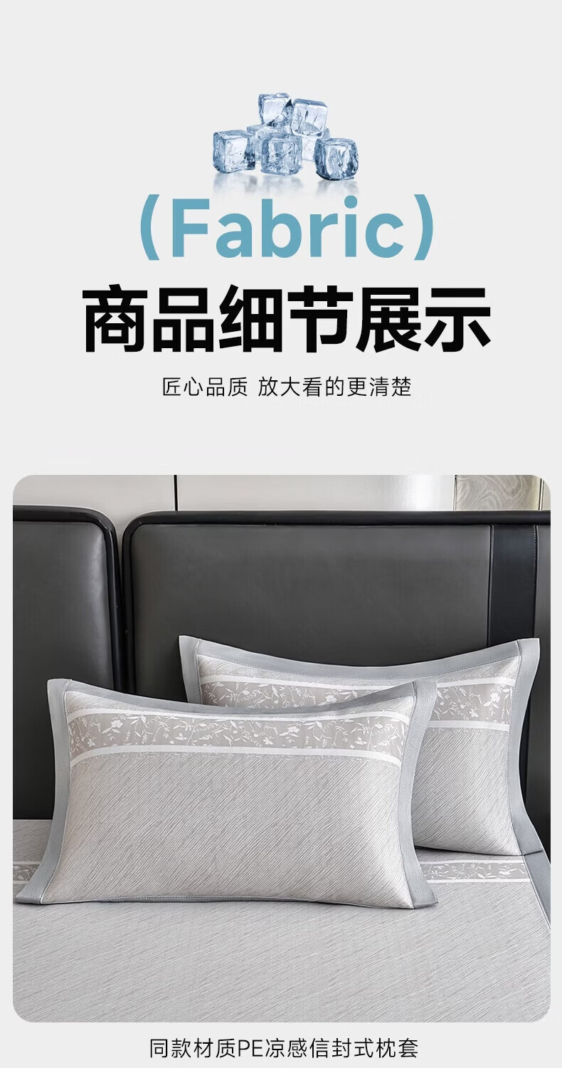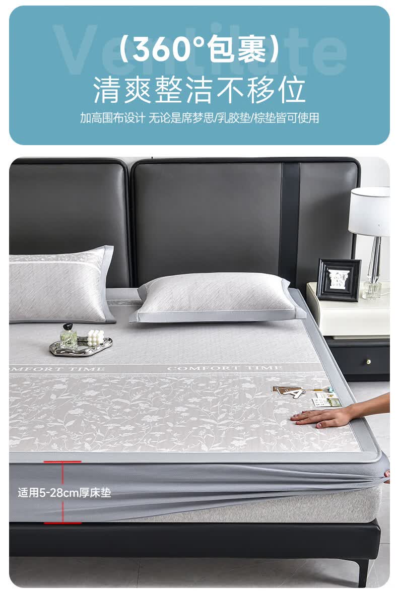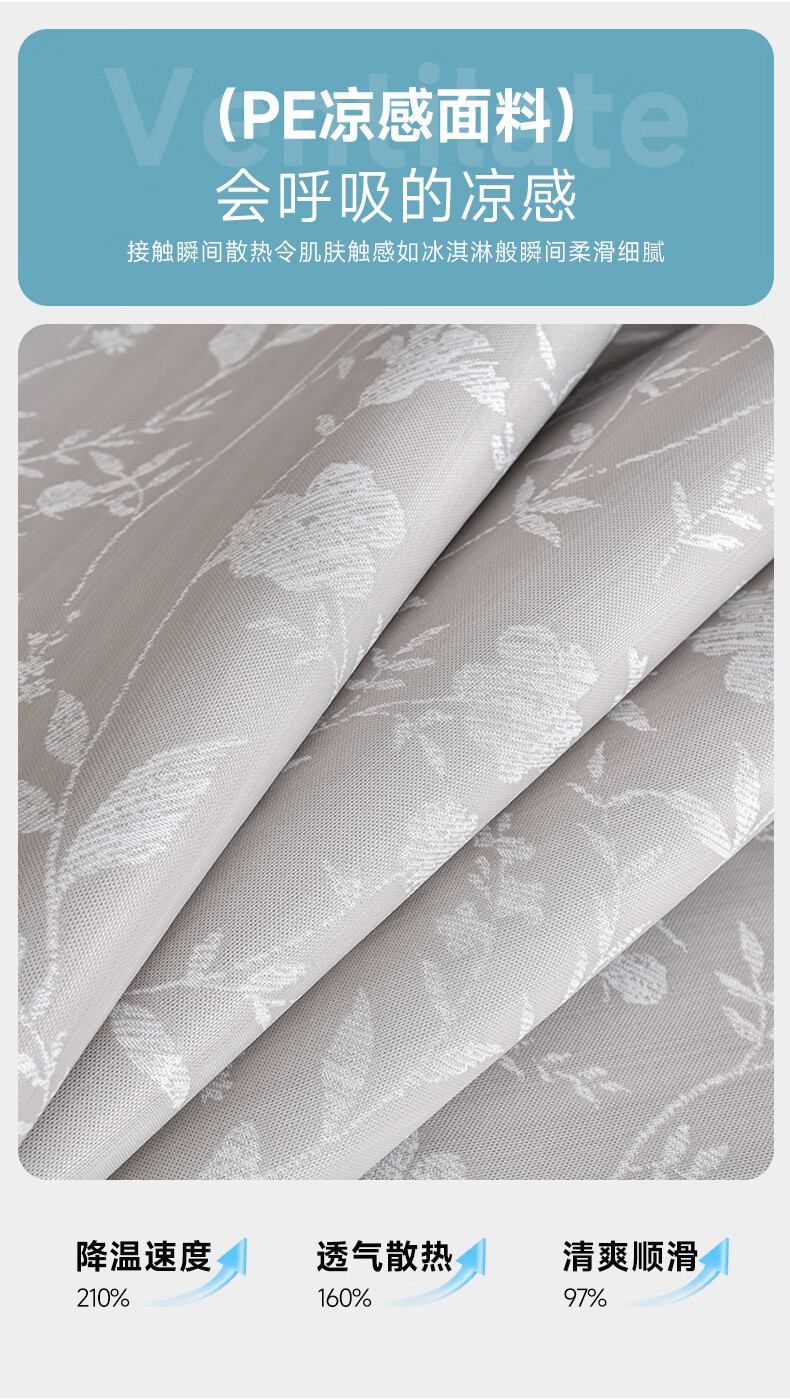 表层采用PE 凉感纤维,凉感系数拉满,肌肤接触瞬;底层升级蜂窝透气网布,360° 循环透气,快速排湿;底层防滑设计,铺床不打滑、不位移