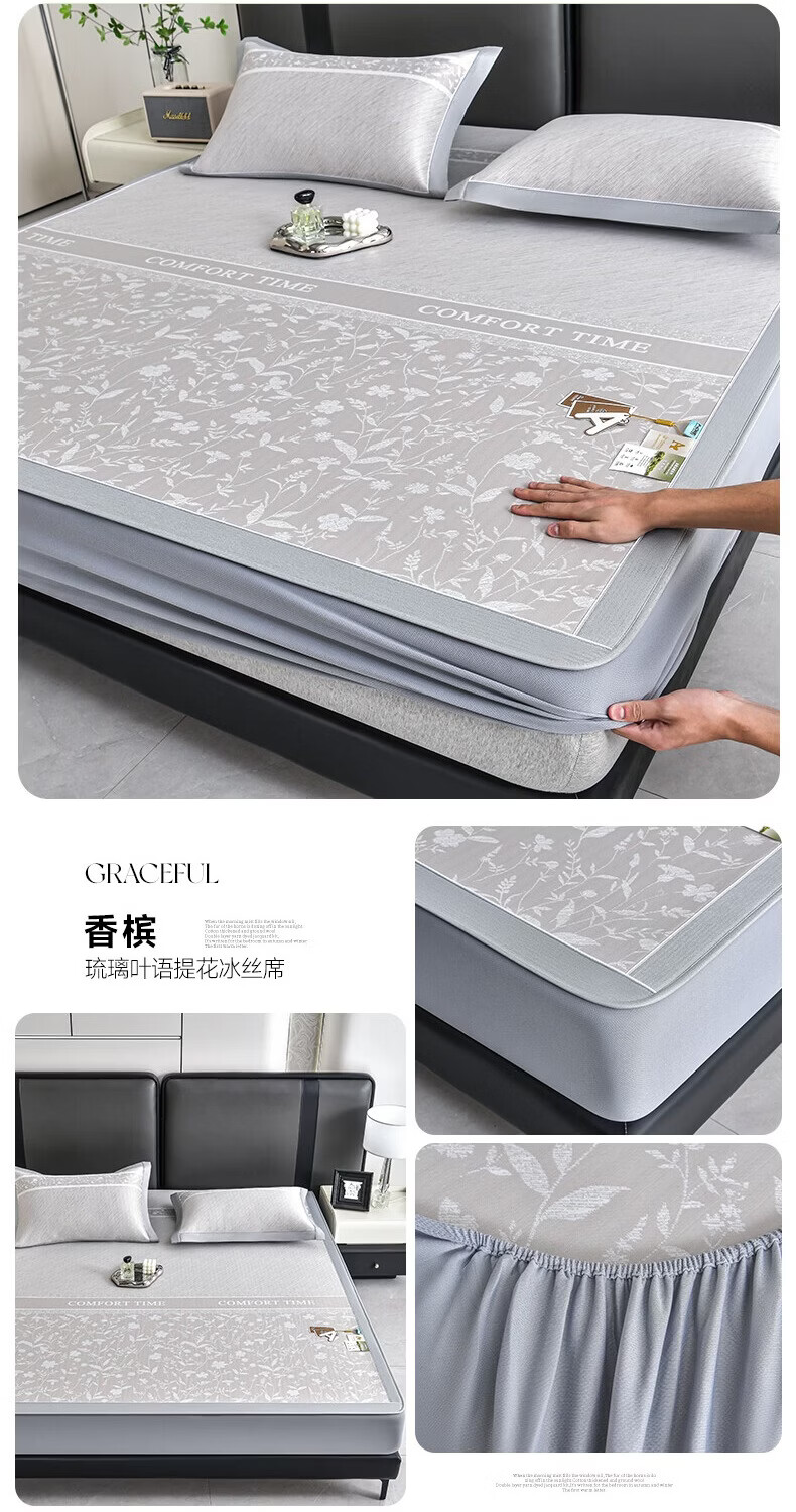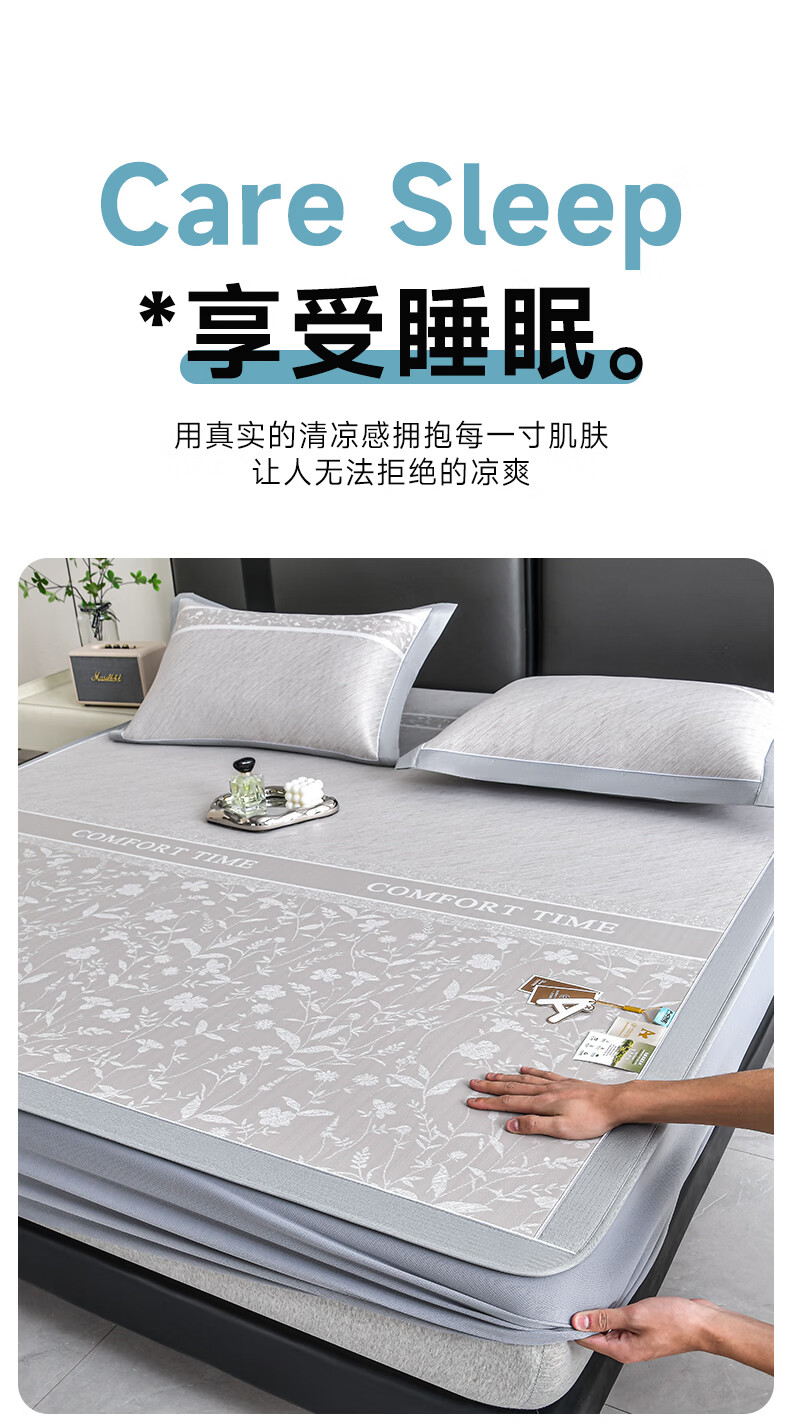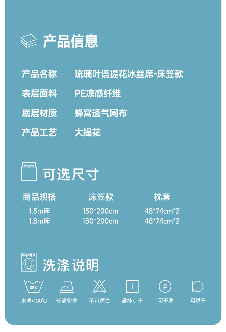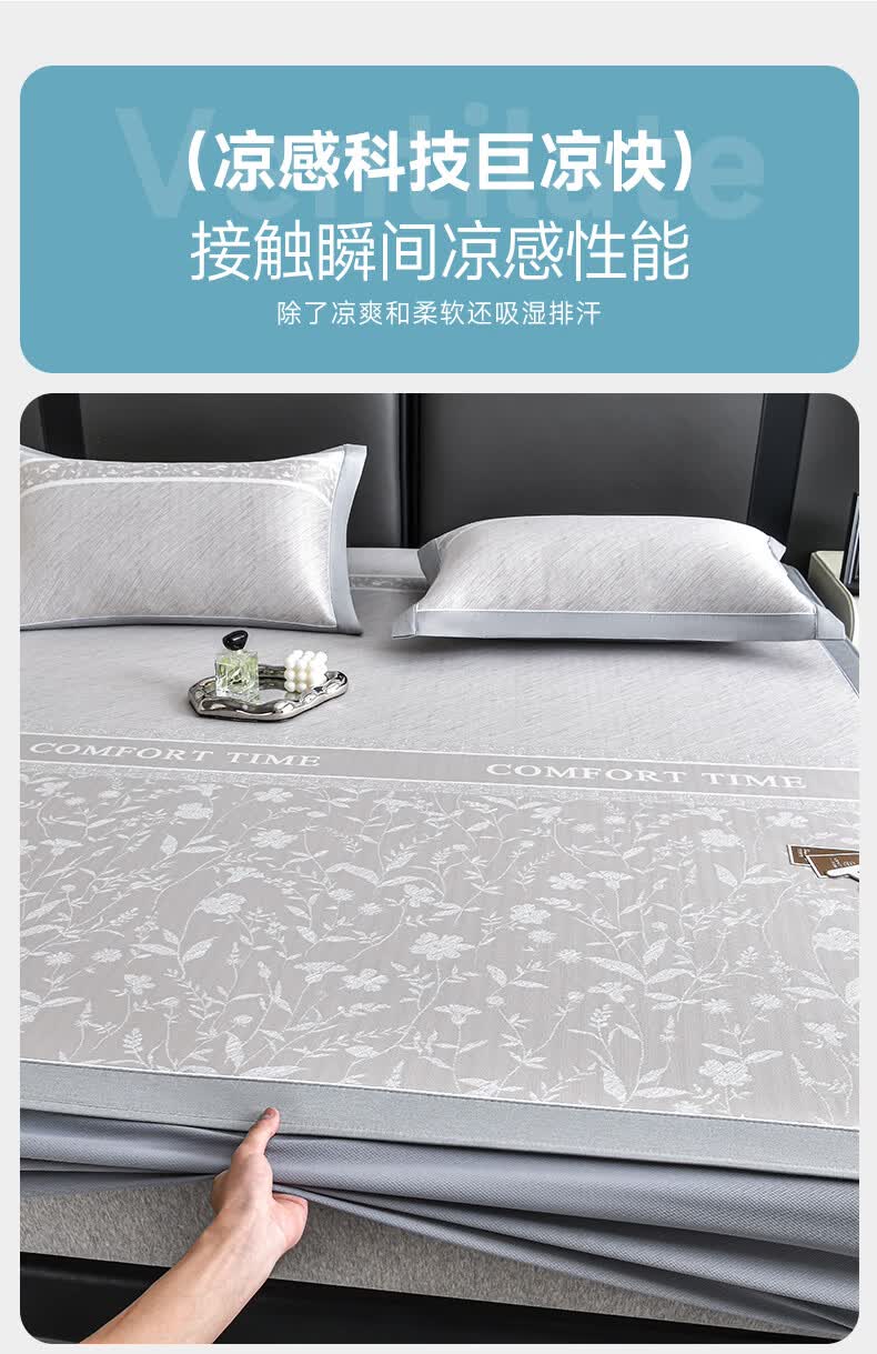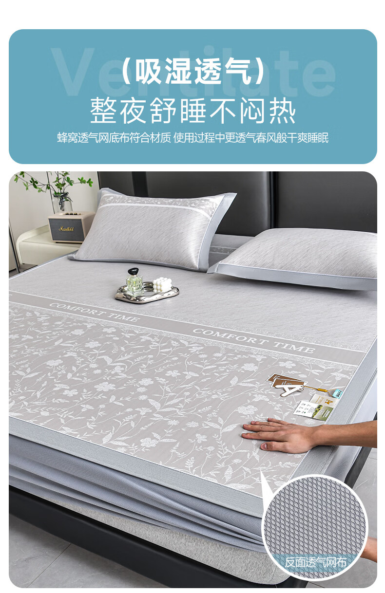 表层采用PE 凉感纤维,凉感系数拉满,肌肤接触瞬;底层升级蜂窝透气网布,360° 循环透气,快速排湿;底层防滑设计,铺床不打滑、不位移