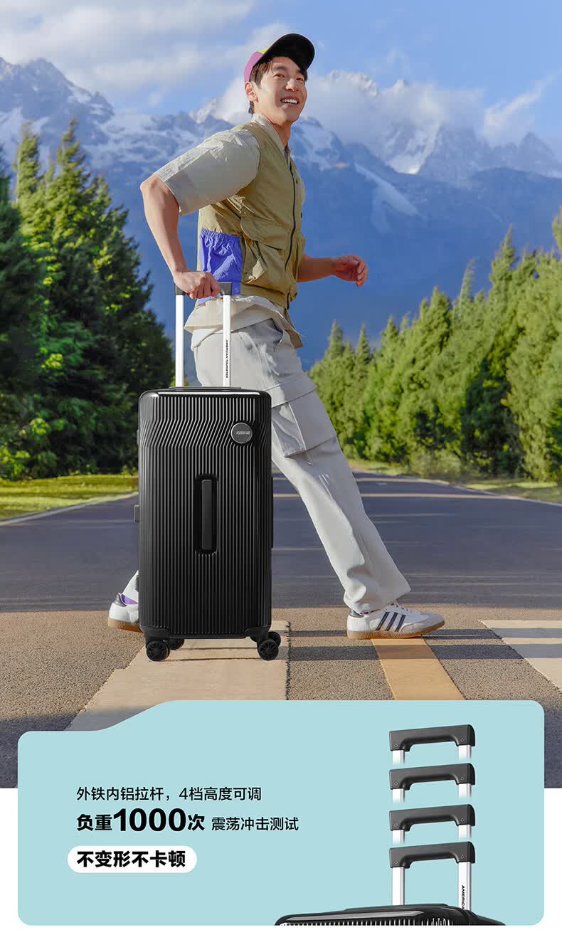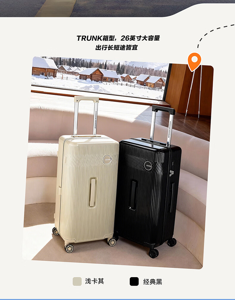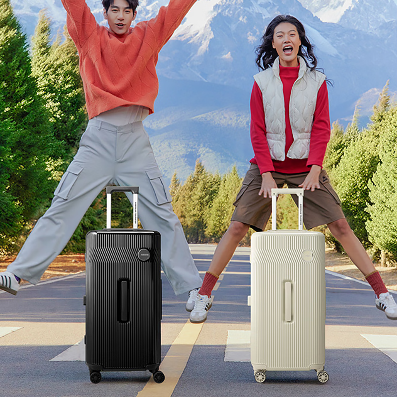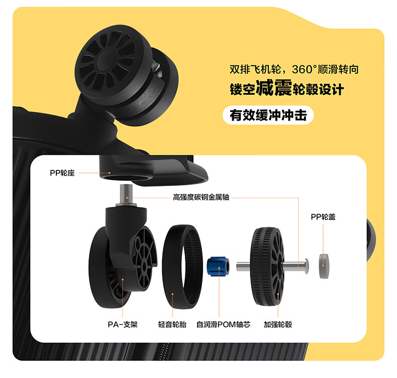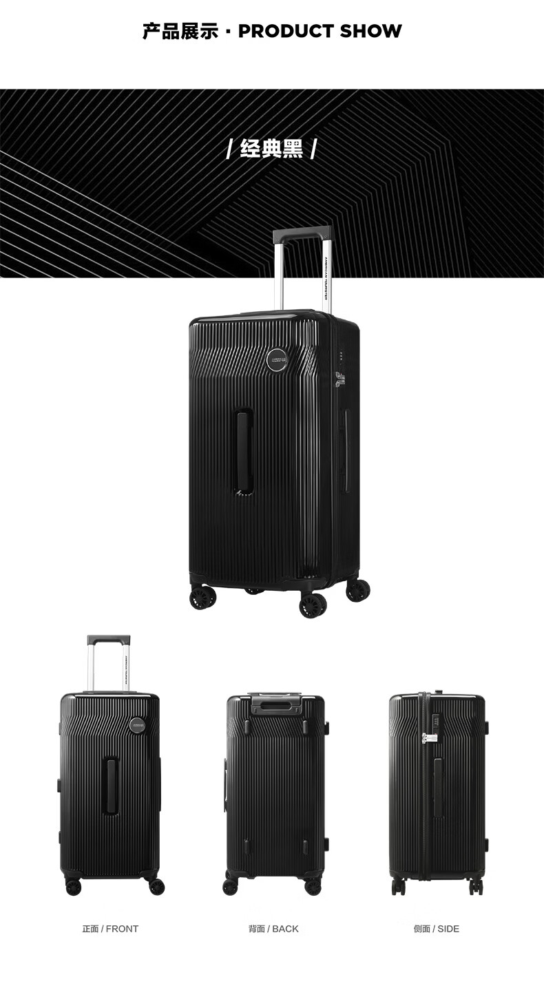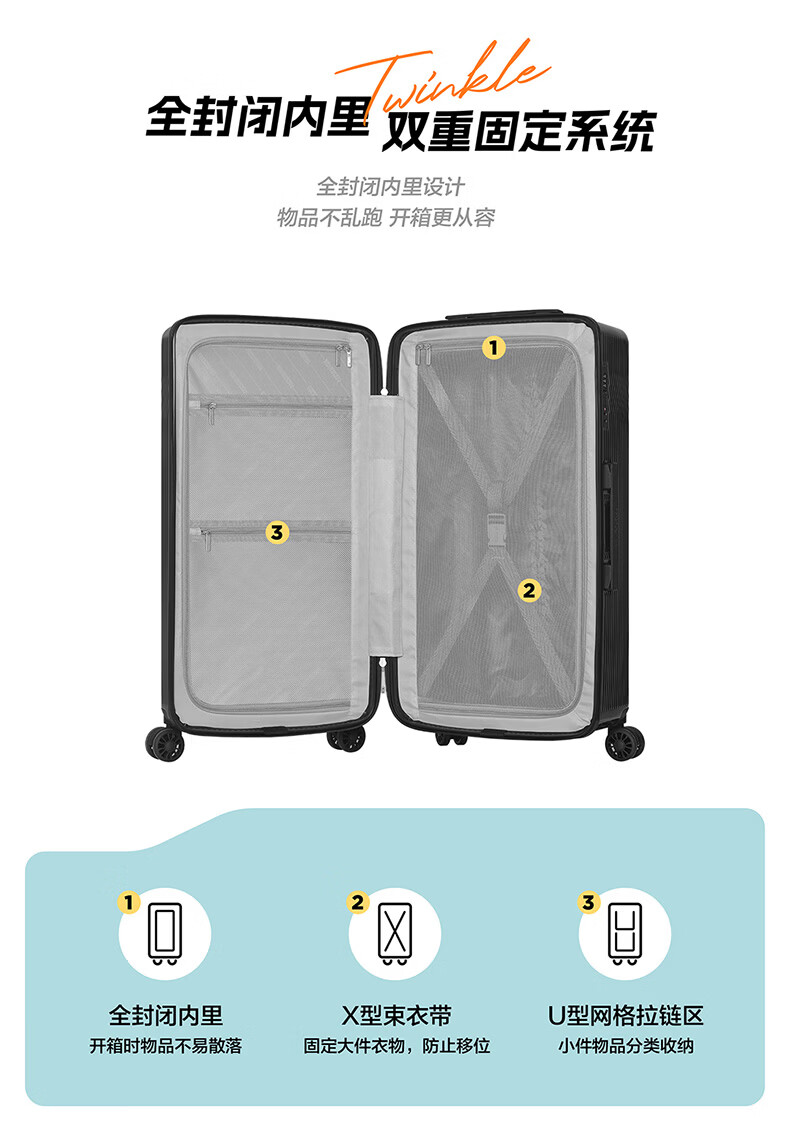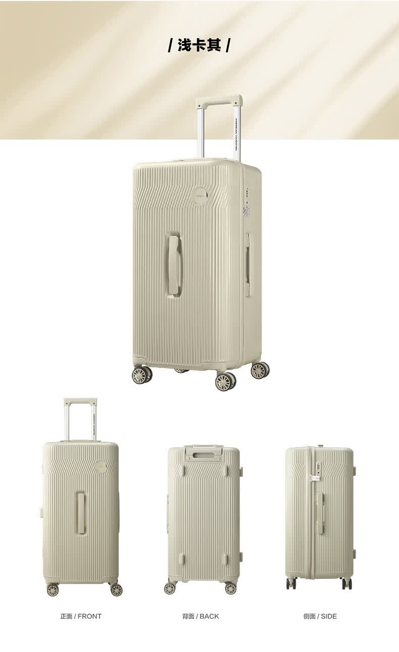 精选PC材质,竖条纹设计;双排飞机轮,360顺滑转向;全封闭内里,物品不乱跑,开箱更从容