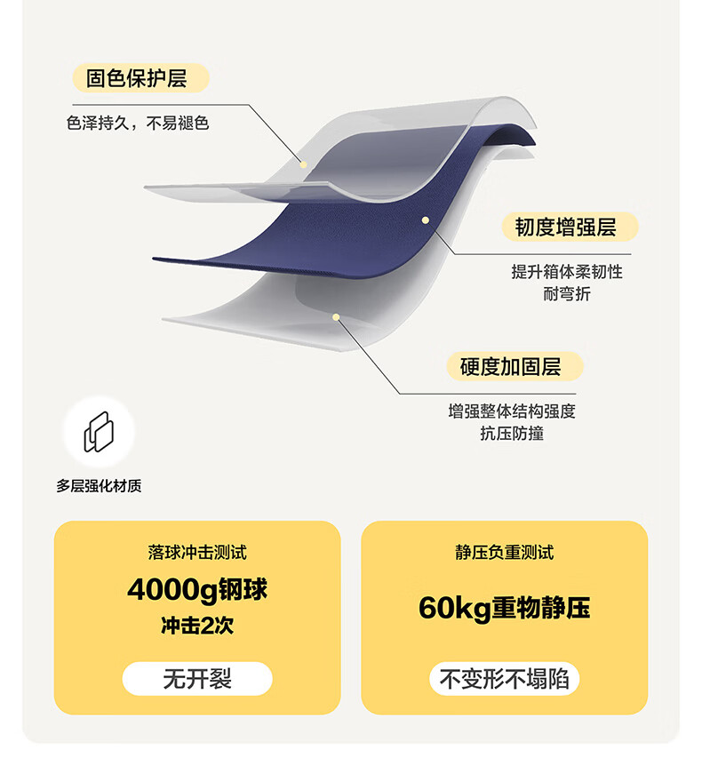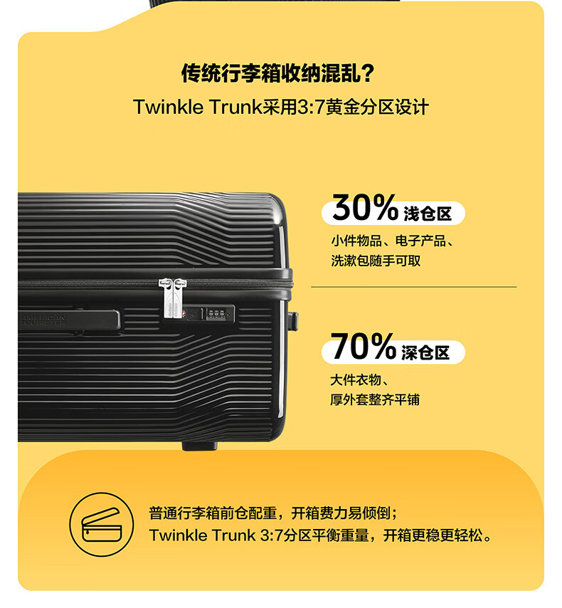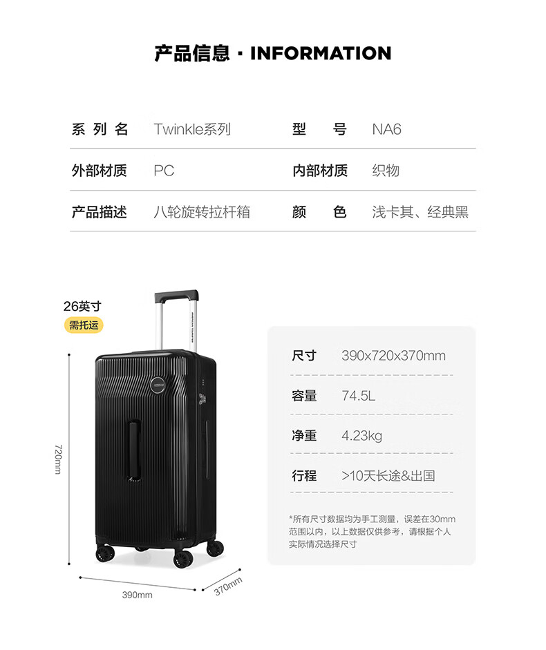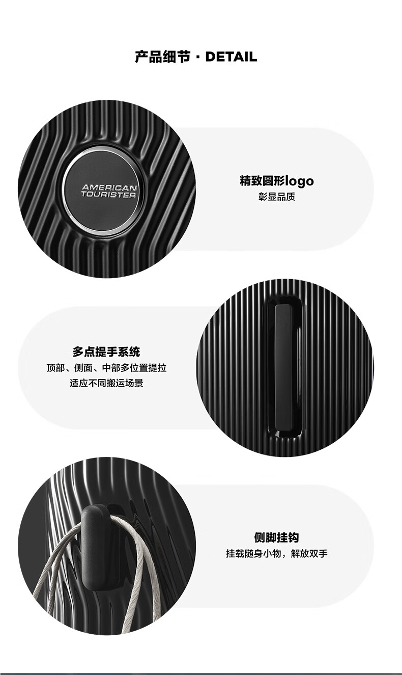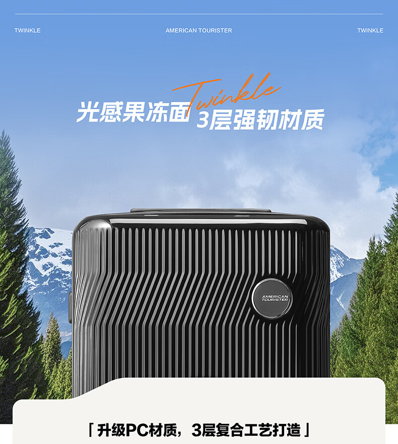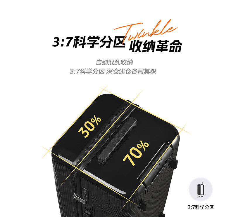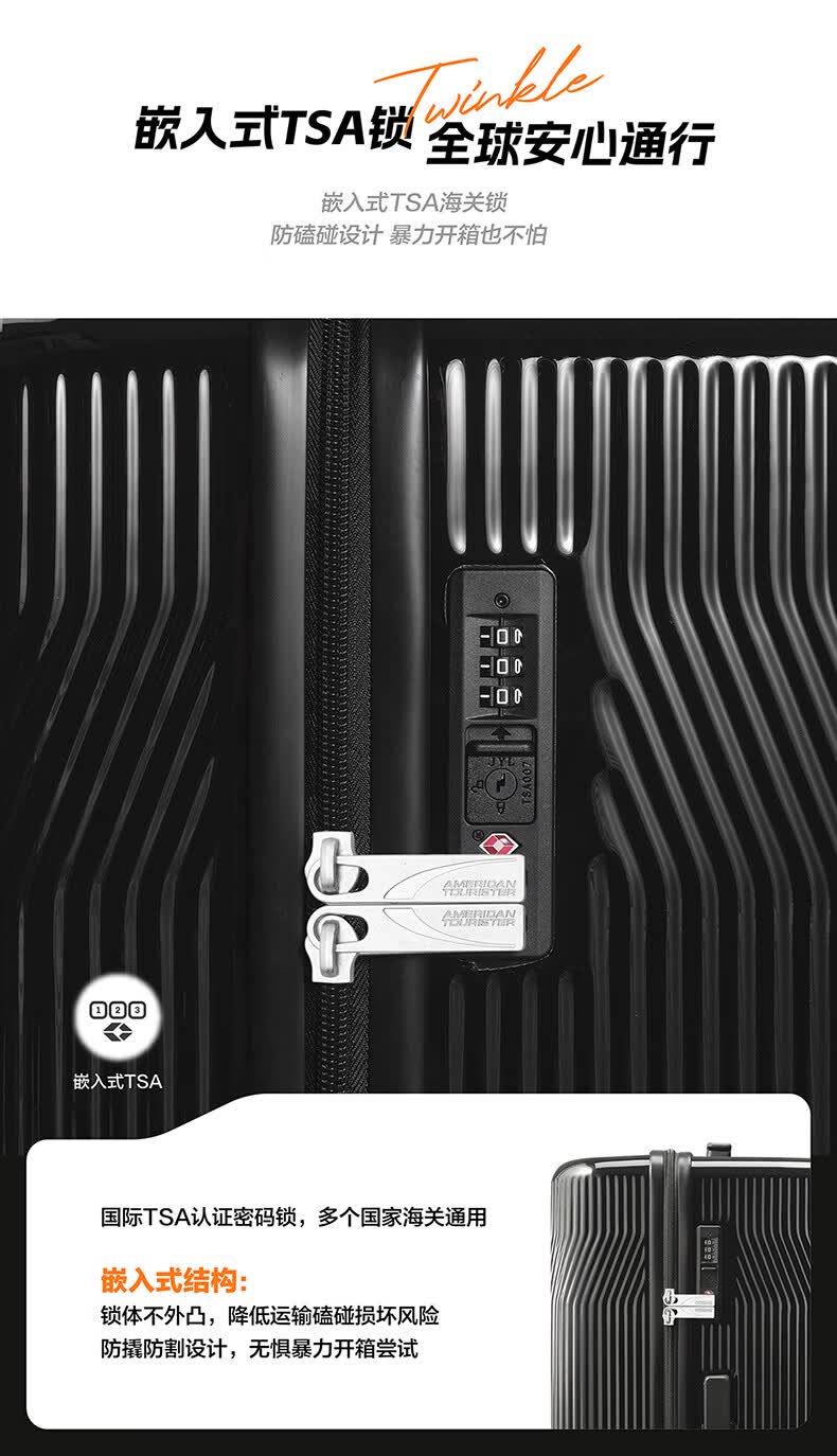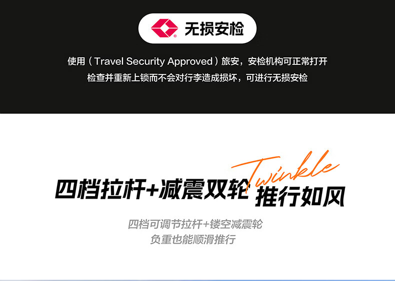 精选PC材质,竖条纹设计;双排飞机轮,360顺滑转向;全封闭内里,物品不乱跑,开箱更从容