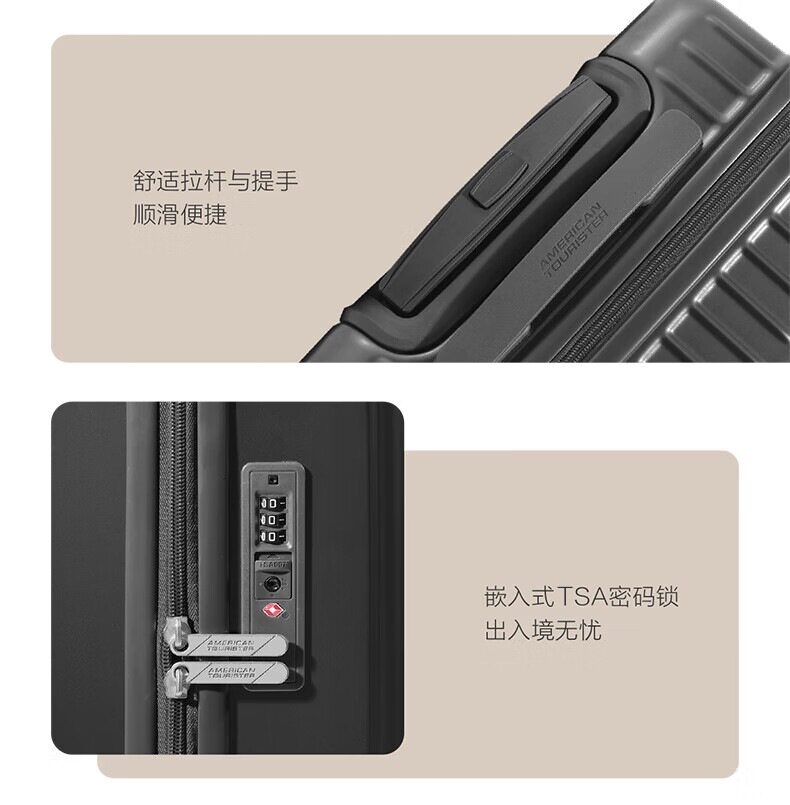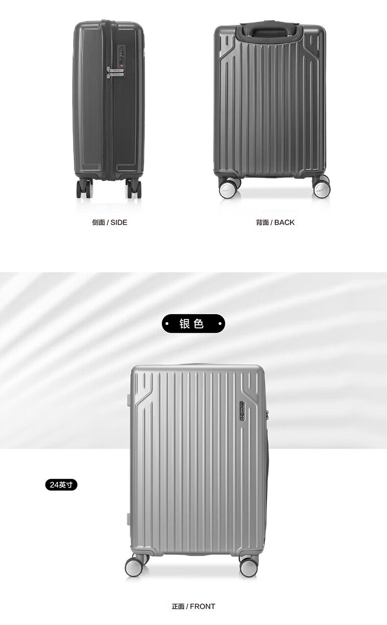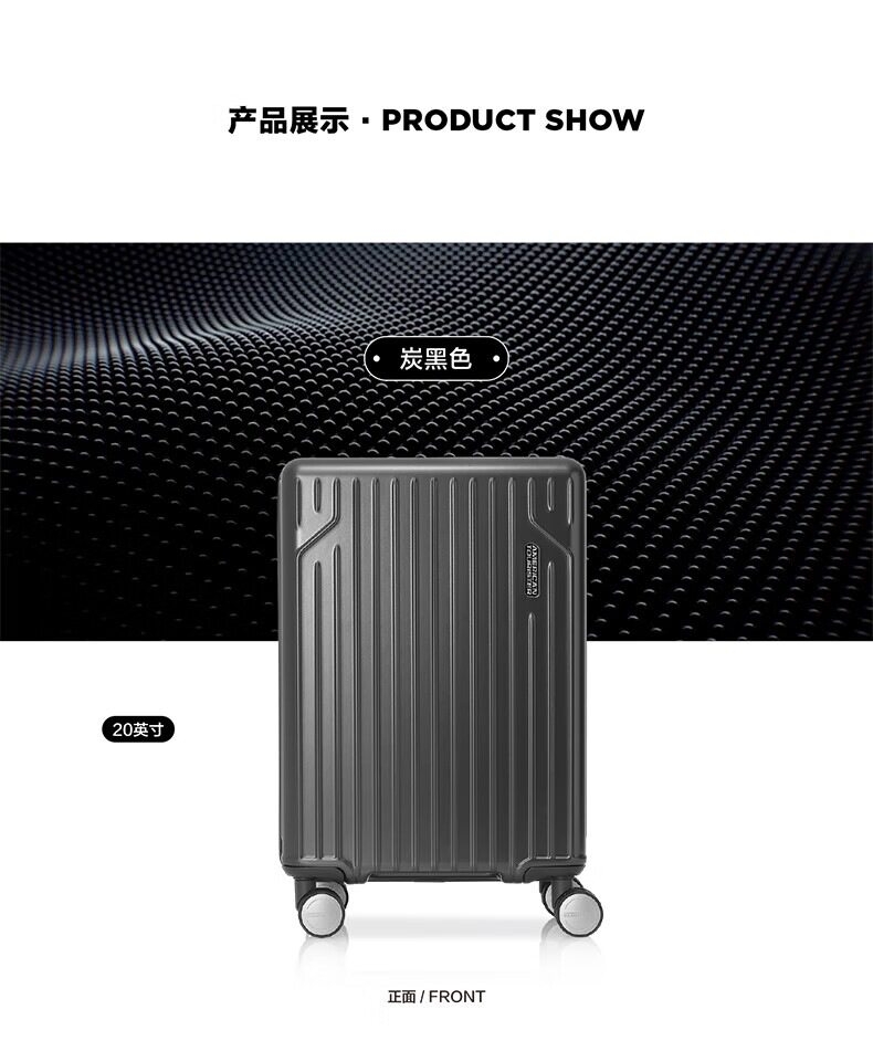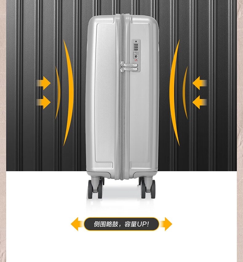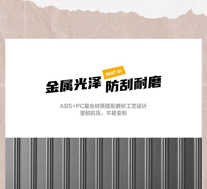 简约条纹设计,呈现金属光泽且防刮耐磨;ABS+PC复合材质搭配磨砂工艺,坚韧抗压;小圆角造型,贴合箱内轮廓,容纳更多的物品